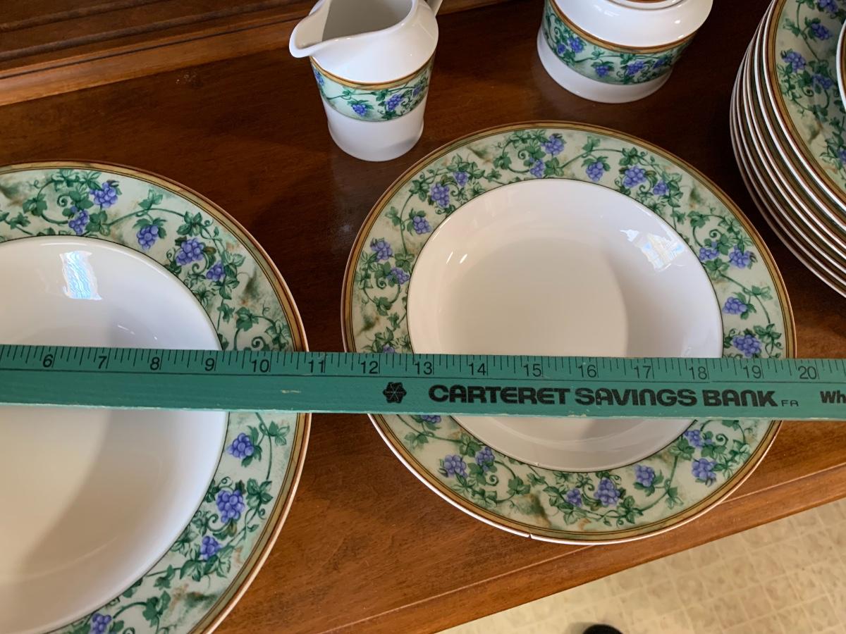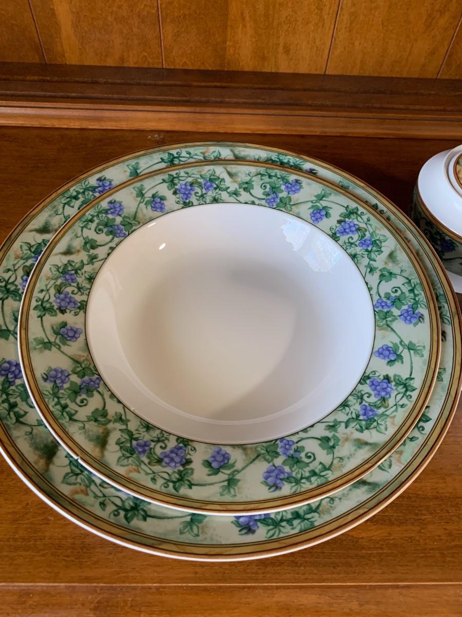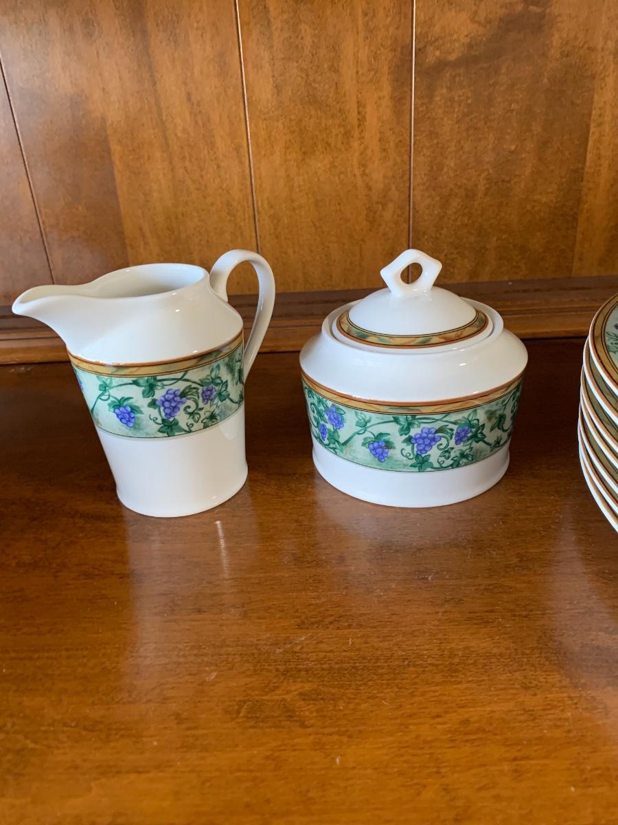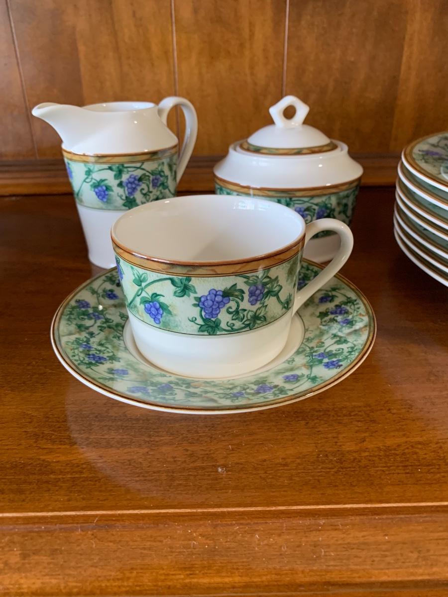 CHambord by Christopher Stuart. Grapes & Vines On Green Marbelized Rim, Cups with saucers, dinner plates, salad plates and bowls for 6 including sugar bowl and creamer set.
