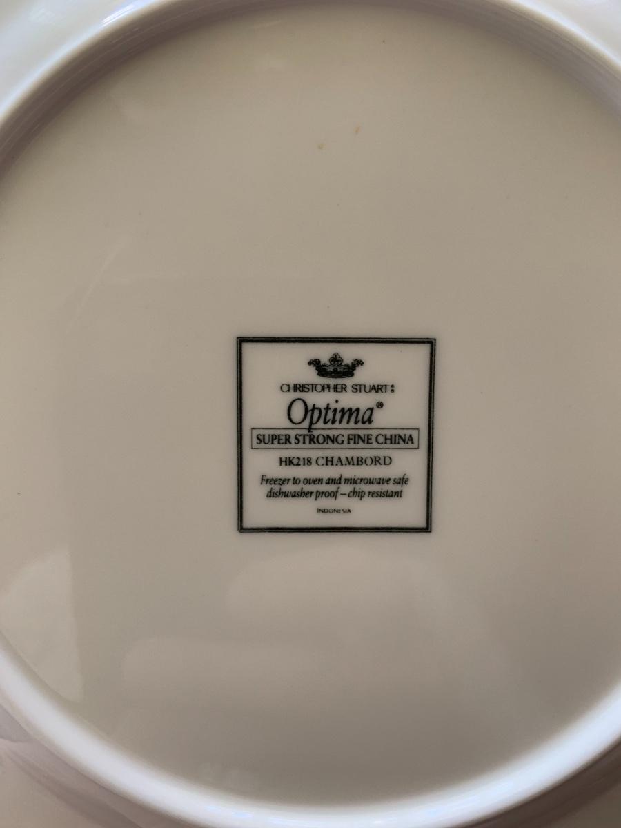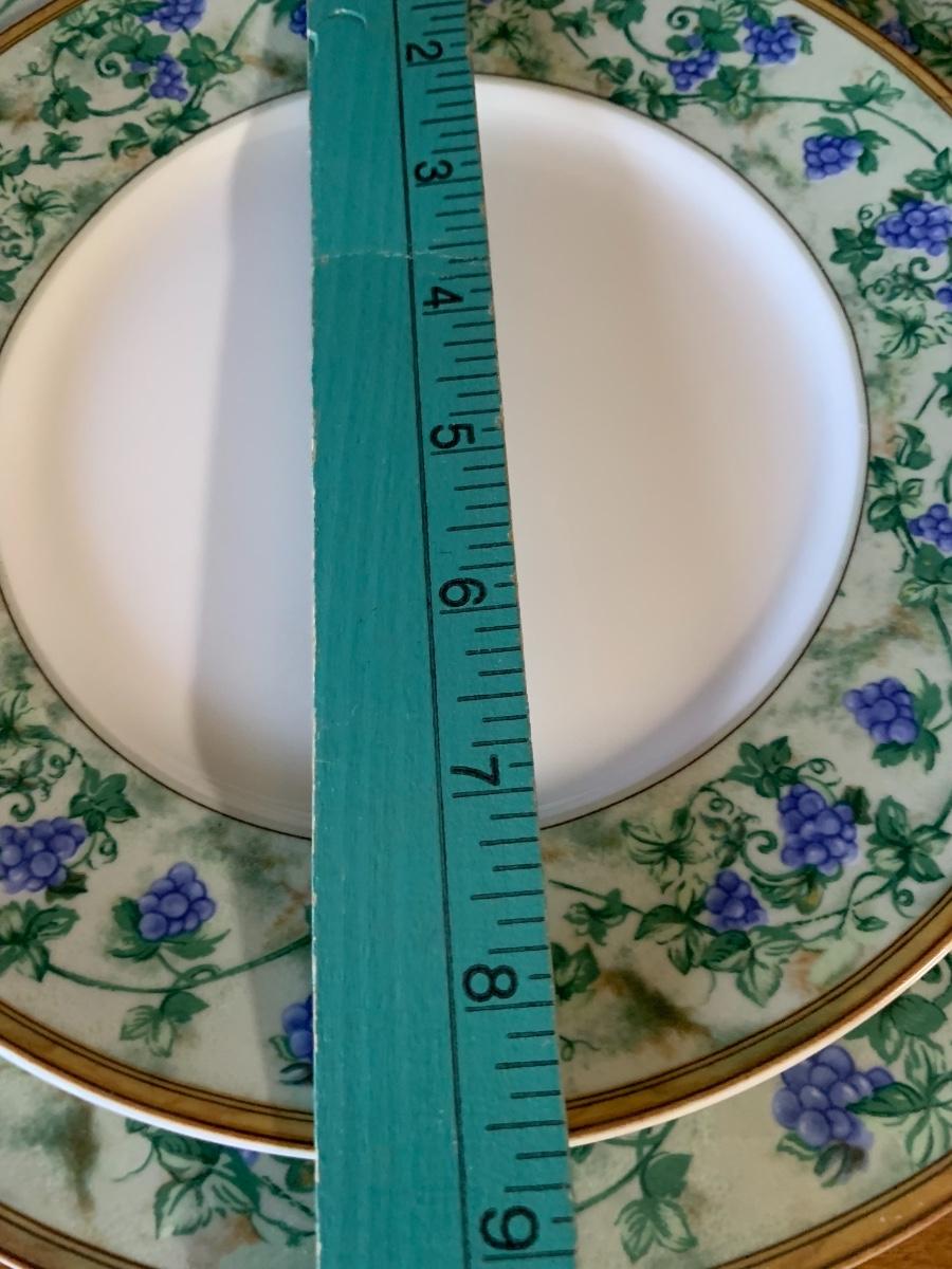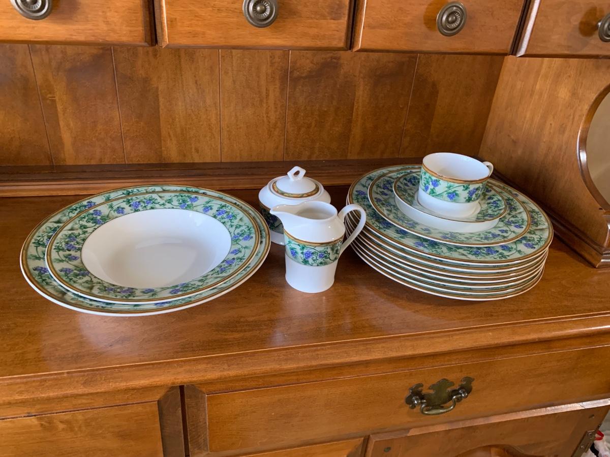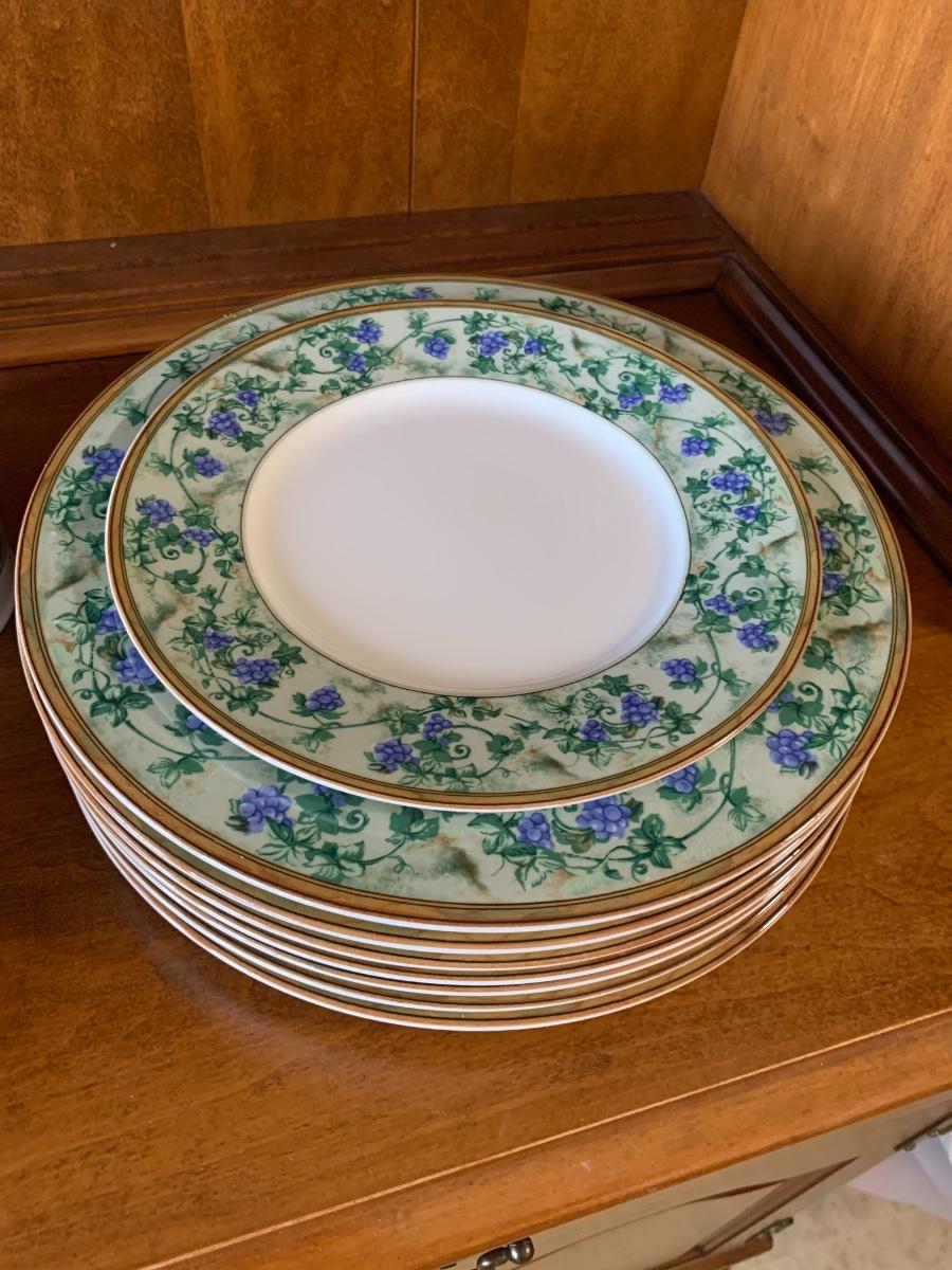 CHambord by Christopher Stuart. Grapes & Vines On Green Marbelized Rim, Cups with saucers, dinner plates, salad plates and bowls for 6 including sugar bowl and creamer set.