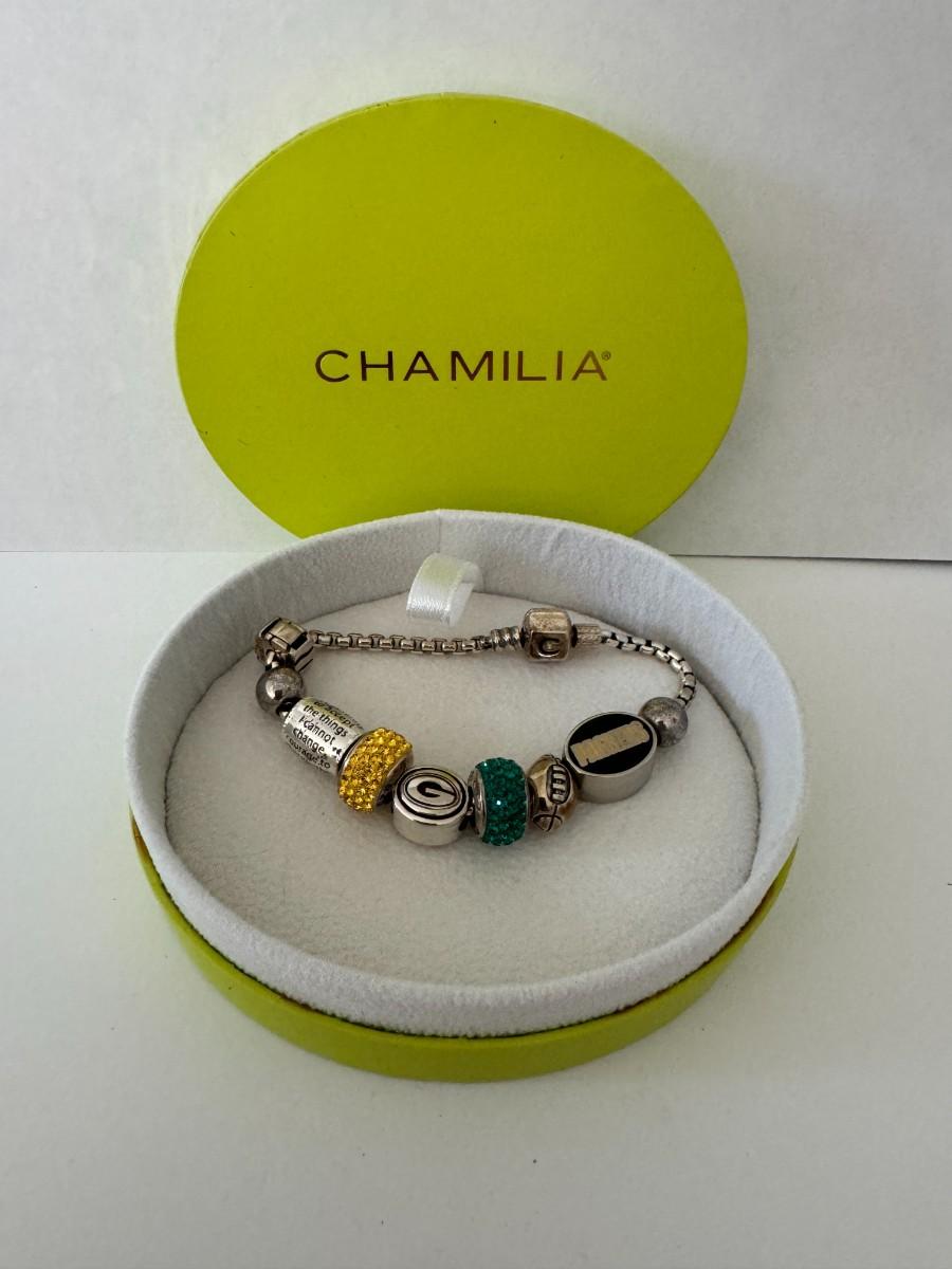 Chamilia Charm Bracelet with various charms. These include Green Bay Packers-themed charms and an inspirational charm with the words "the things I cannot". The bracelet is displayed in a round, lime green Chamilia box.