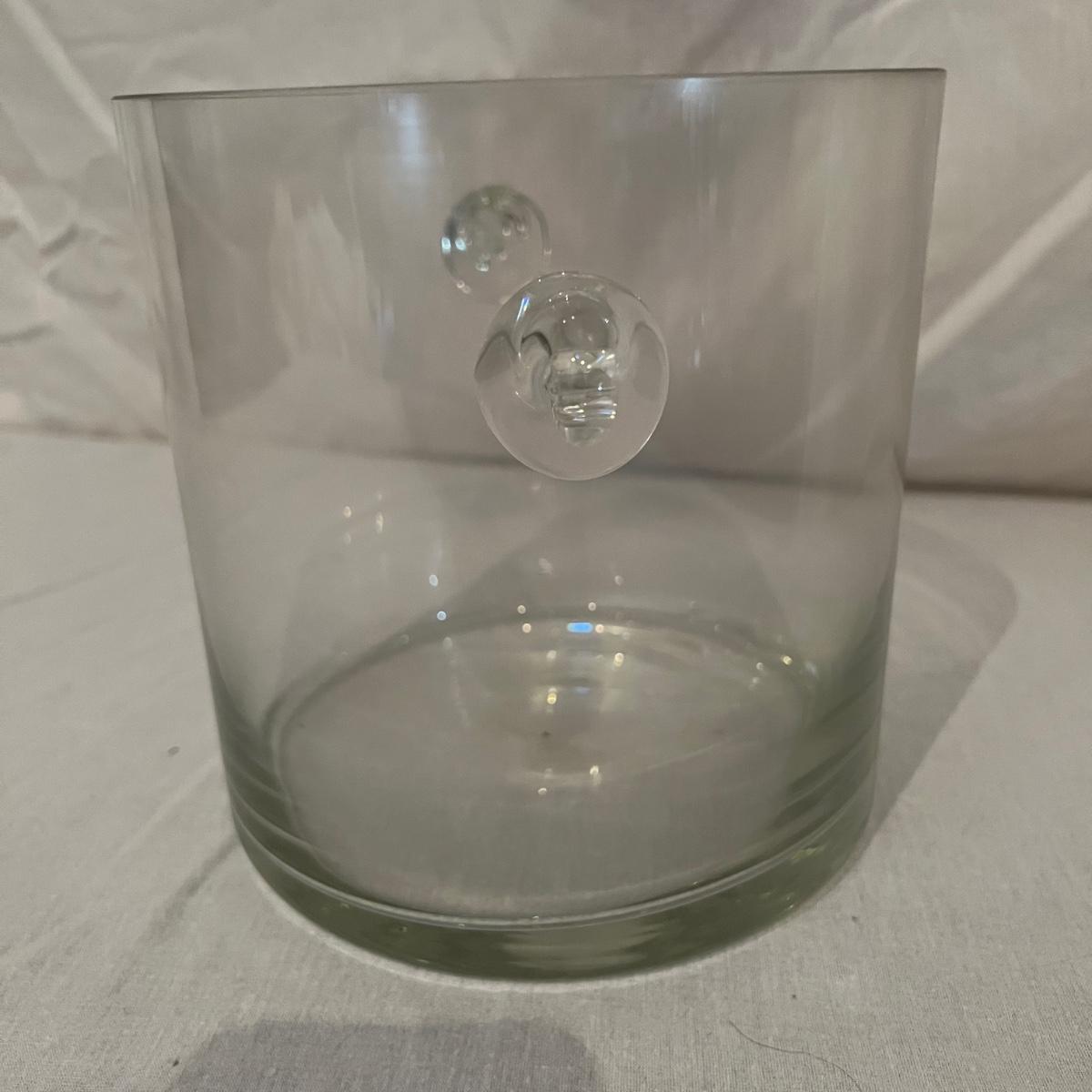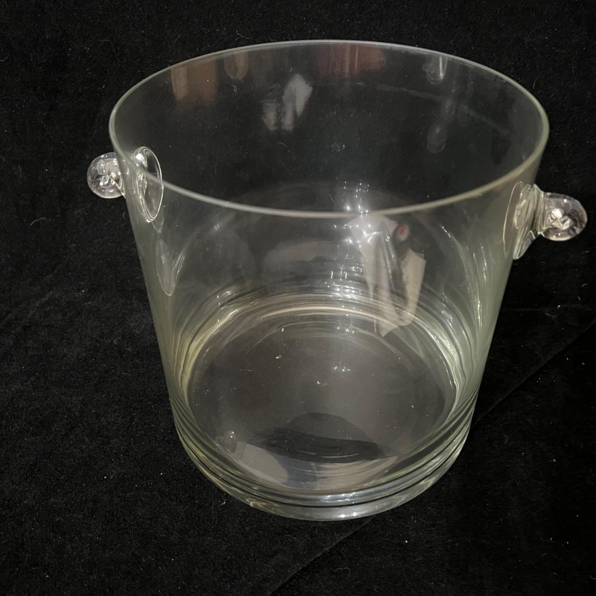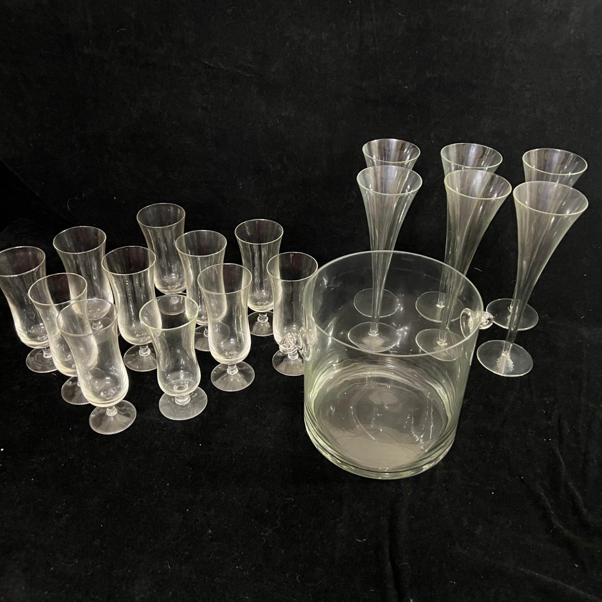Two types of champagne glasses. 6 fluted and 11 parfait style. The six tall fluted glasses are 3.25”D x 9.25”H. The 11 parfait style glasses are 2.5”D x 6.25”H. The handled glass ice bucket is 7.5”D x 7.5”H. Items could use a good cleaning, but appear to be in good condition. Shipping available.