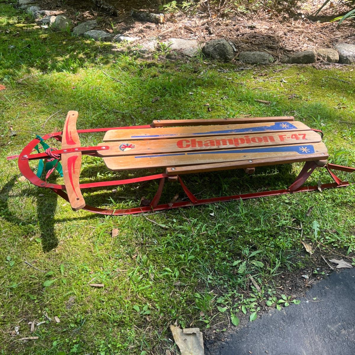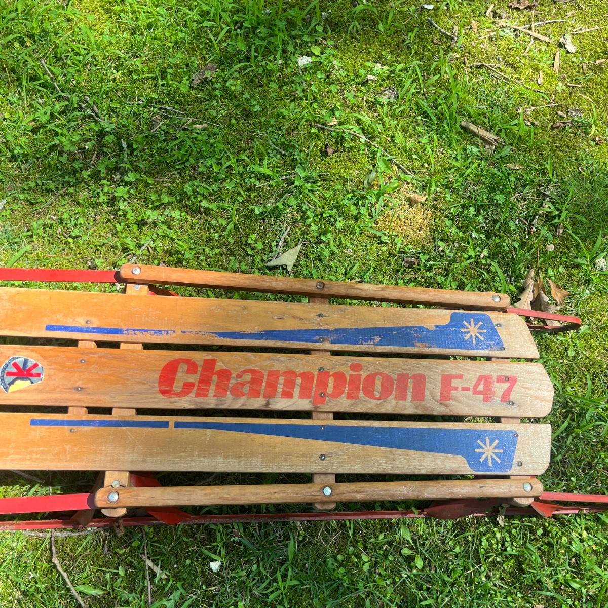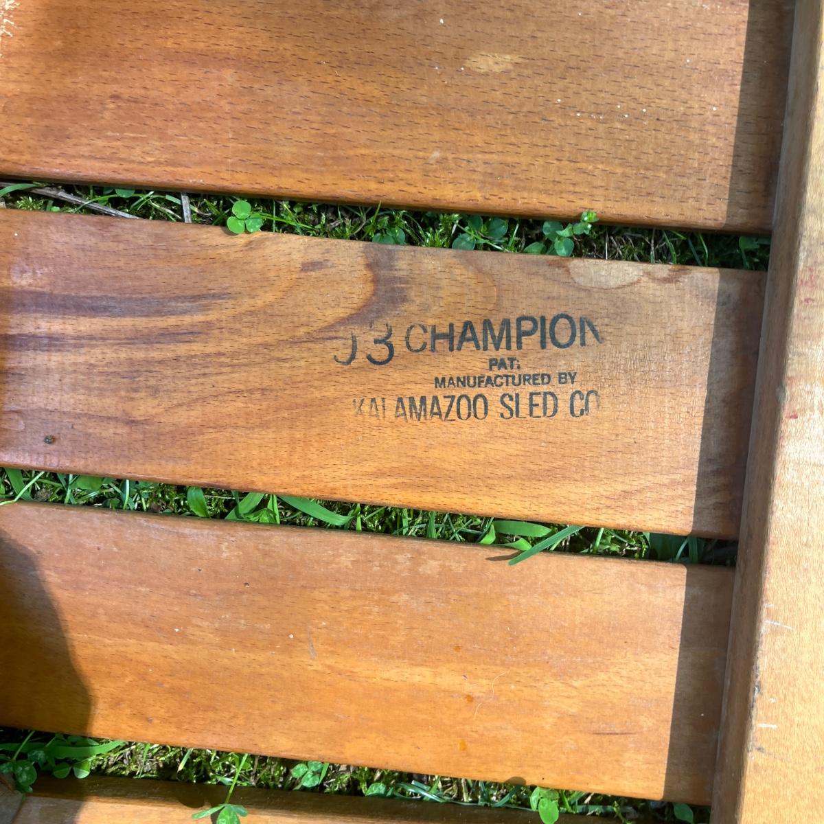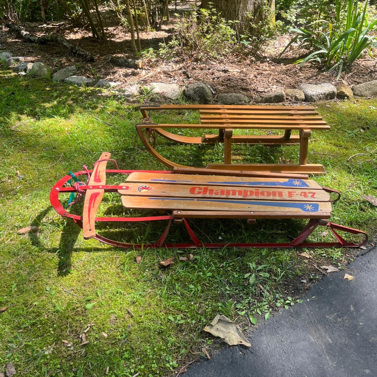 Lot includes a Champion F-47 wood and metal sled and an unmarked wooden sled with metal braces and runners. Champion sled measures 48” x 13” x 6.5”H.
