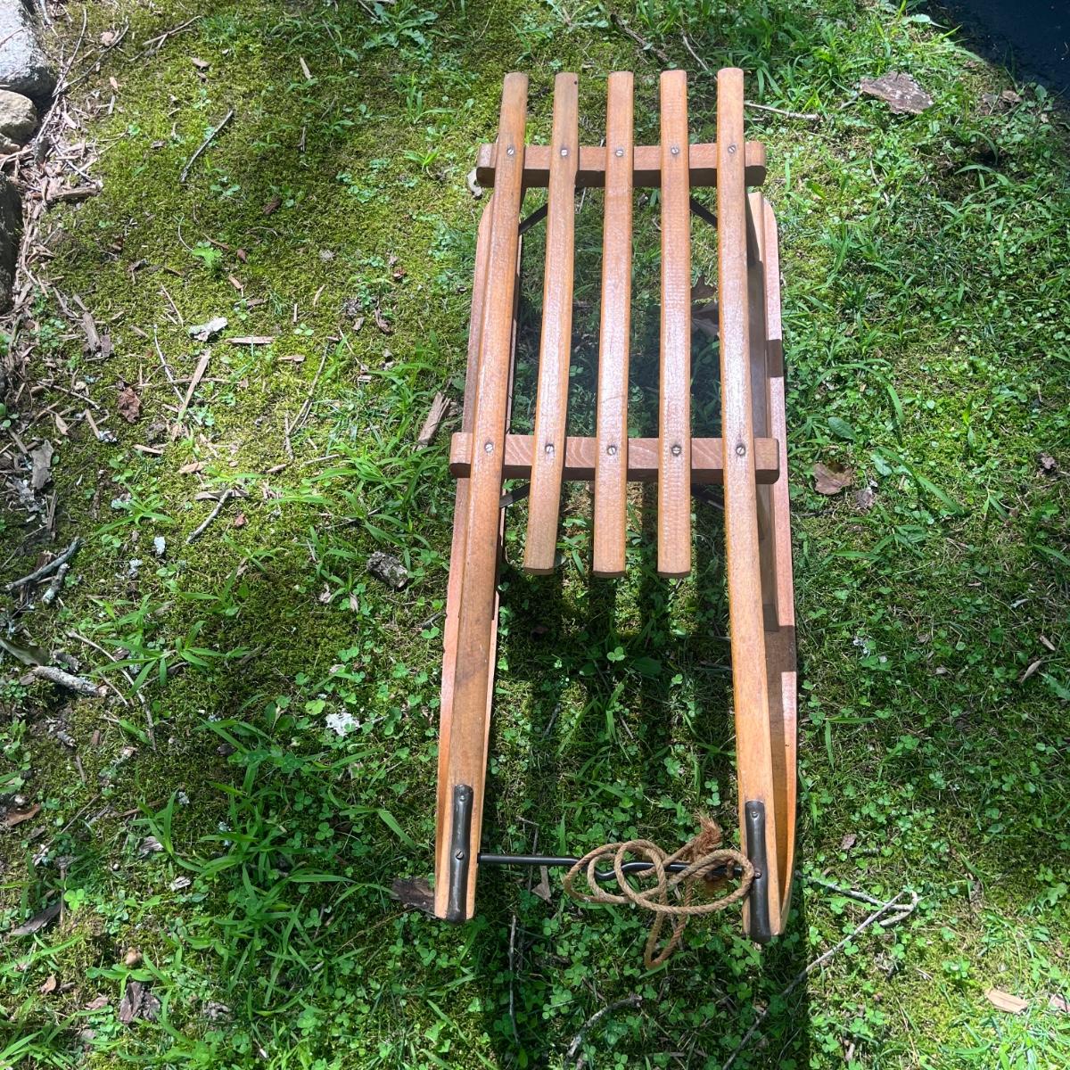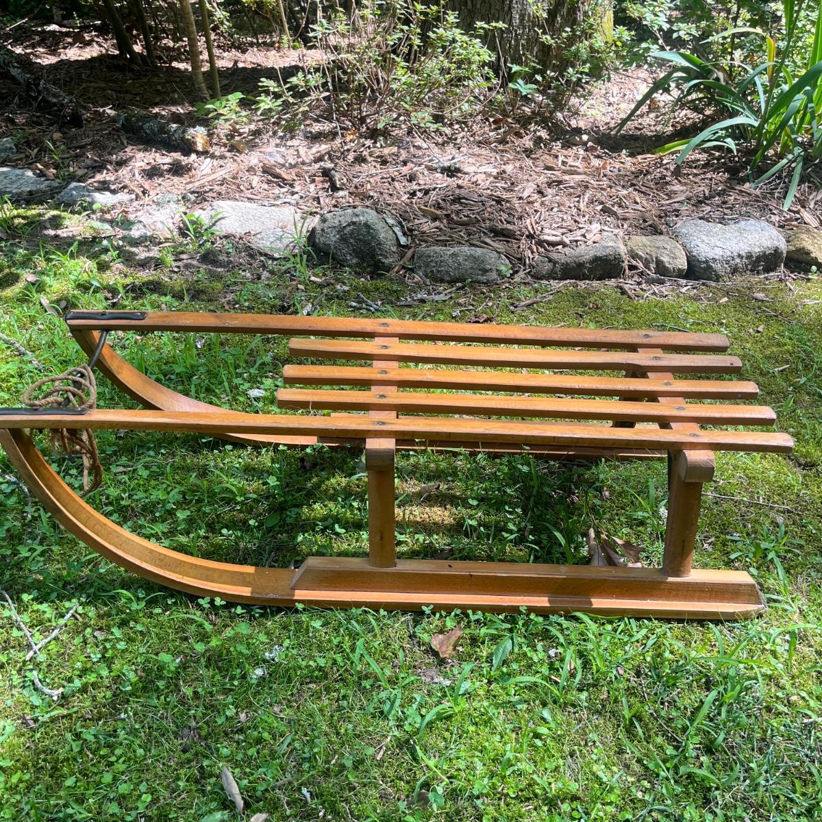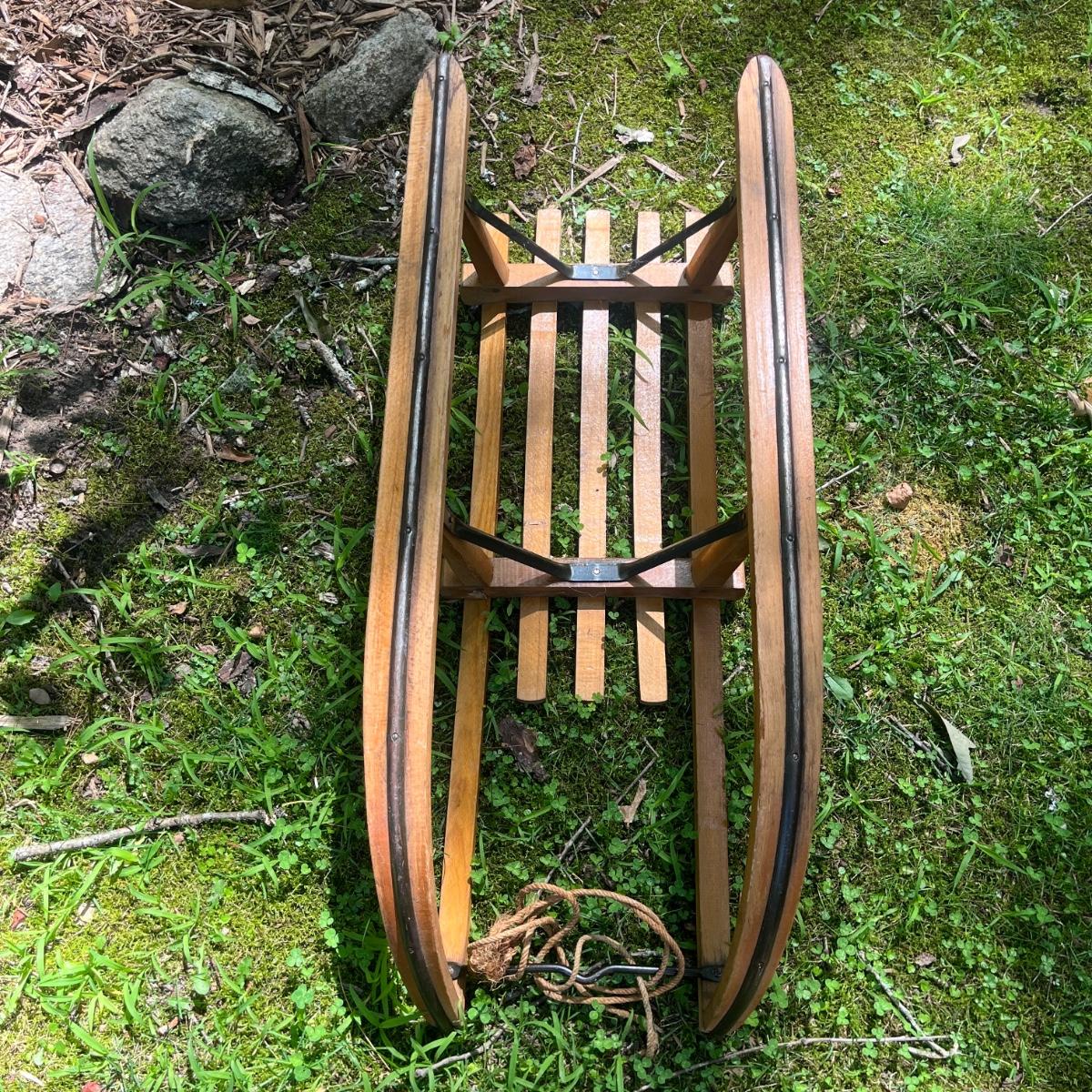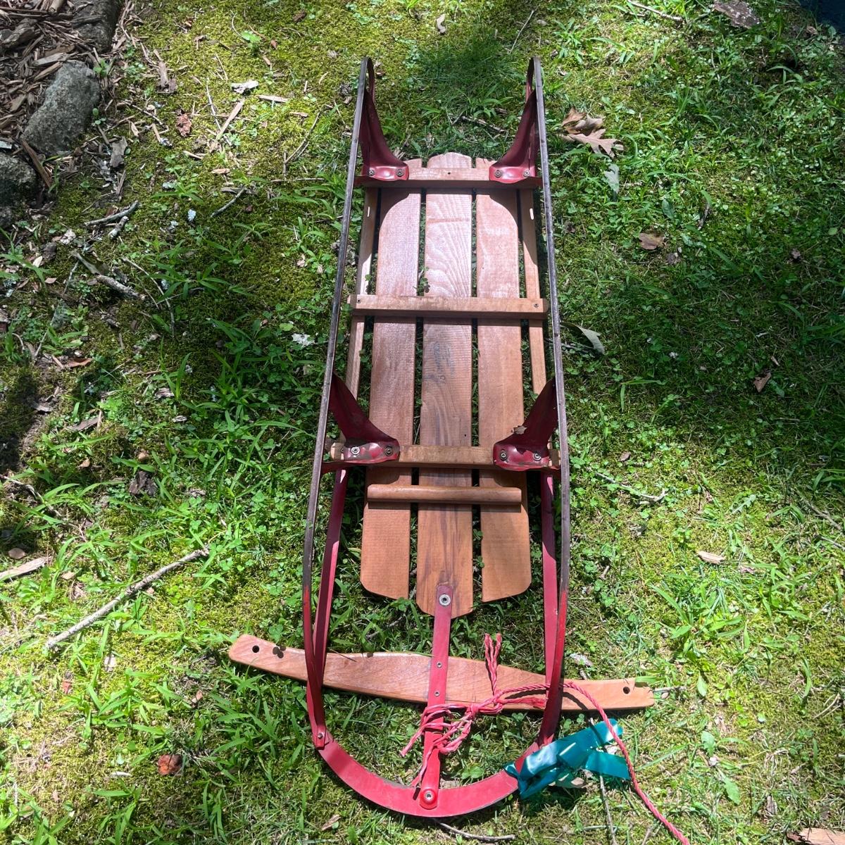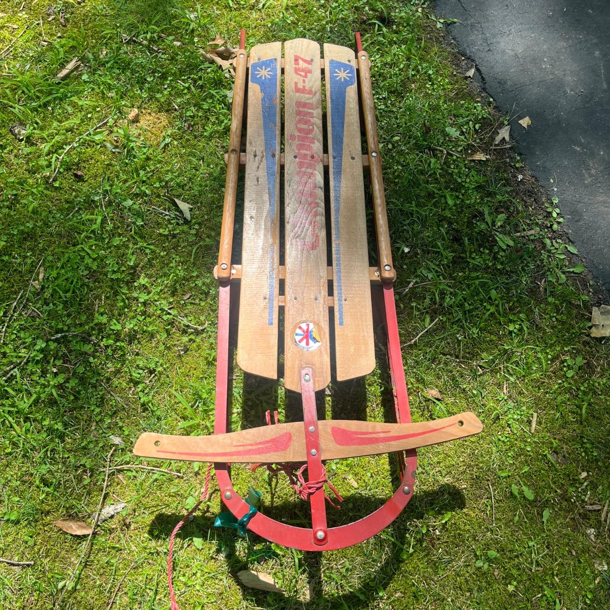 Lot includes a Champion F-47 wood and metal sled and an unmarked wooden sled with metal braces and runners. Champion sled measures 48” x 13” x 6.5”H.