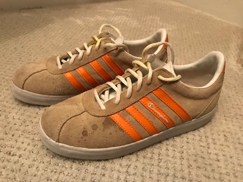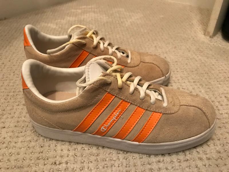 Size 7 Tan suede with orange trim. Good condition with some water stains