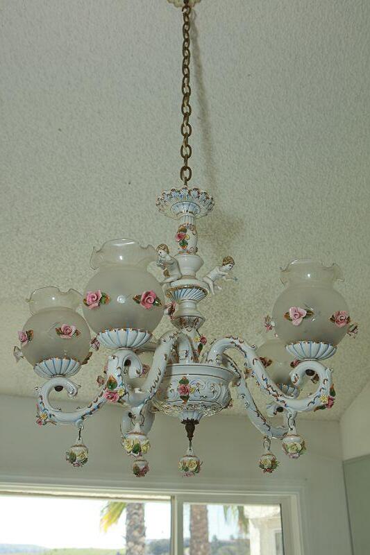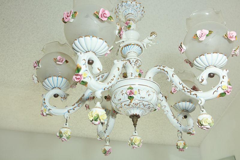 Vintage white porcelain Capodimonte chandelier. Adorn with pink flowers and cherubs. 5 light arms with frosted globes. Looks to be in good condition. It is currently hanging in the estate home and would need to be removed.