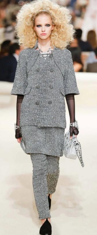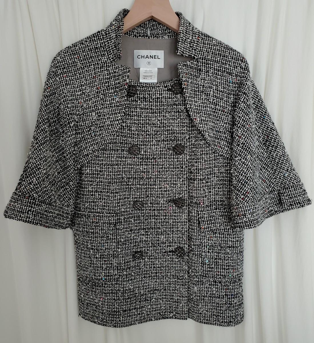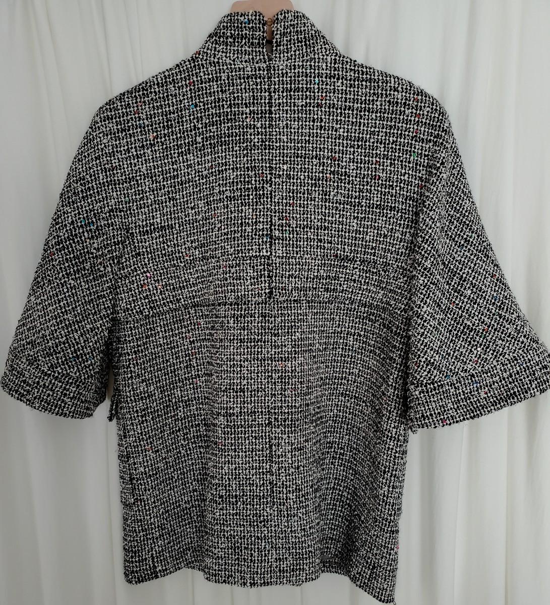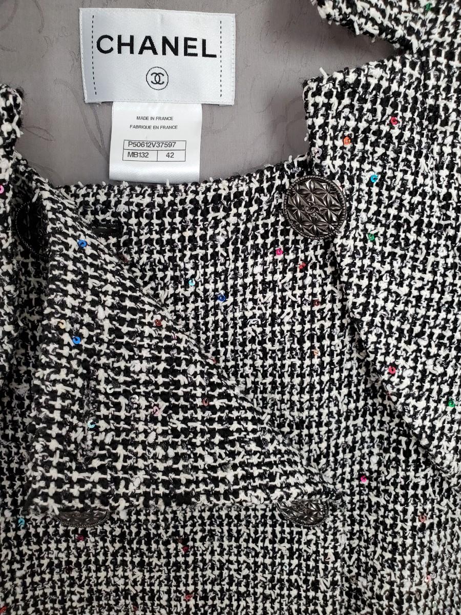 Chanel 2015 Black and white tweed jacket, featured in the 2015 Dubai Runway (look 16). Stand collar, pockets, multicolor sequin embellishments. Logo silk lining and Chanel chain at the hem.