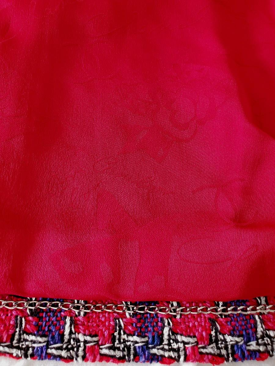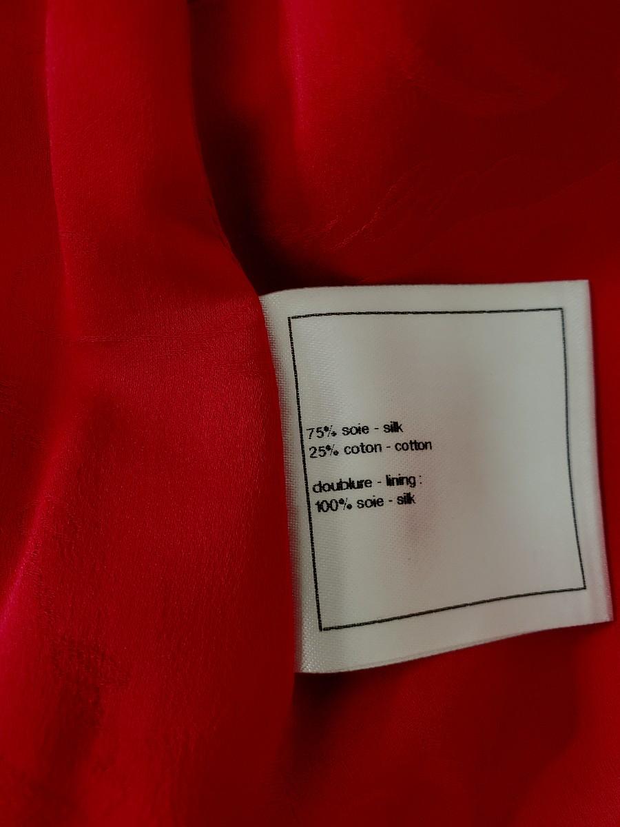 Silk cotton blend with 100% silk logo lining. Chanel chain in hem. Hidden button closure