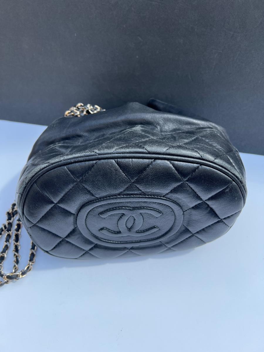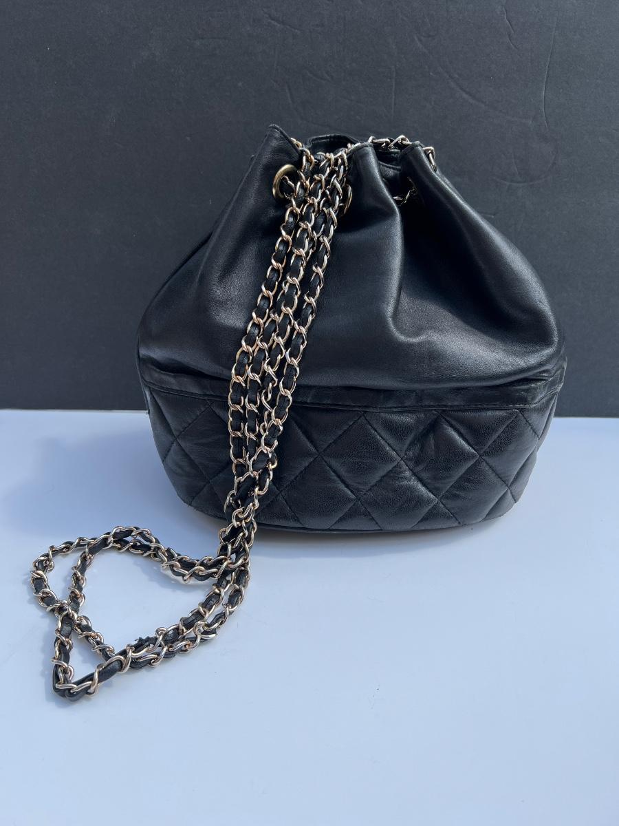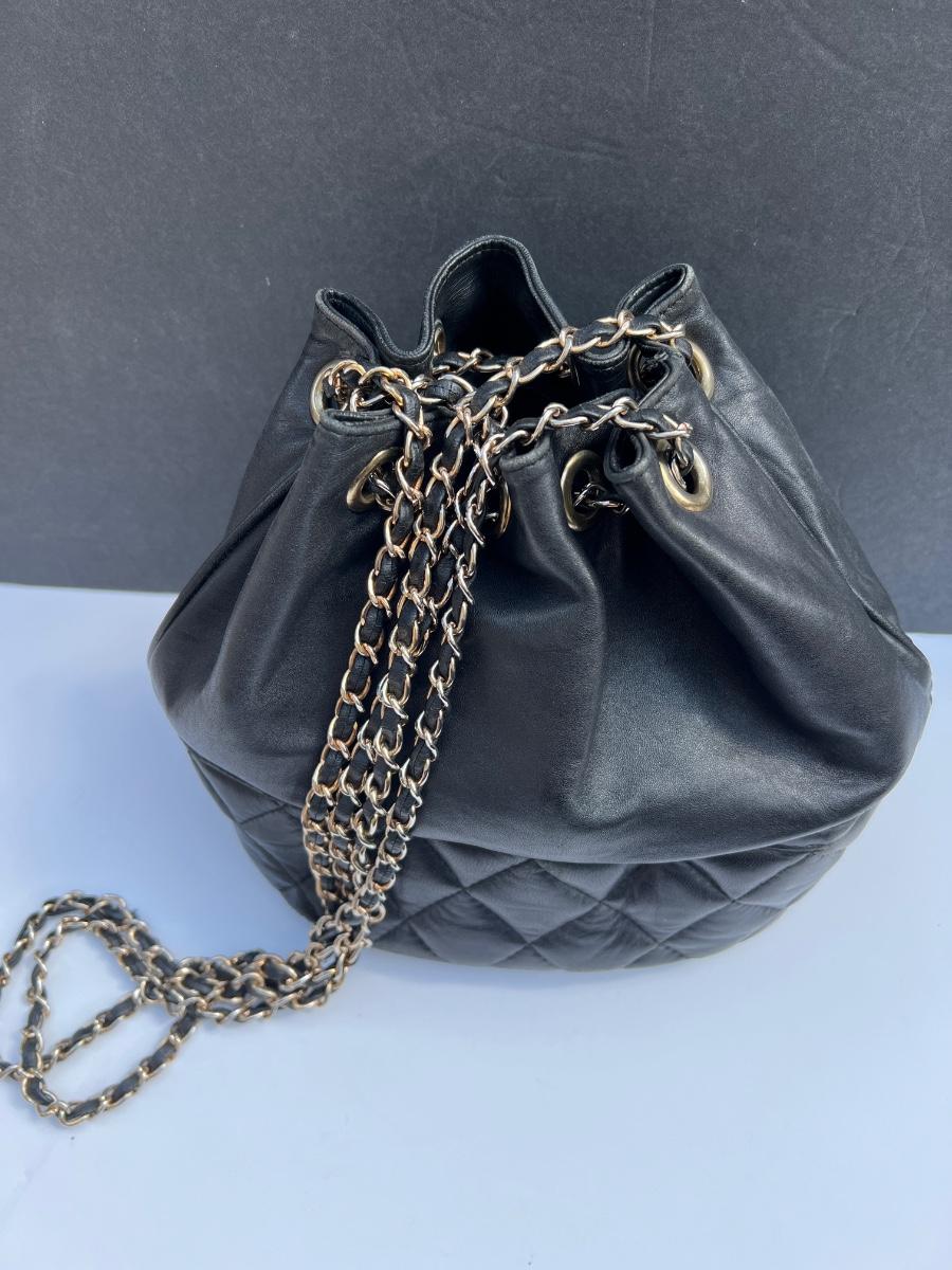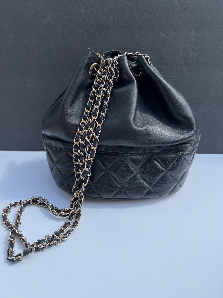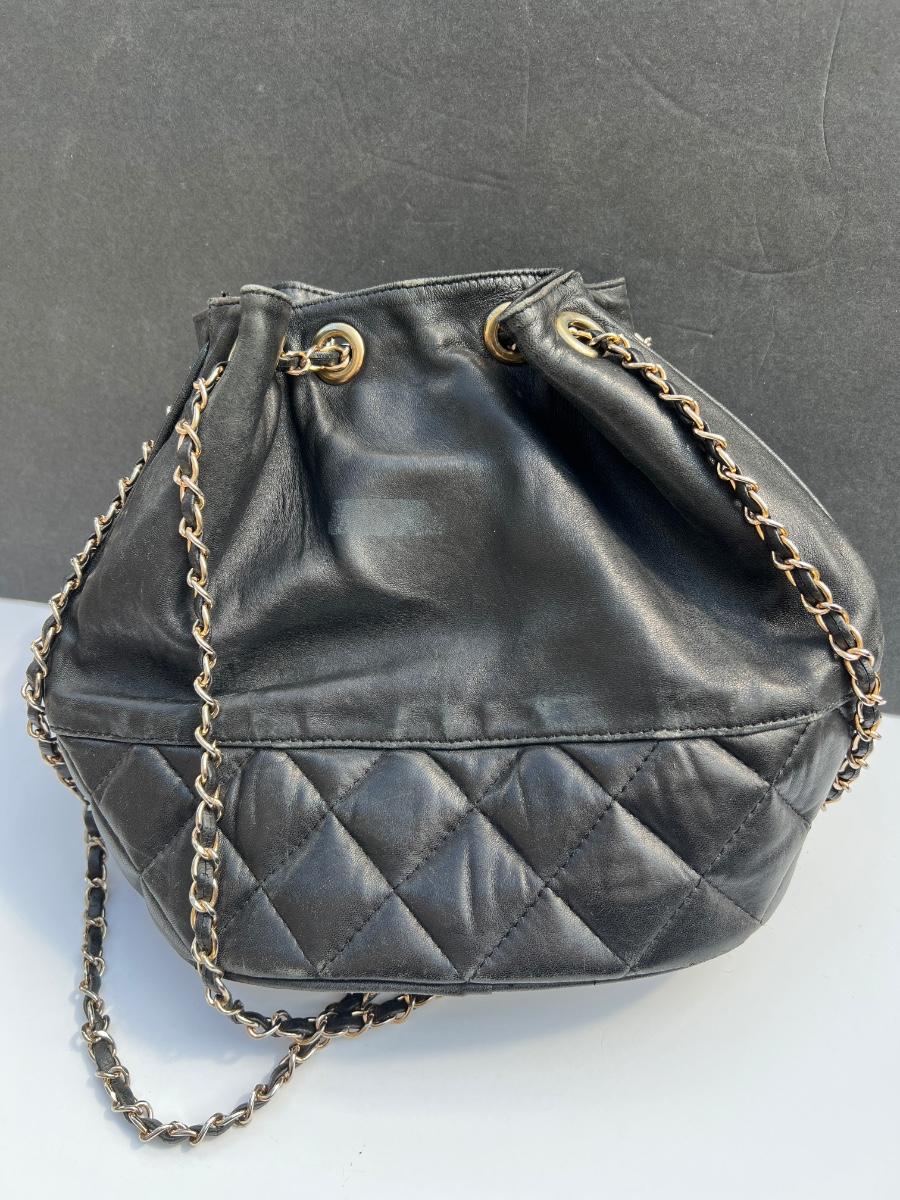 Vintage bag marked Chanel from 1970-1980s. Exceptionally soft leather (may be lambskin) quality. Continuous chain and leather drawstring. Slight wearing of surface of brass grommets and shows slight fraying of leather at bottom edges. May be revived with leather conditioning. 10” tall x 11” wide
