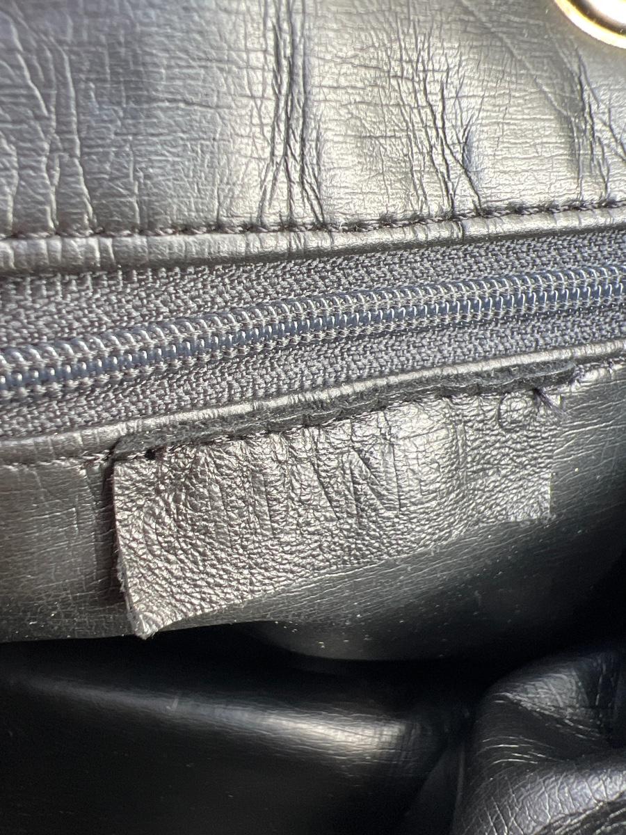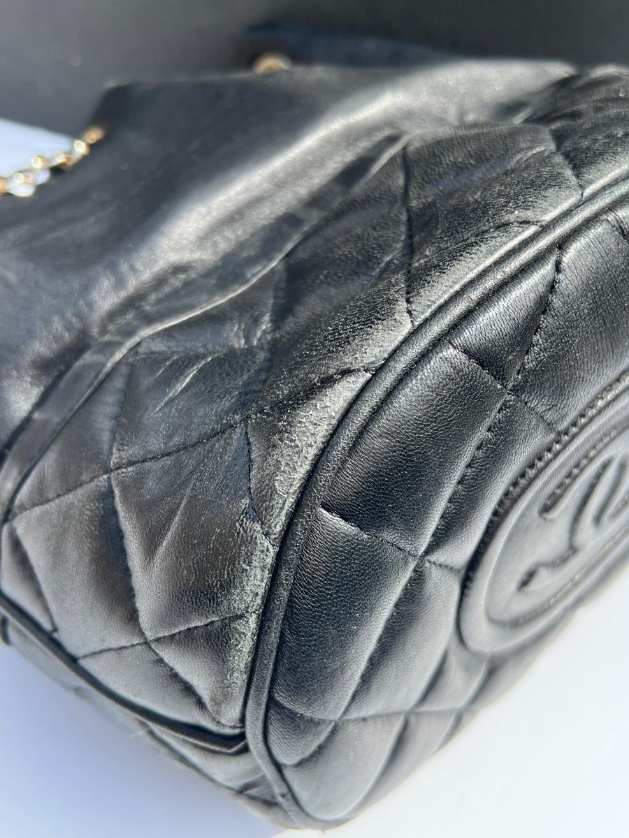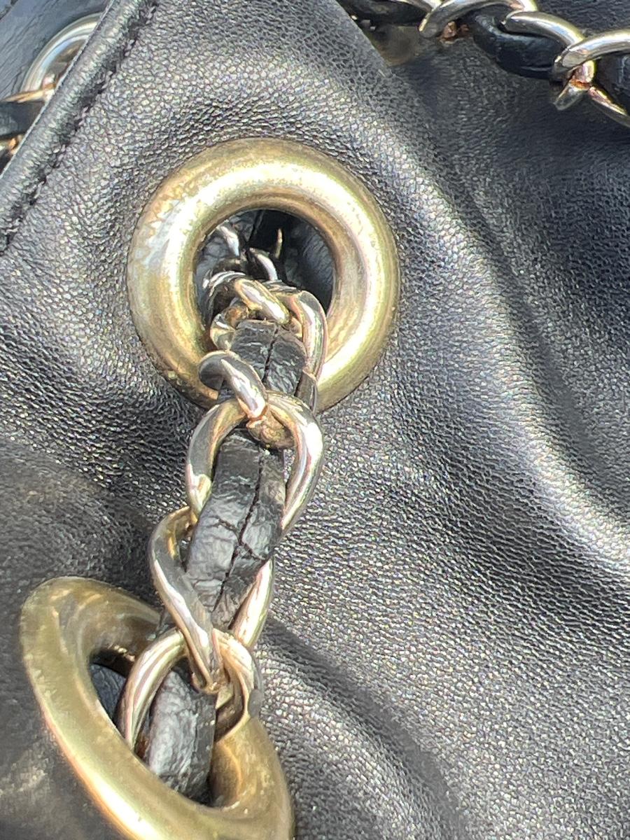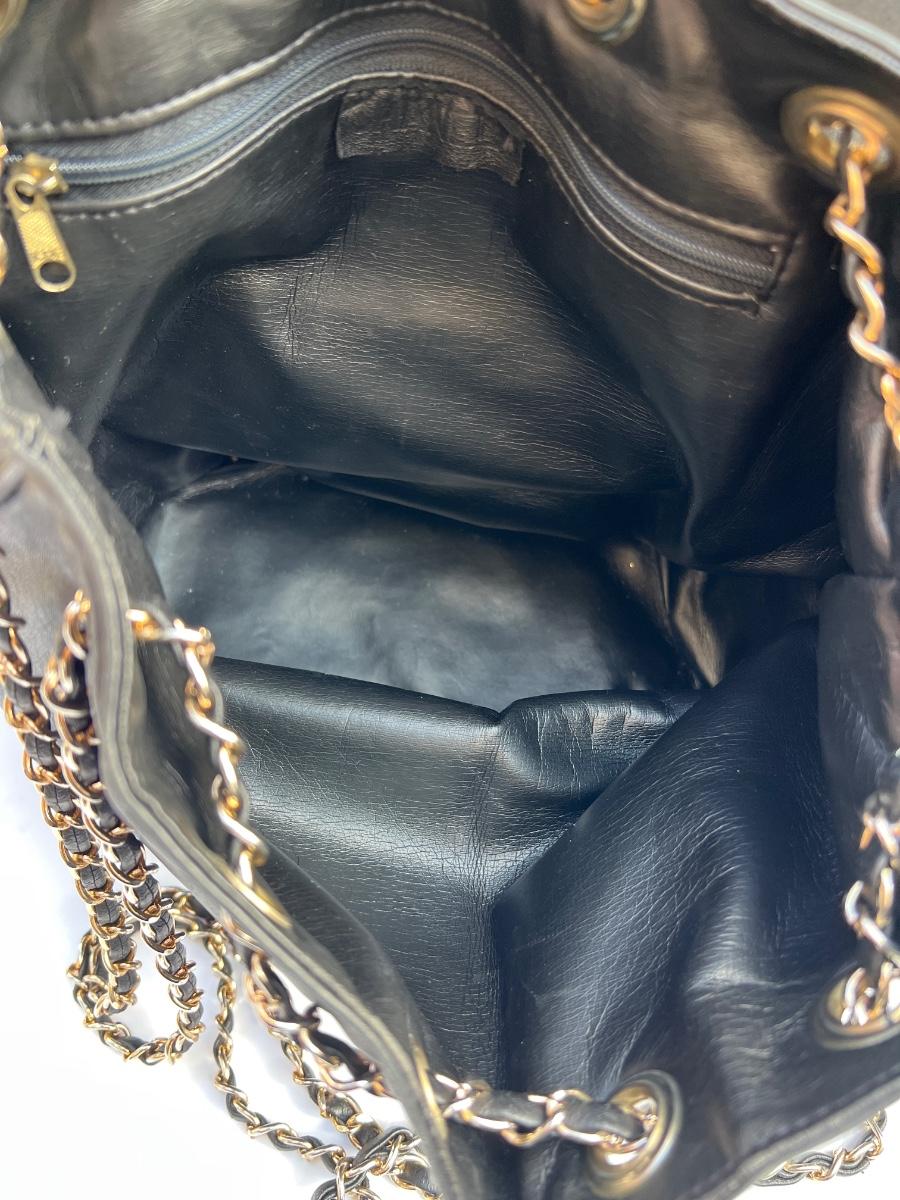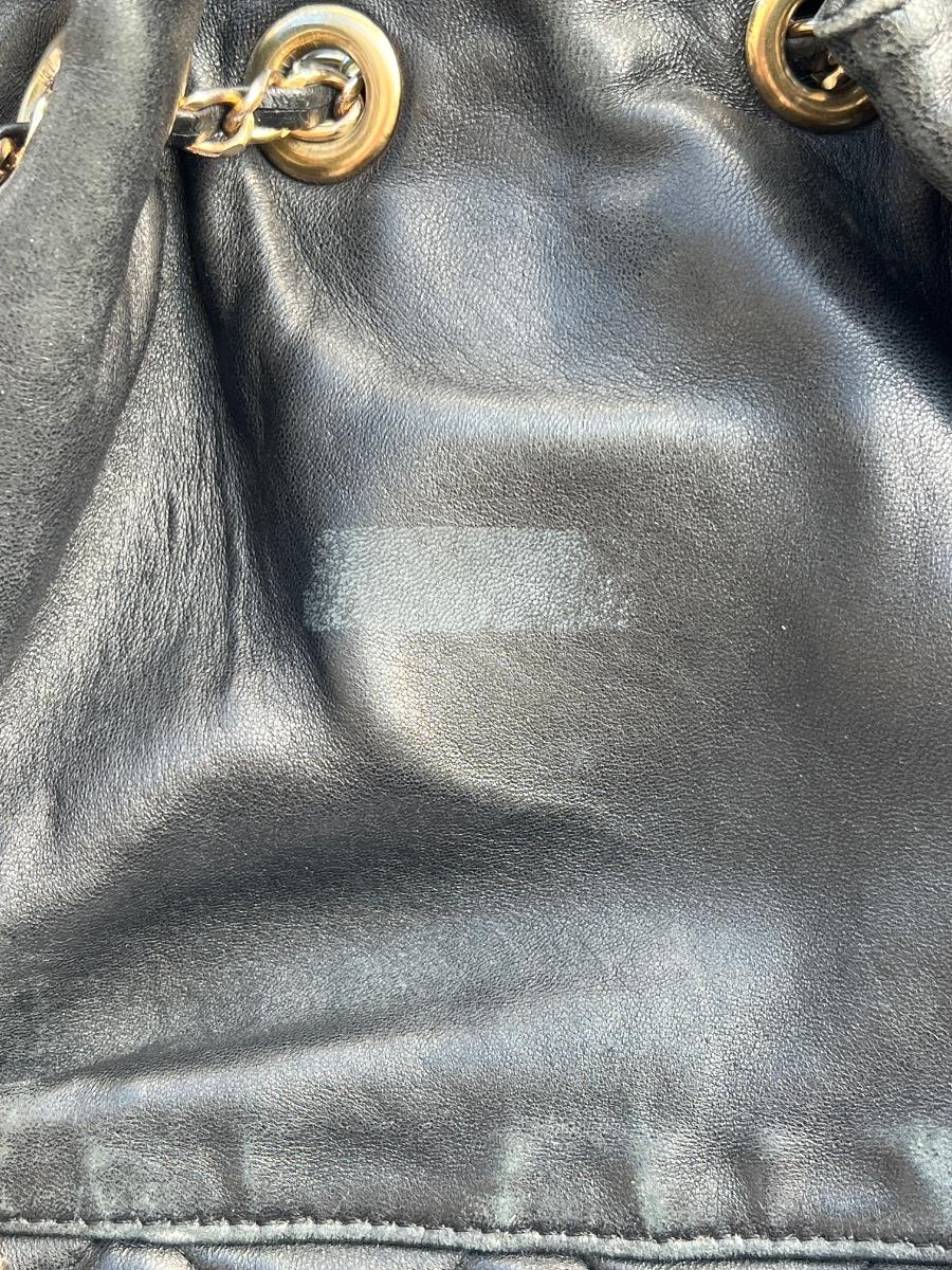 Vintage bag marked Chanel from 1970-1980s. Exceptionally soft leather (may be lambskin) quality. Continuous chain and leather drawstring. Slight wearing of surface of brass grommets and shows slight fraying of leather at bottom edges. May be revived with leather conditioning. 10” tall x 11” wide
