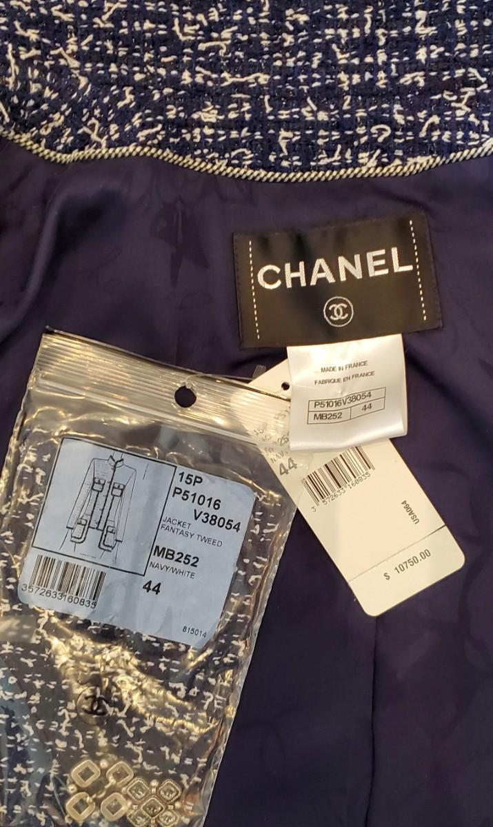 New/Old stock with tags - never worn. Size 44; Made in France. Polyester Cotton blend, silk Chanel logo lining, Chanel chain around hem. Original tag price $10,750.00. Originally purchased at Saks Fifth Avenue Beverly Hills.