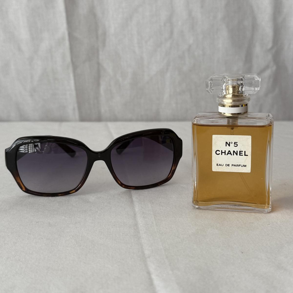 An almost-full 50 mL bottle of Chanel No. 5 perfume is paired with Kate Spade Winona sunglasses. A case (not the pair’s original) is included for the glasses. There is some light scuffing on the frame of the glasses.