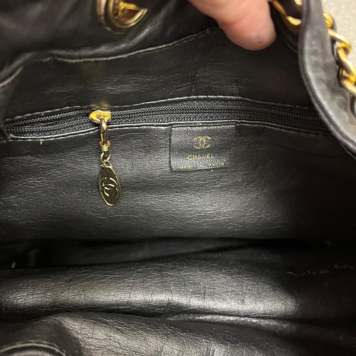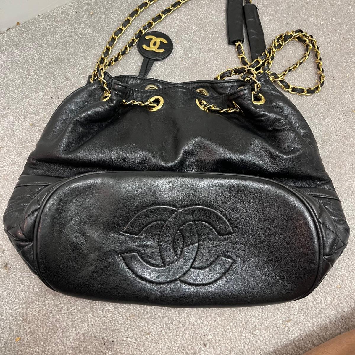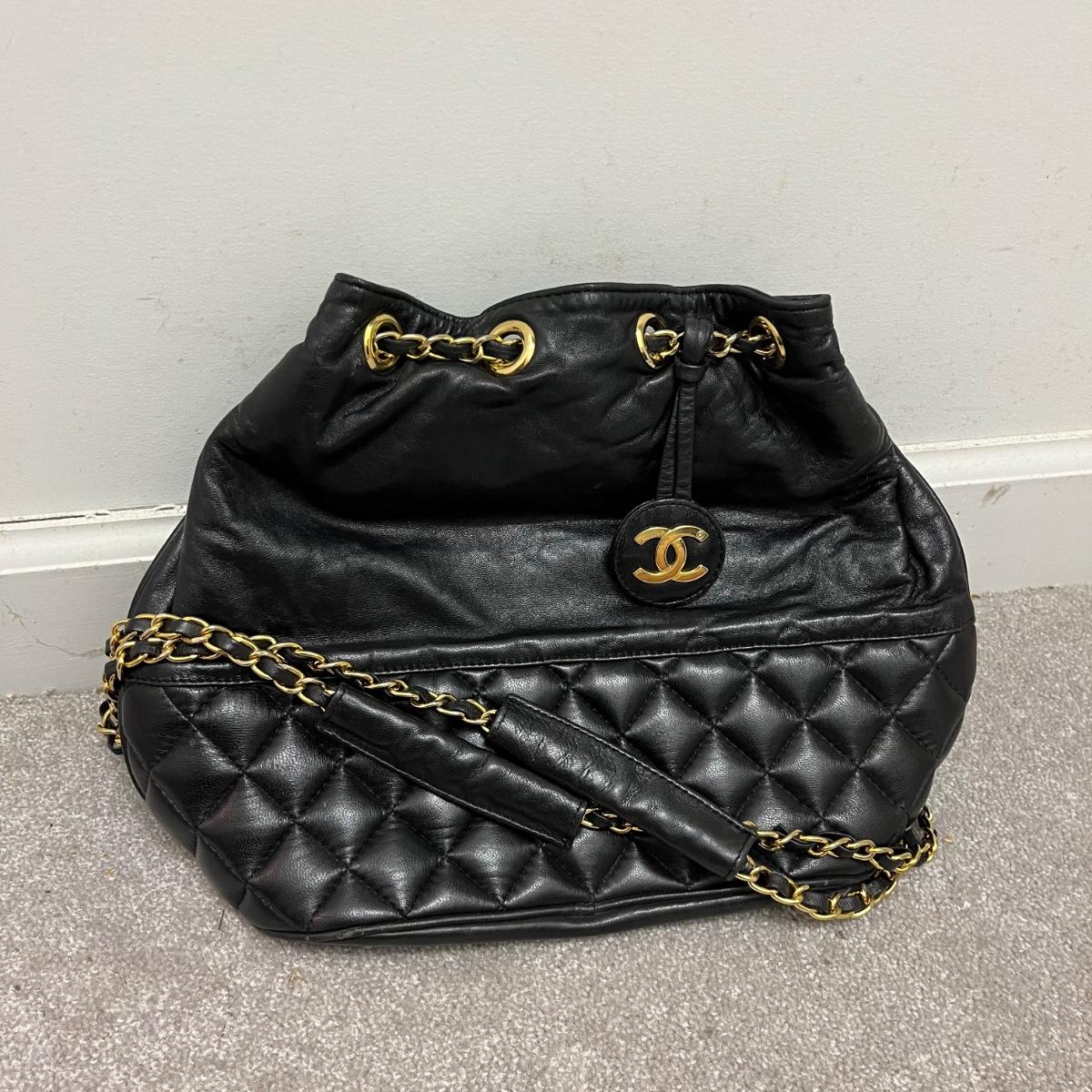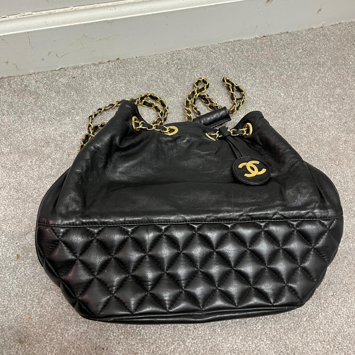 Lot includes a Chanel Purse with chain and leather drawstring handles. Purse tag says made in Paris. Purse measures 6” x 12” x 18”. Can not guarantee authenticity.
