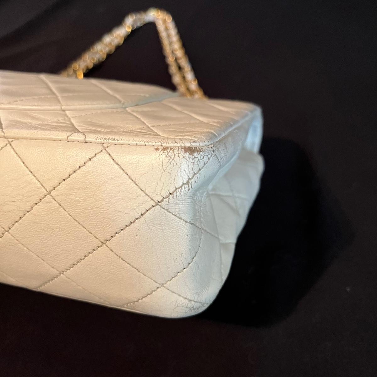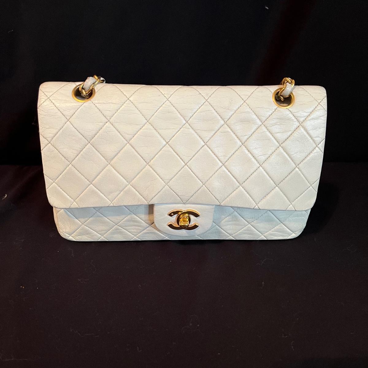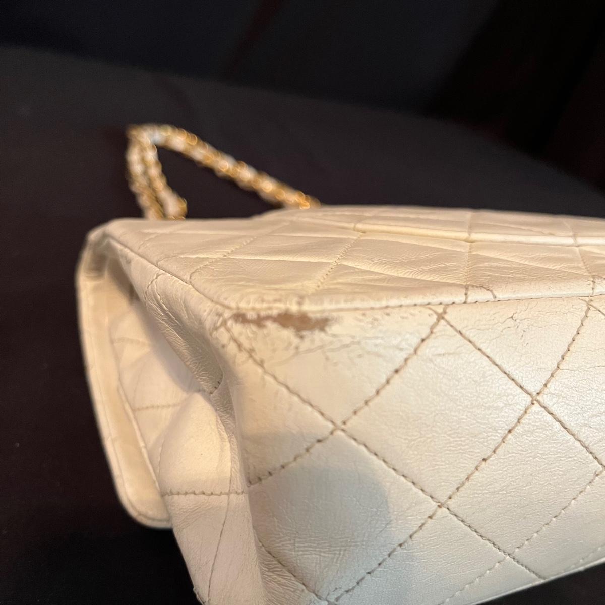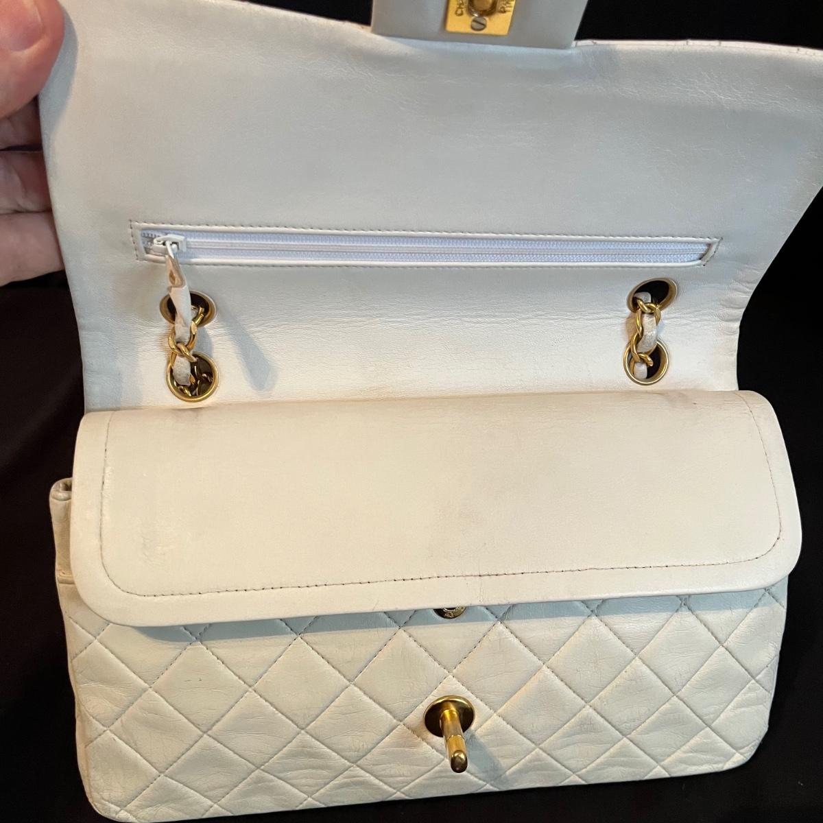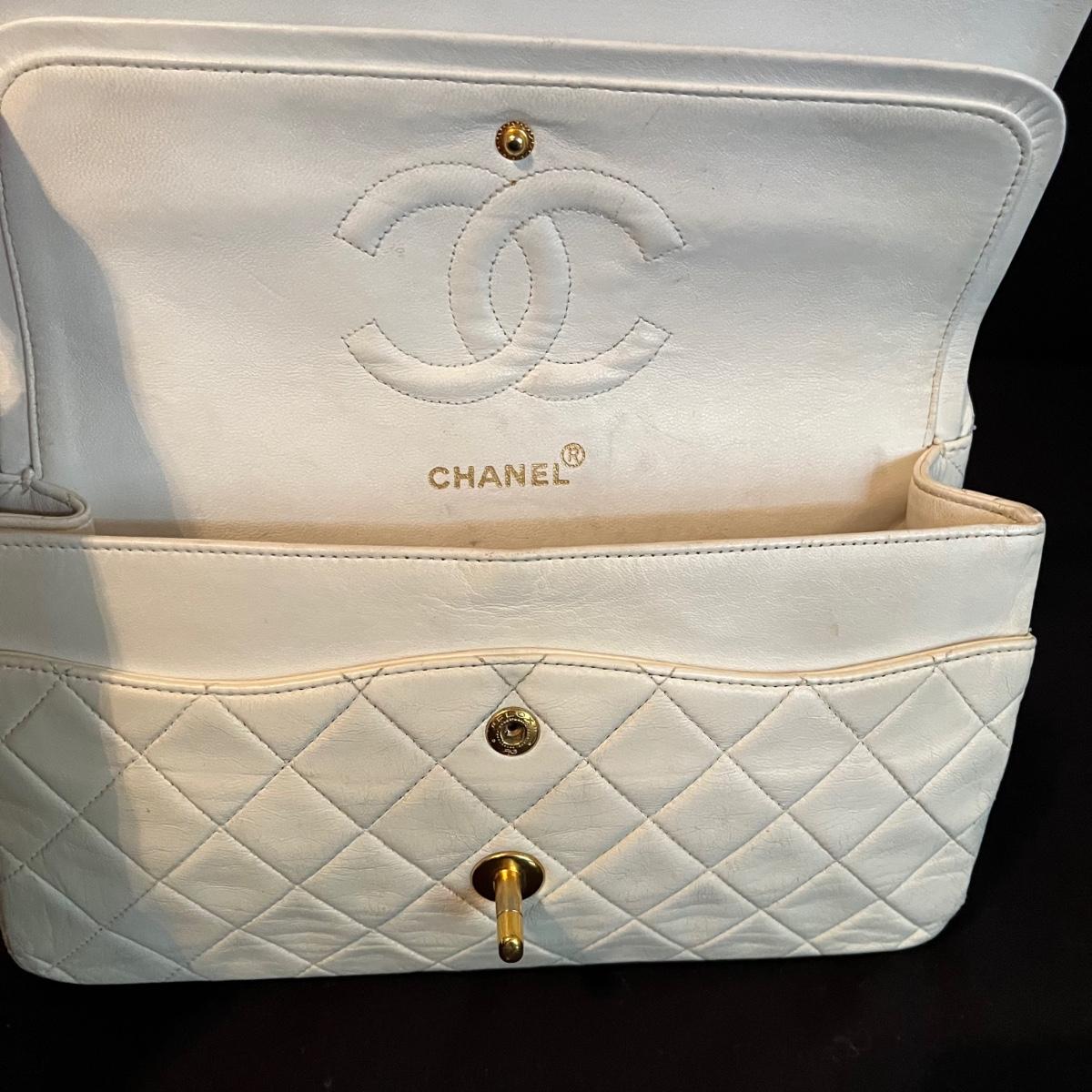 Lot includes a white leather quilted small double flap Chanel bag with chain and leather shoulder strap. Bag has some color scraped off on bottom, see pictures. Bag measures 3” x 10” x 6.5” without strap. Also includes storage bag and authentication card.