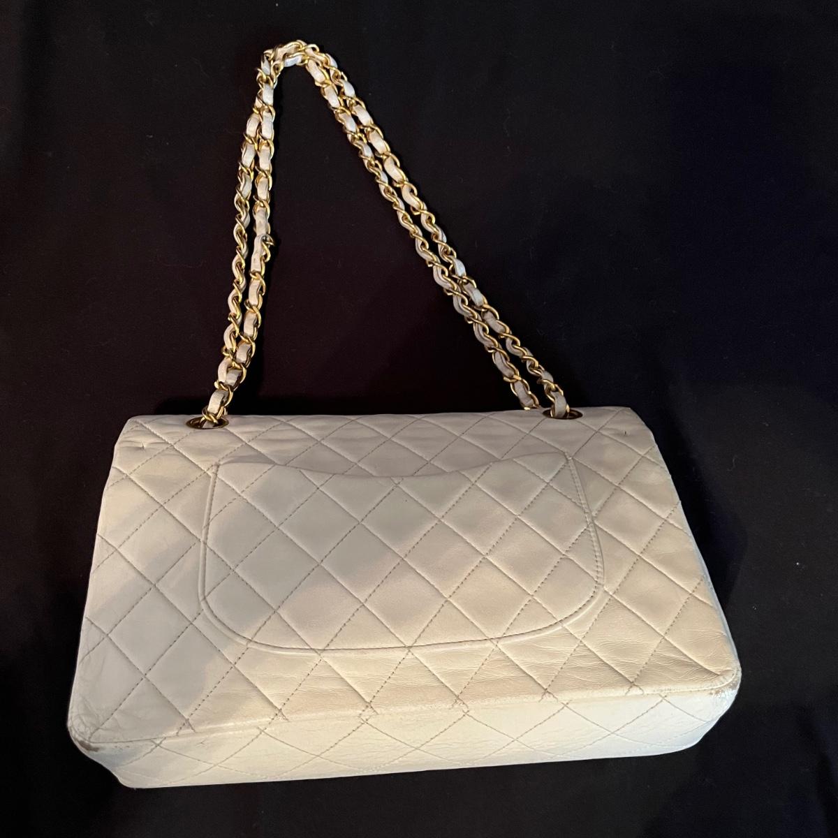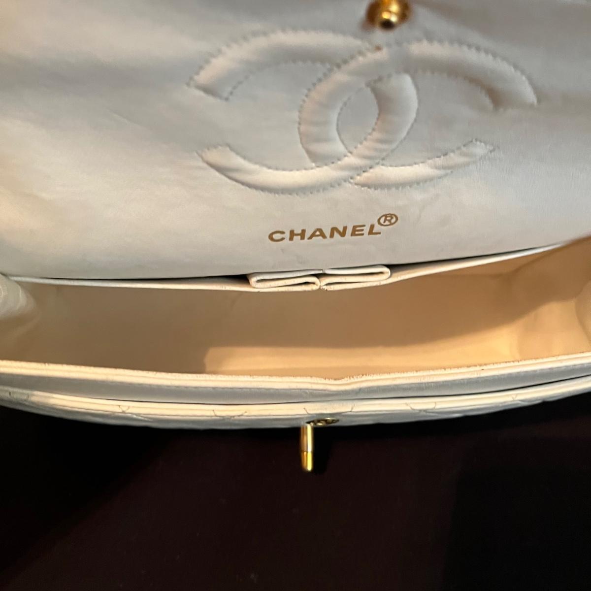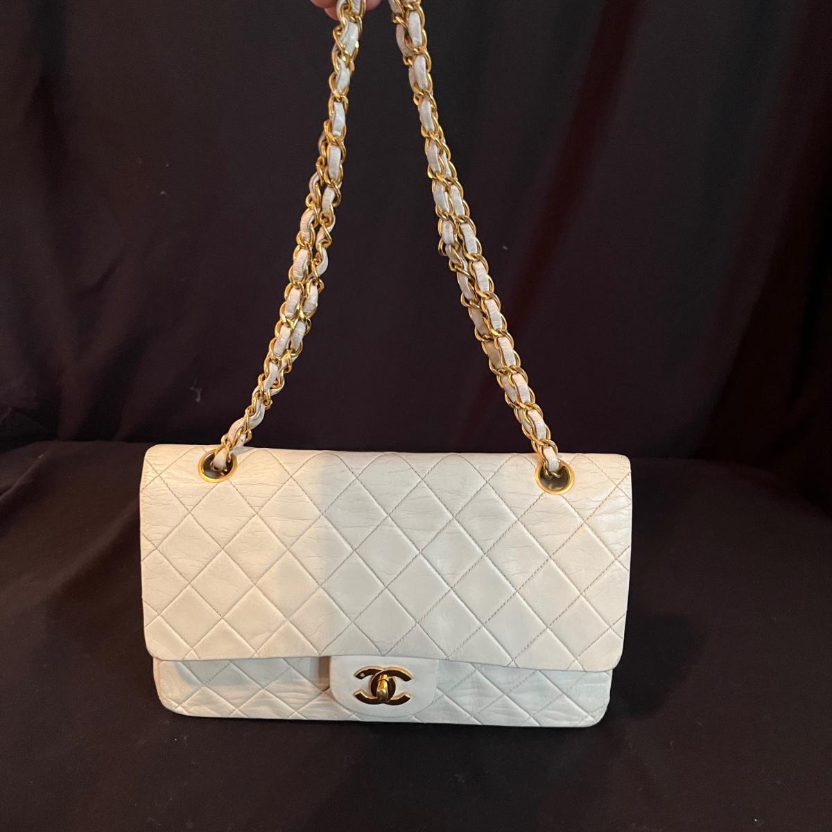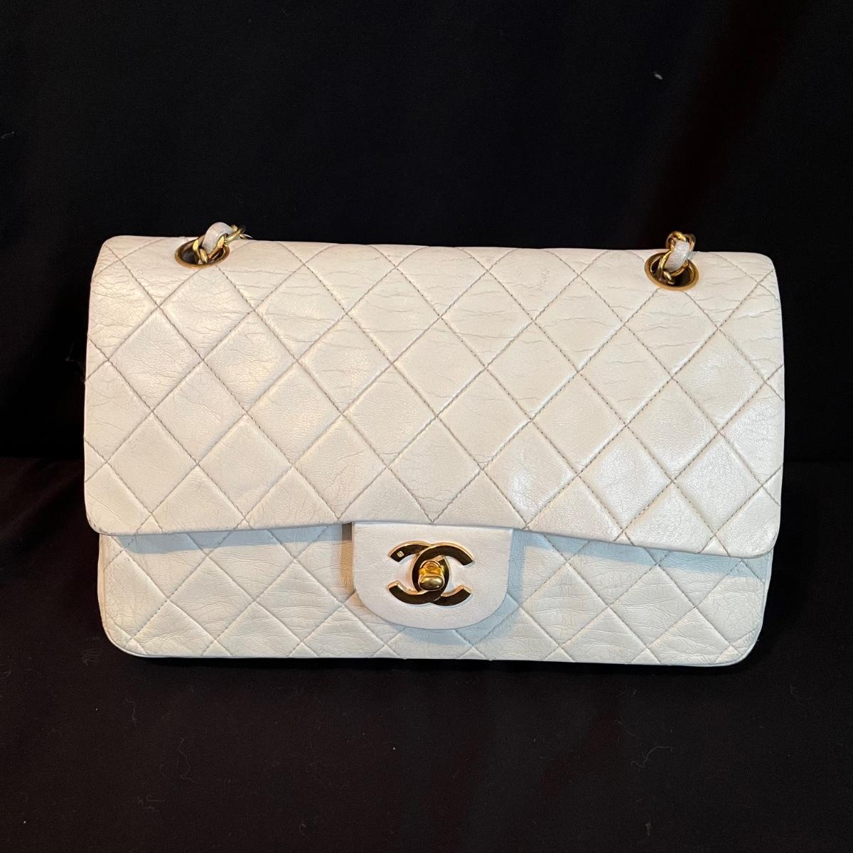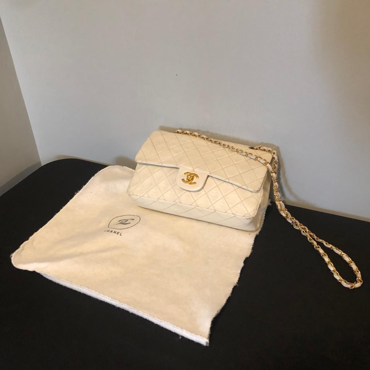 Lot includes a white leather quilted small double flap Chanel bag with chain and leather shoulder strap. Bag has some color scraped off on bottom, see pictures. Bag measures 3” x 10” x 6.5” without strap. Also includes storage bag and authentication card.
