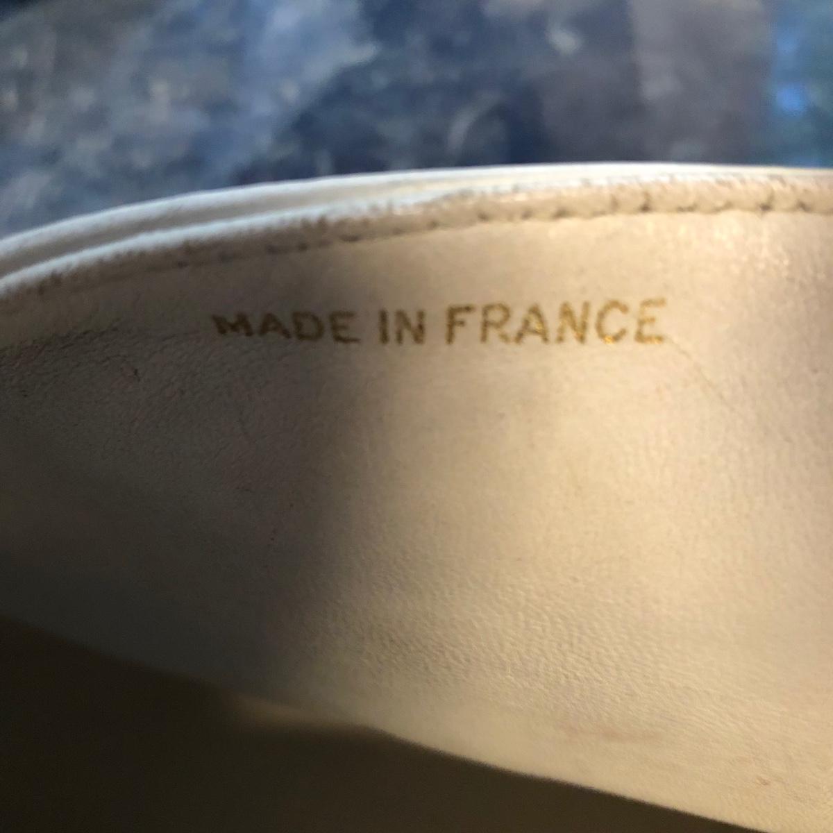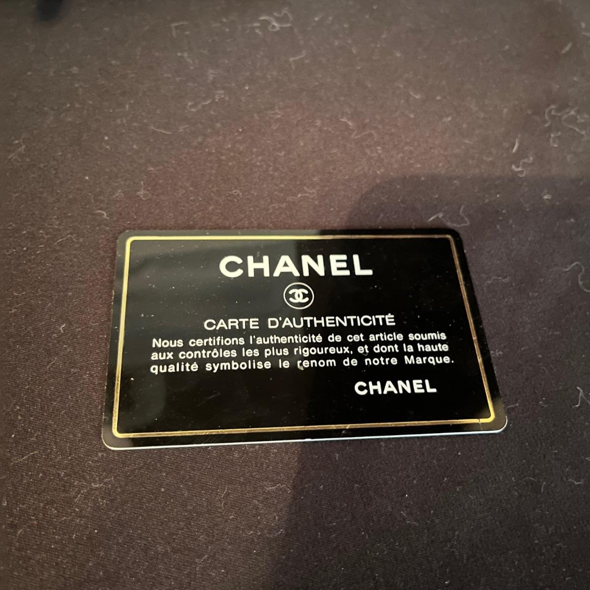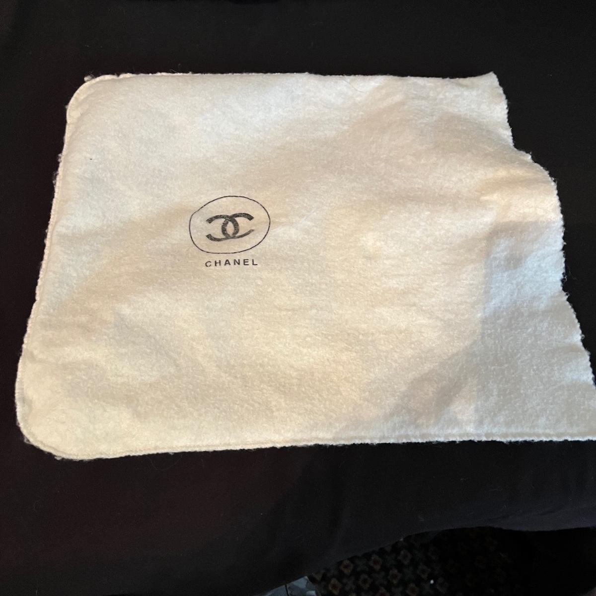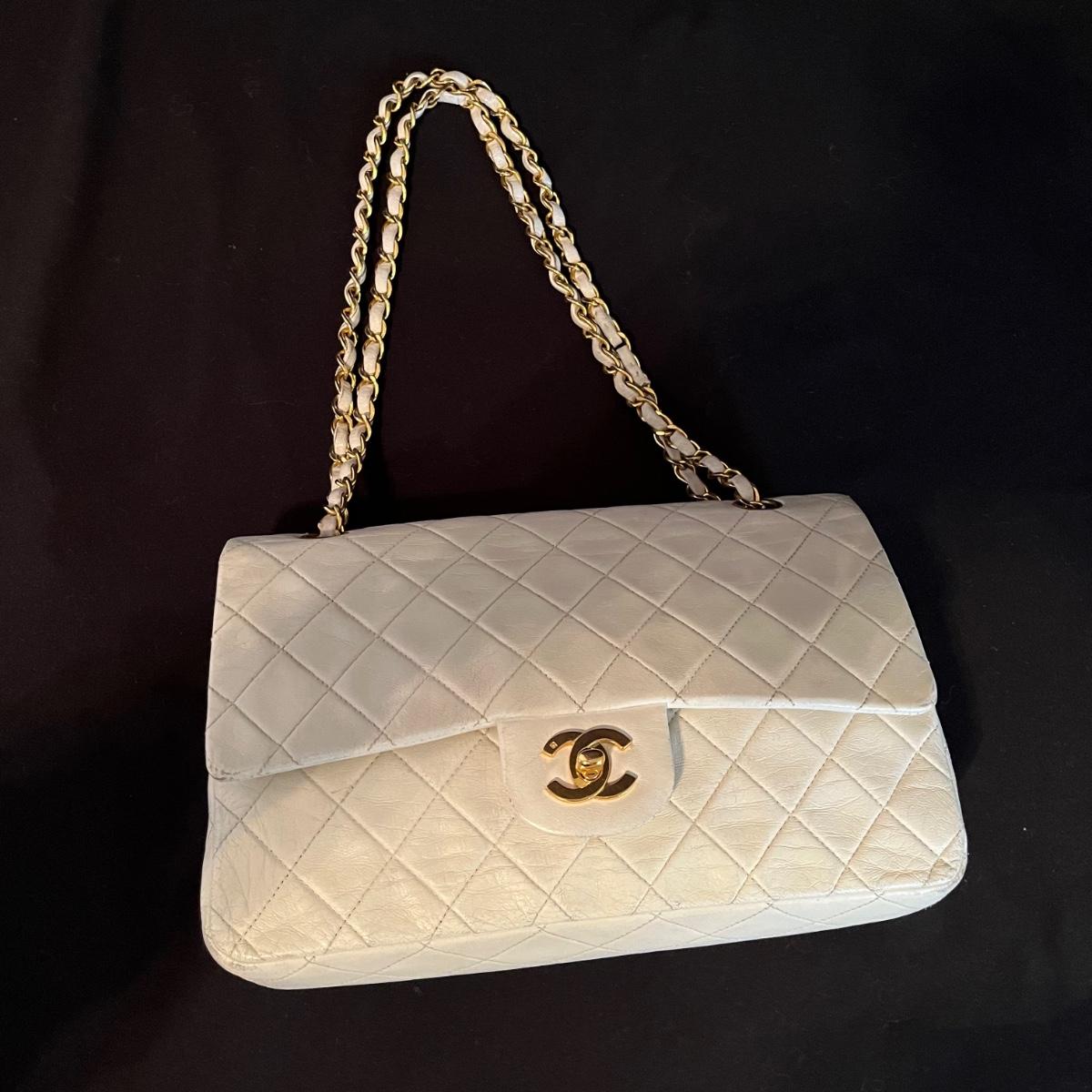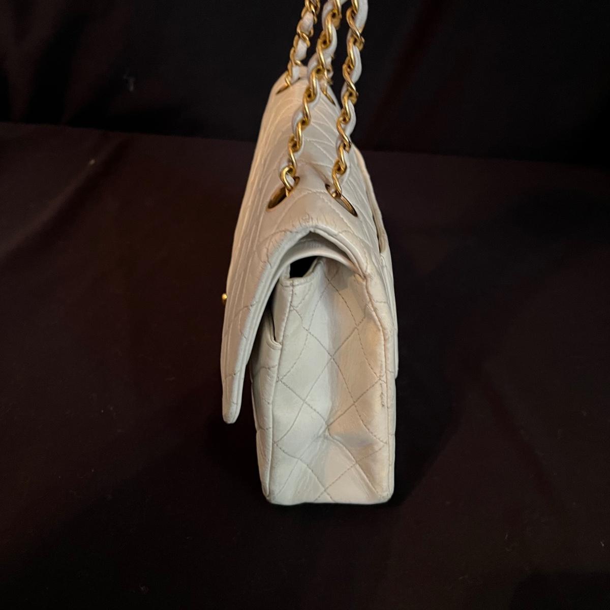 Lot includes a white leather quilted small double flap Chanel bag with chain and leather shoulder strap. Bag has some color scraped off on bottom, see pictures. Bag measures 3” x 10” x 6.5” without strap. Also includes storage bag and authentication card.