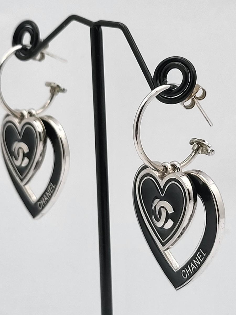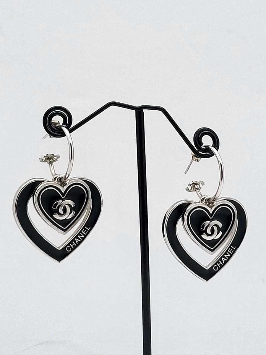 Black enameled & silver tone metal pierced earrings. Unsigned on back. Front says Chanel, had double CC hearts and double CC on other end of the hoops. Measure 1.25" wide x 2" long.