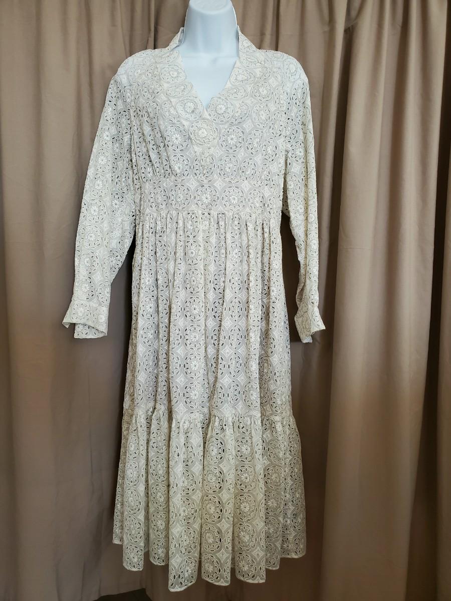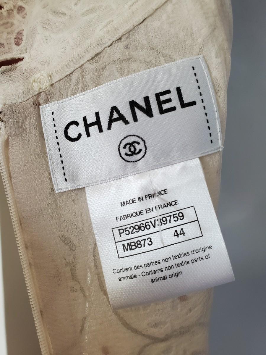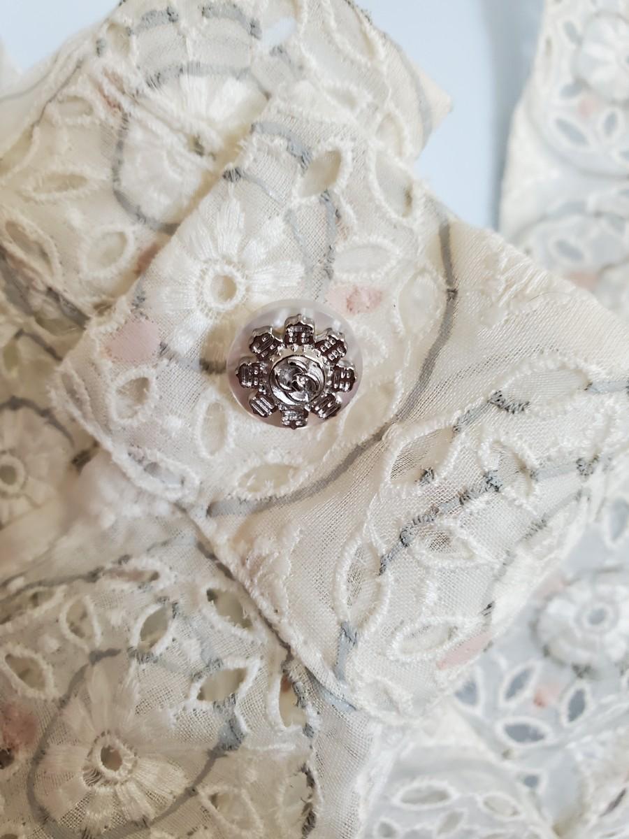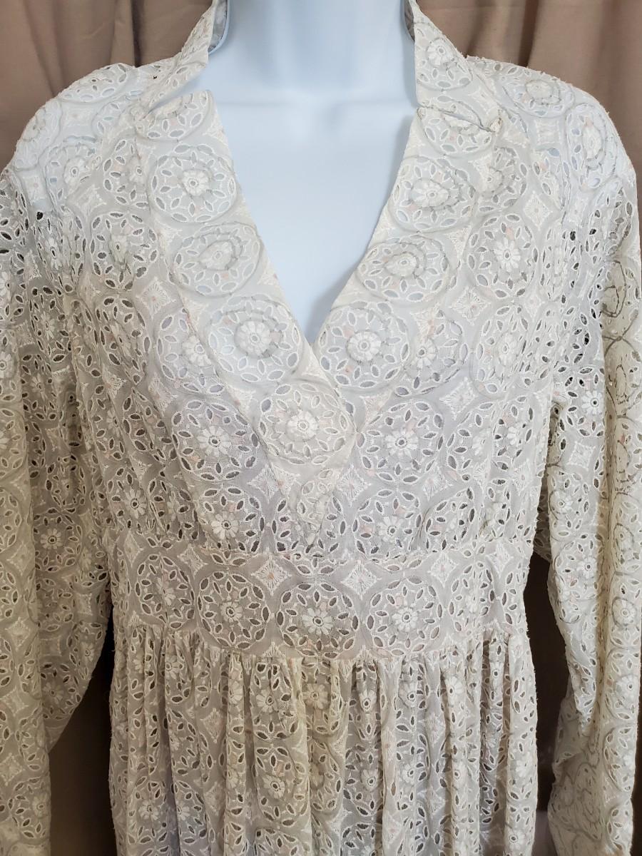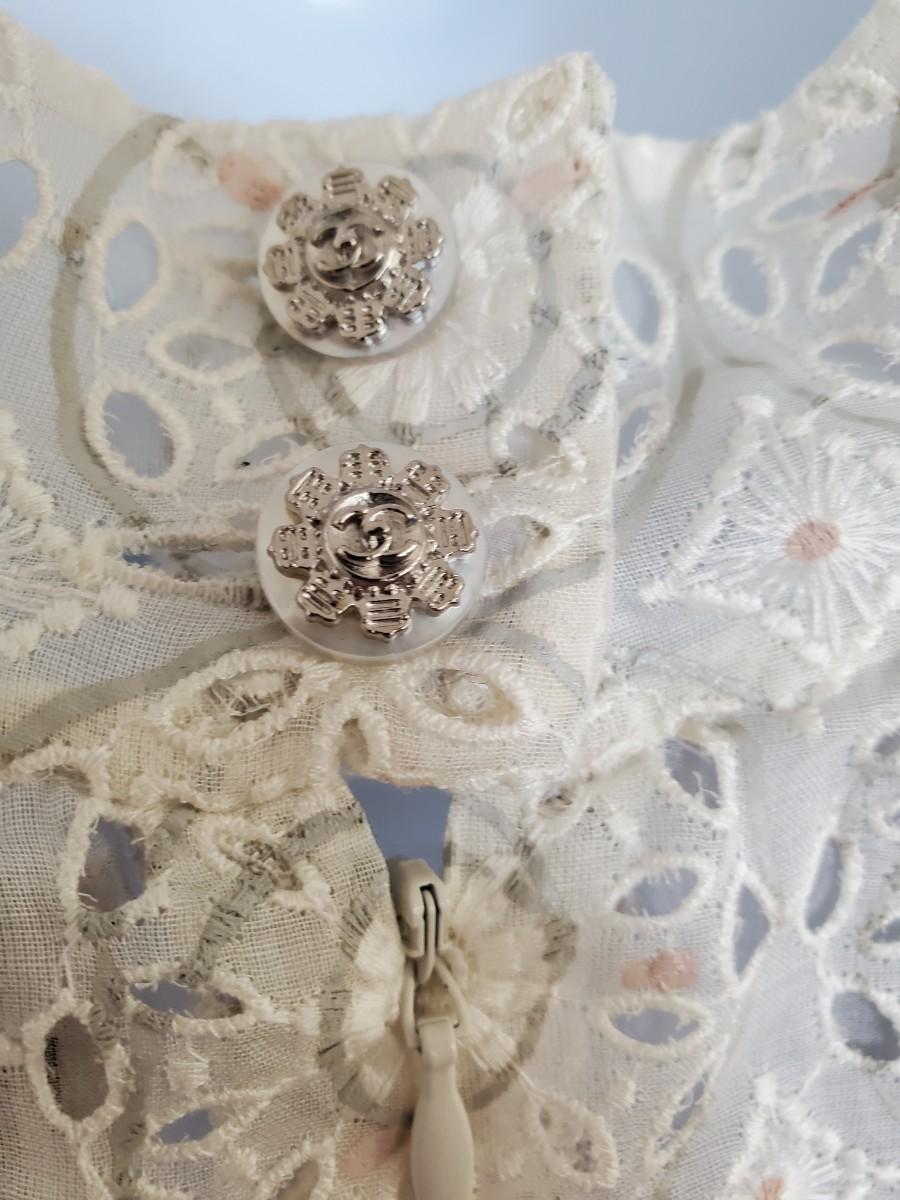 Chanel white patterned lace cut out dress, Chanel logo buttons at cuffs and collar. Lightly worn, clean, excellent condition.