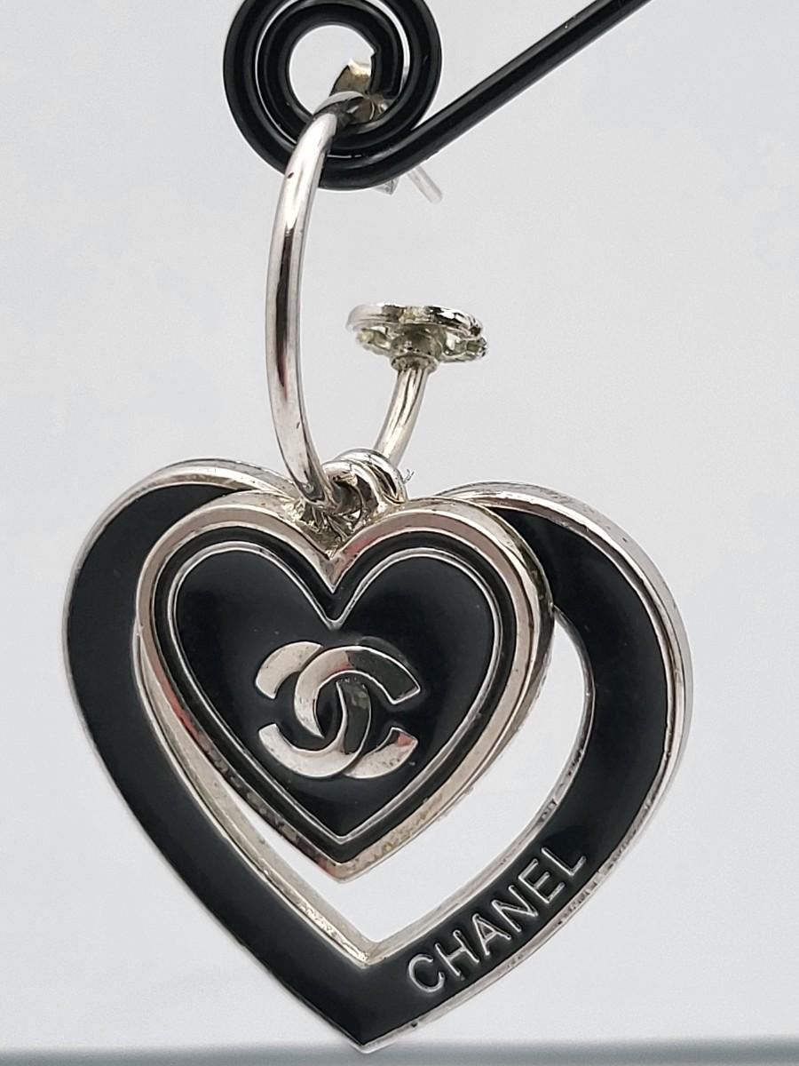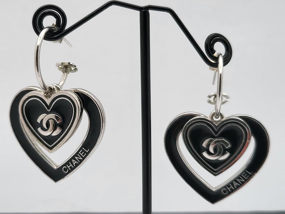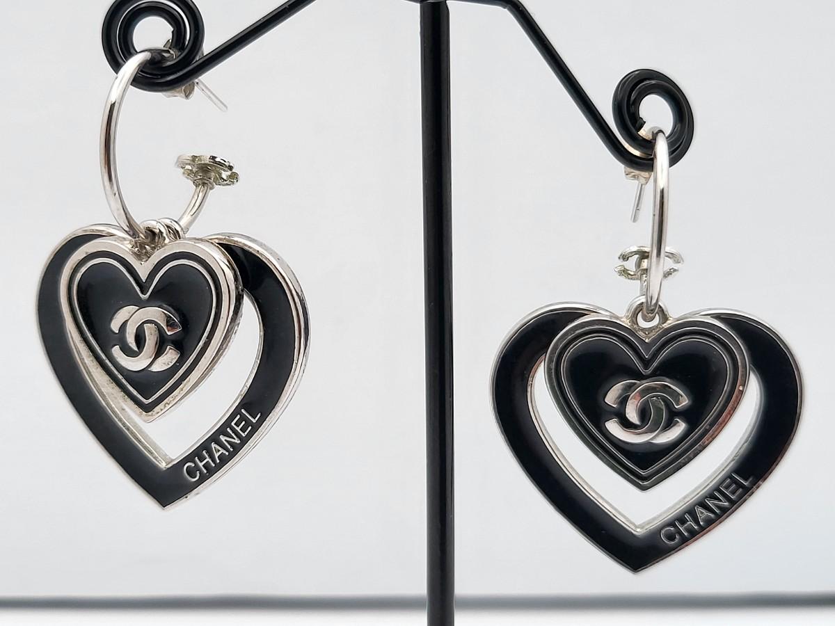 Black enameled & silver tone metal pierced earrings. Unsigned on back. Front says Chanel, had double CC hearts and double CC on other end of the hoops. Measure 1.25" wide x 2" long.