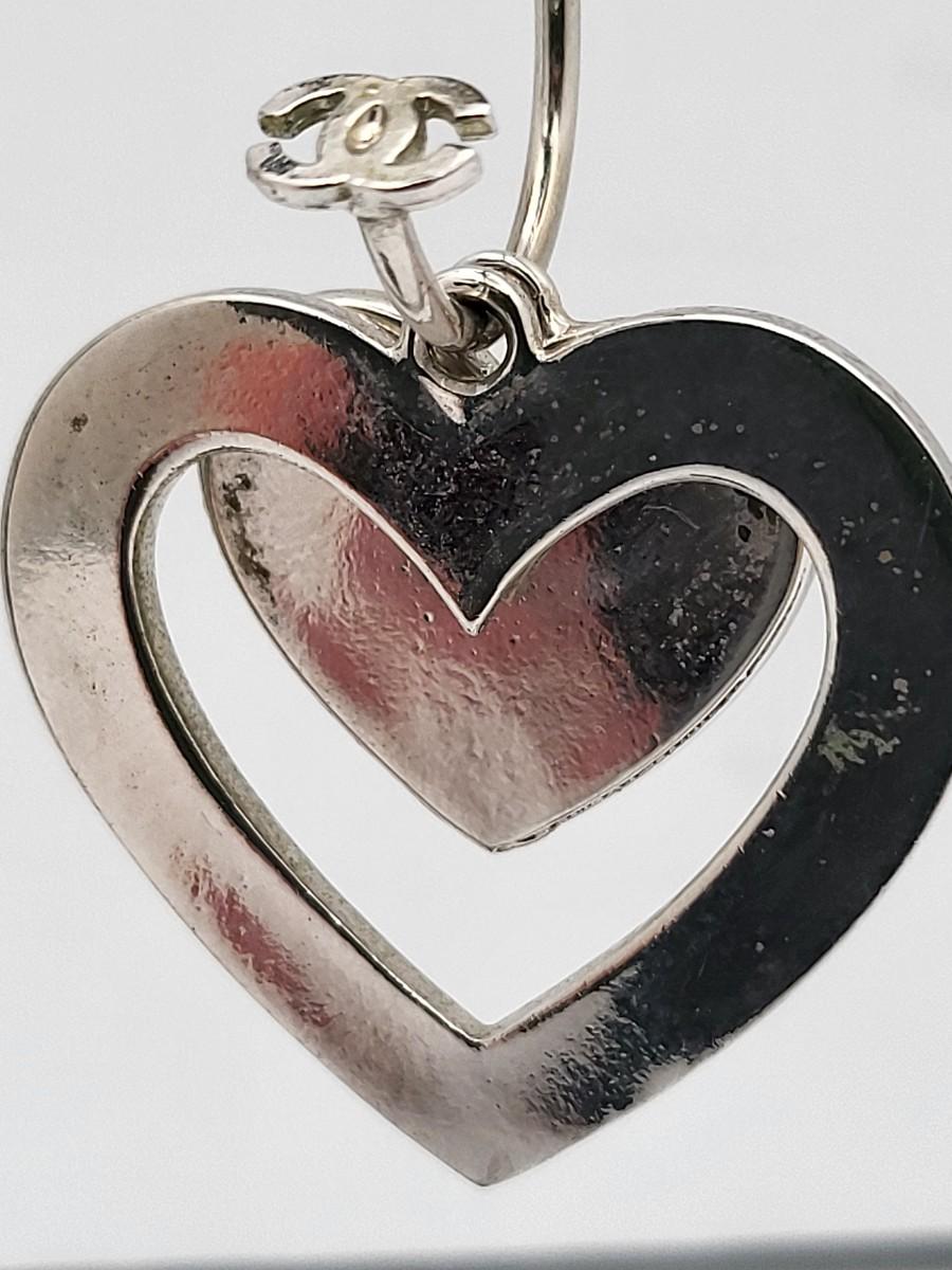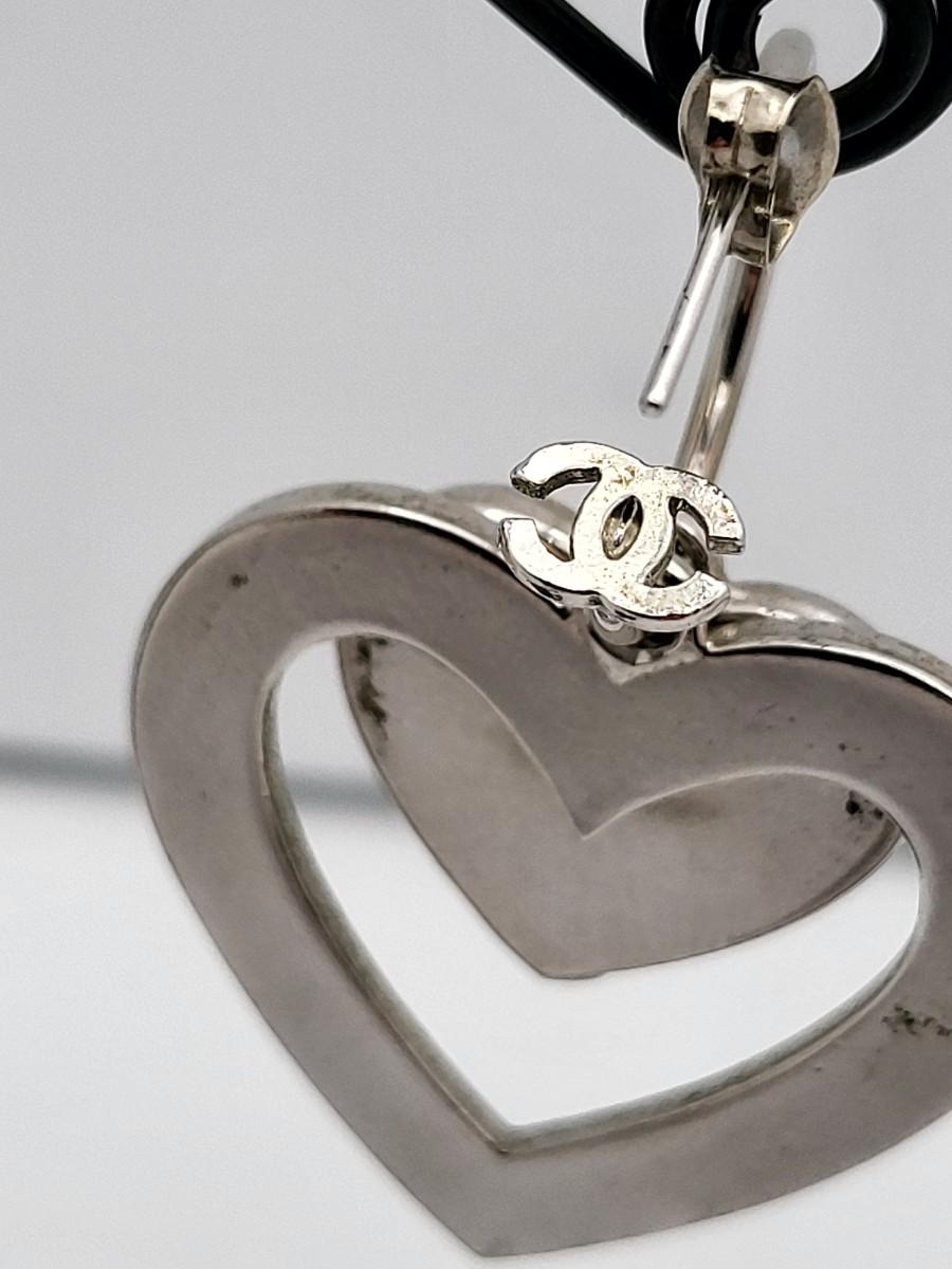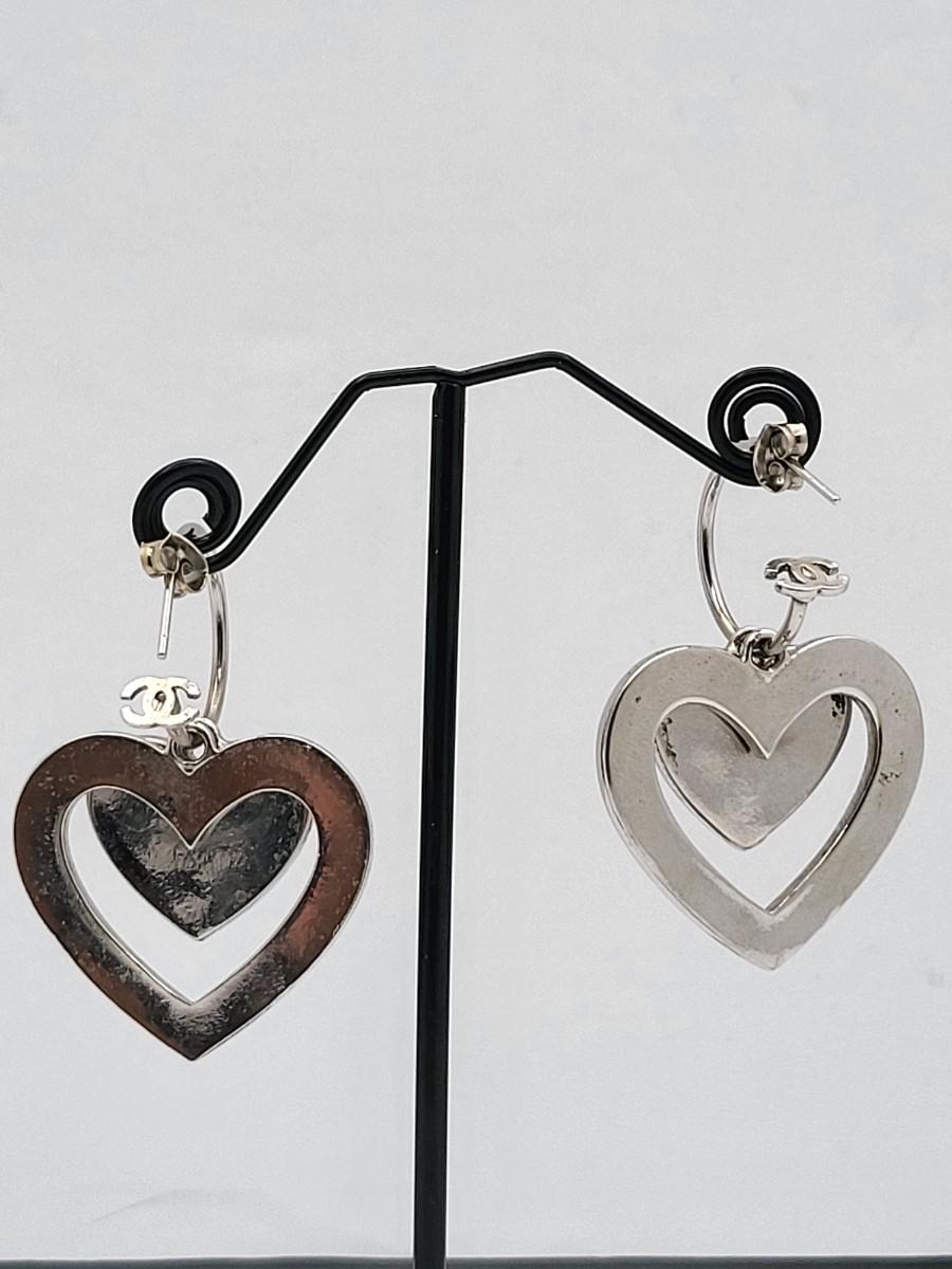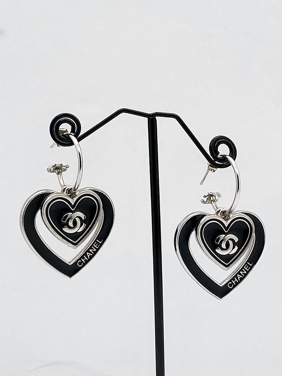 Black enameled & silver tone metal pierced earrings. Unsigned on back. Front says Chanel, had double CC hearts and double CC on other end of the hoops. Measure 1.25" wide x 2" long.
