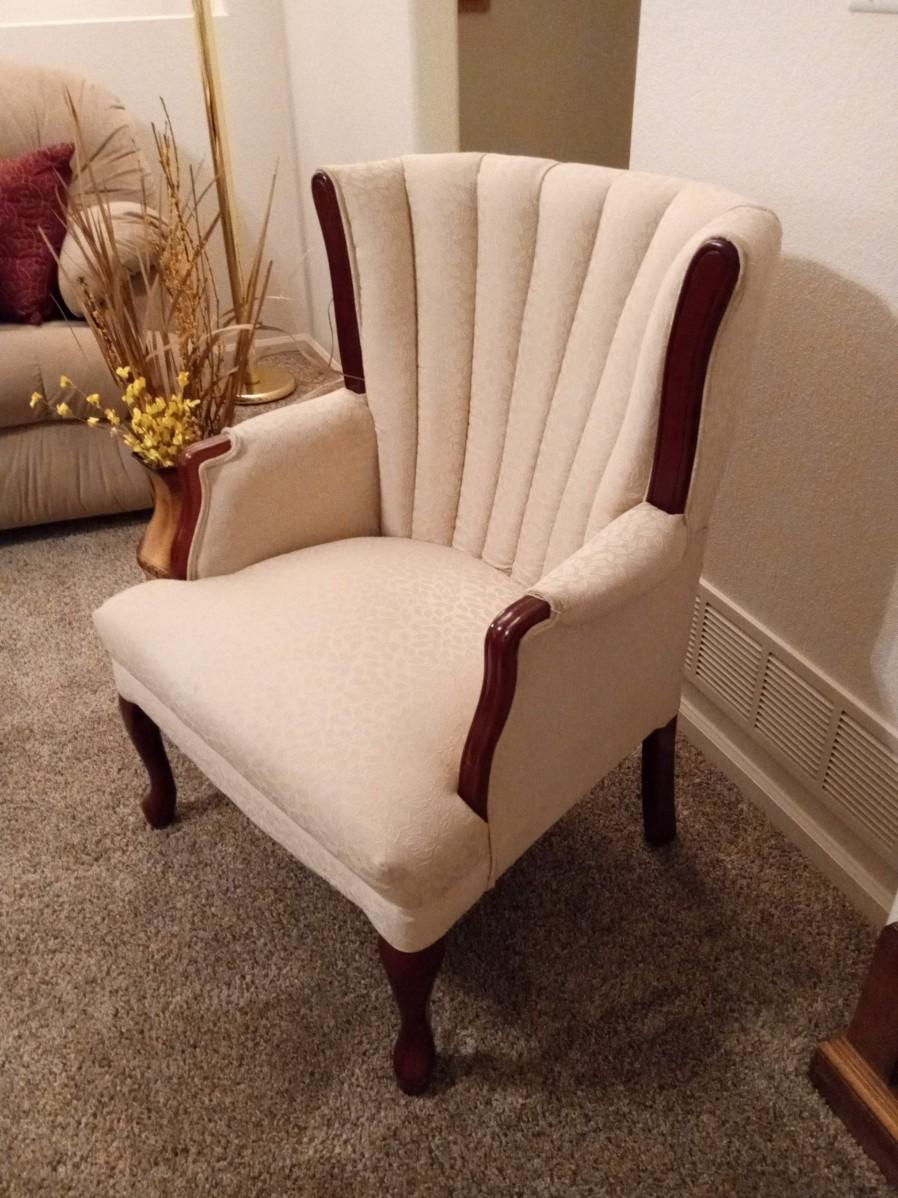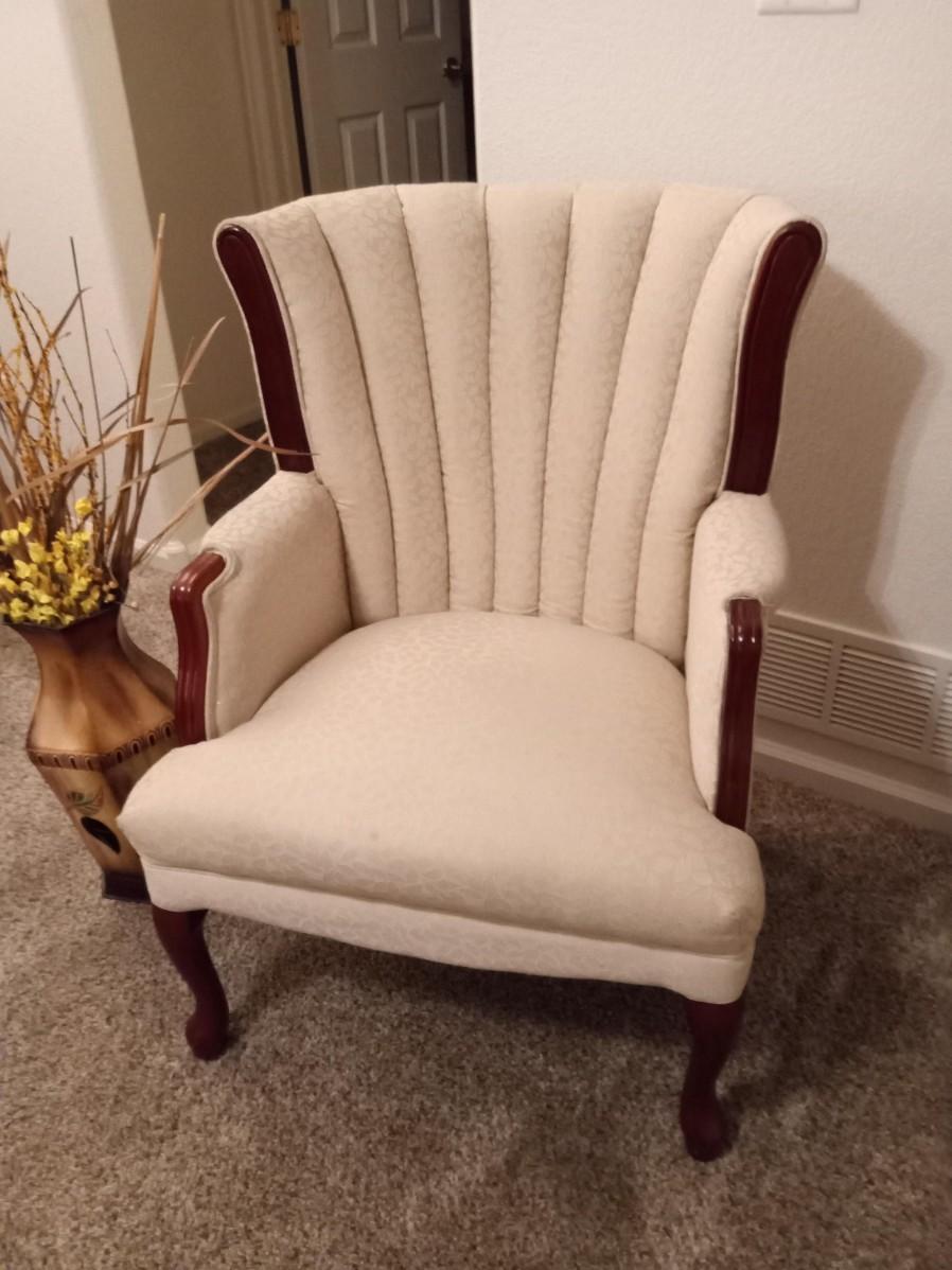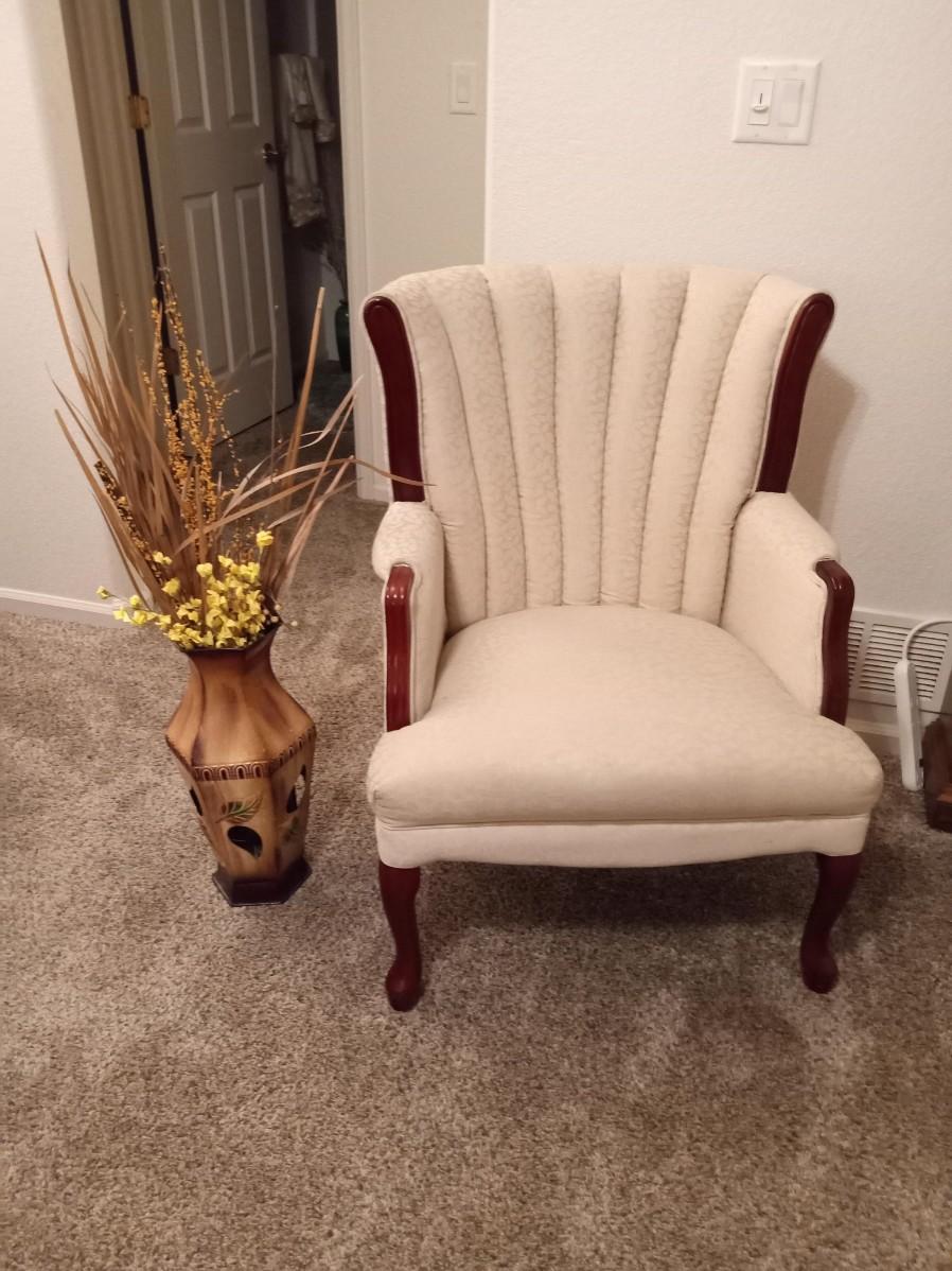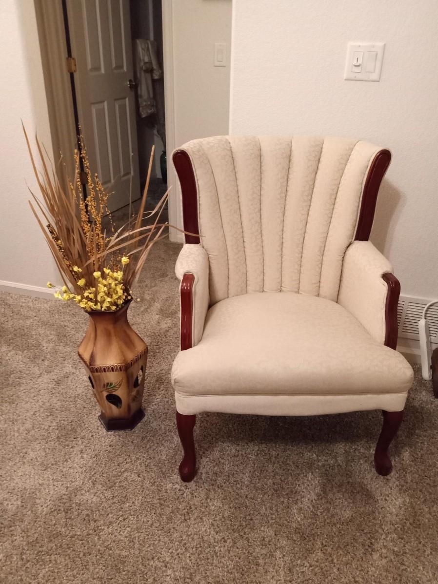 CHANNEL BACK ACCENT CHAIR AND A TALL METAL VASE