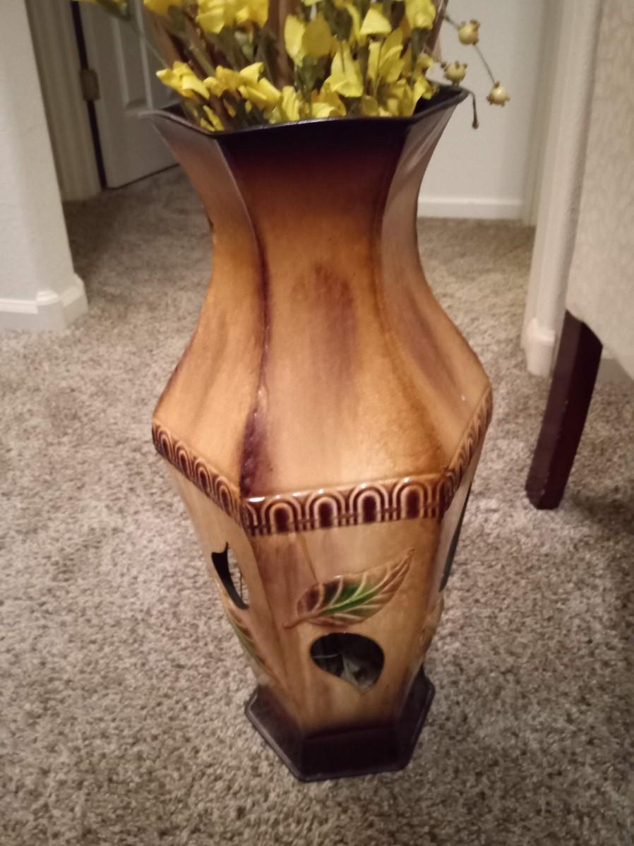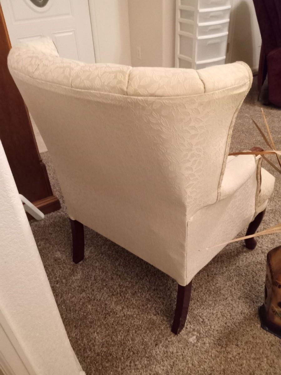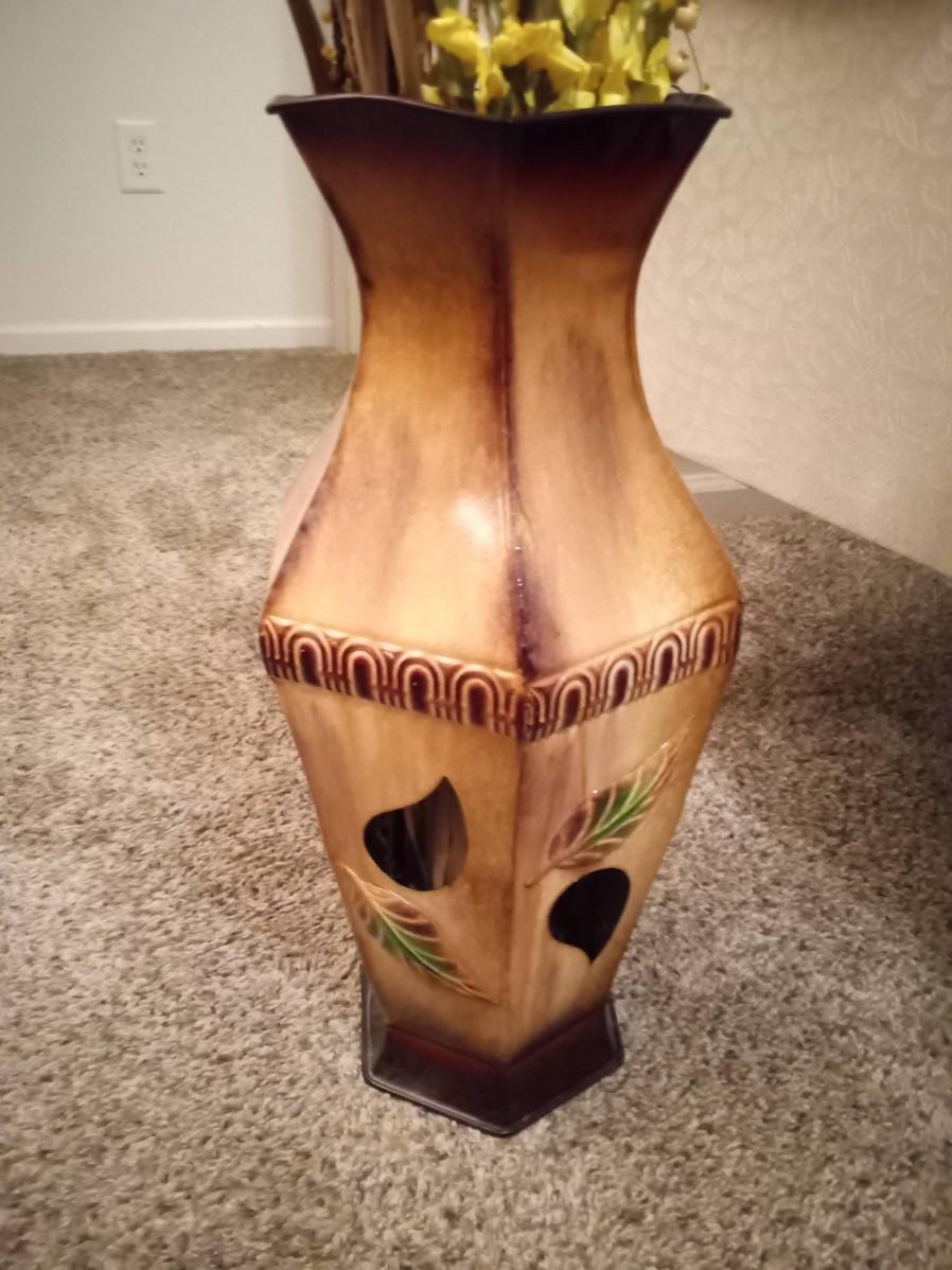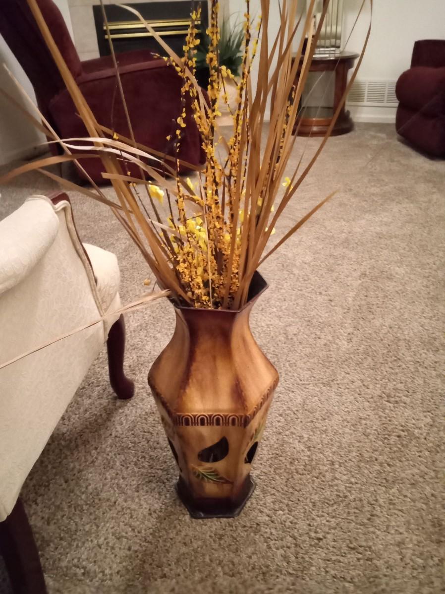 CHANNEL BACK ACCENT CHAIR AND A TALL METAL VASE