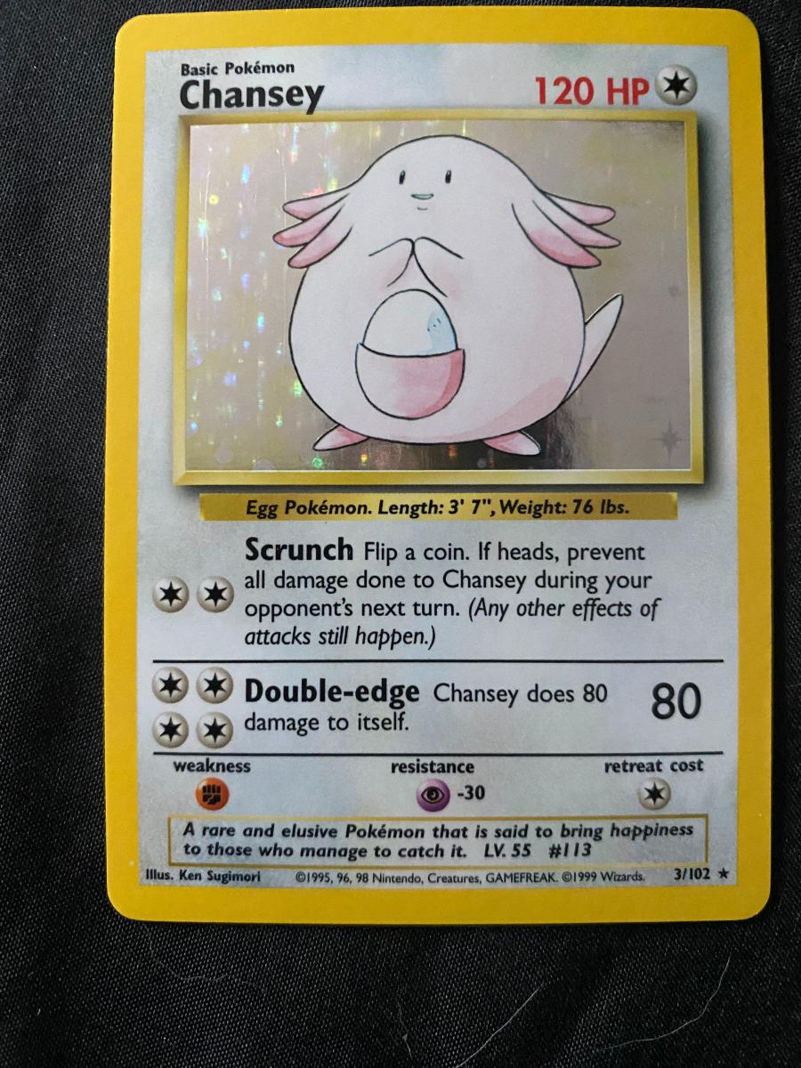 Chansey Pokemon Trading Card, card number 3/102 from the 1999 Base Set. Card is printed in English with 120 HP, featuring the moves 'Scrunch' and 'Double-edge.' Condition is considered light play, showing minor wear but no significant damage. Standard backing and yellow-bordered design. Ideal for collectors and players.