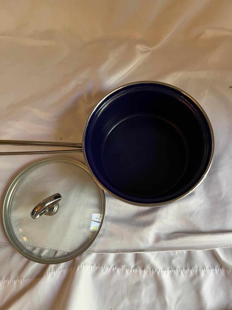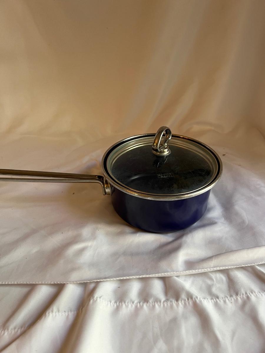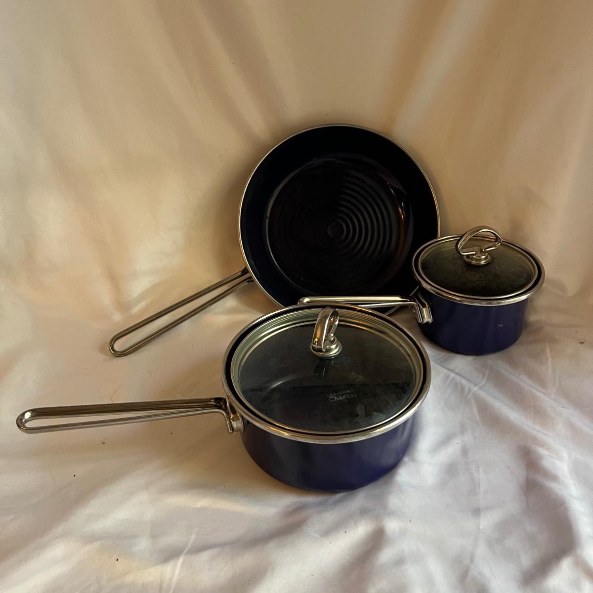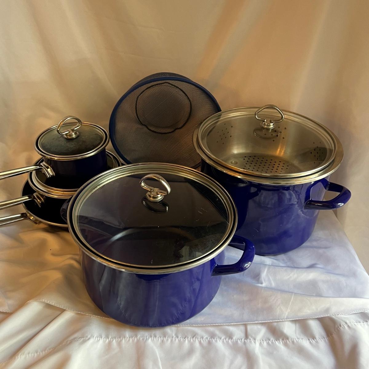 A complete set of royal blue Chantal Cookware. Large stockpot with lid measures 11.25”D x 8.25”H and includes a colander that nests inside. Smaller stockpot and lid measures 10”D x 6”H. The frying pan measures 9.5”D x 2”H. The sauce pot and lid is 7.25”D x 3.25”H and the small sauce pot and lid is 5.75”D x 3.25”H. The lot also includes a royal blue colander that is 10”D x 4.25”H