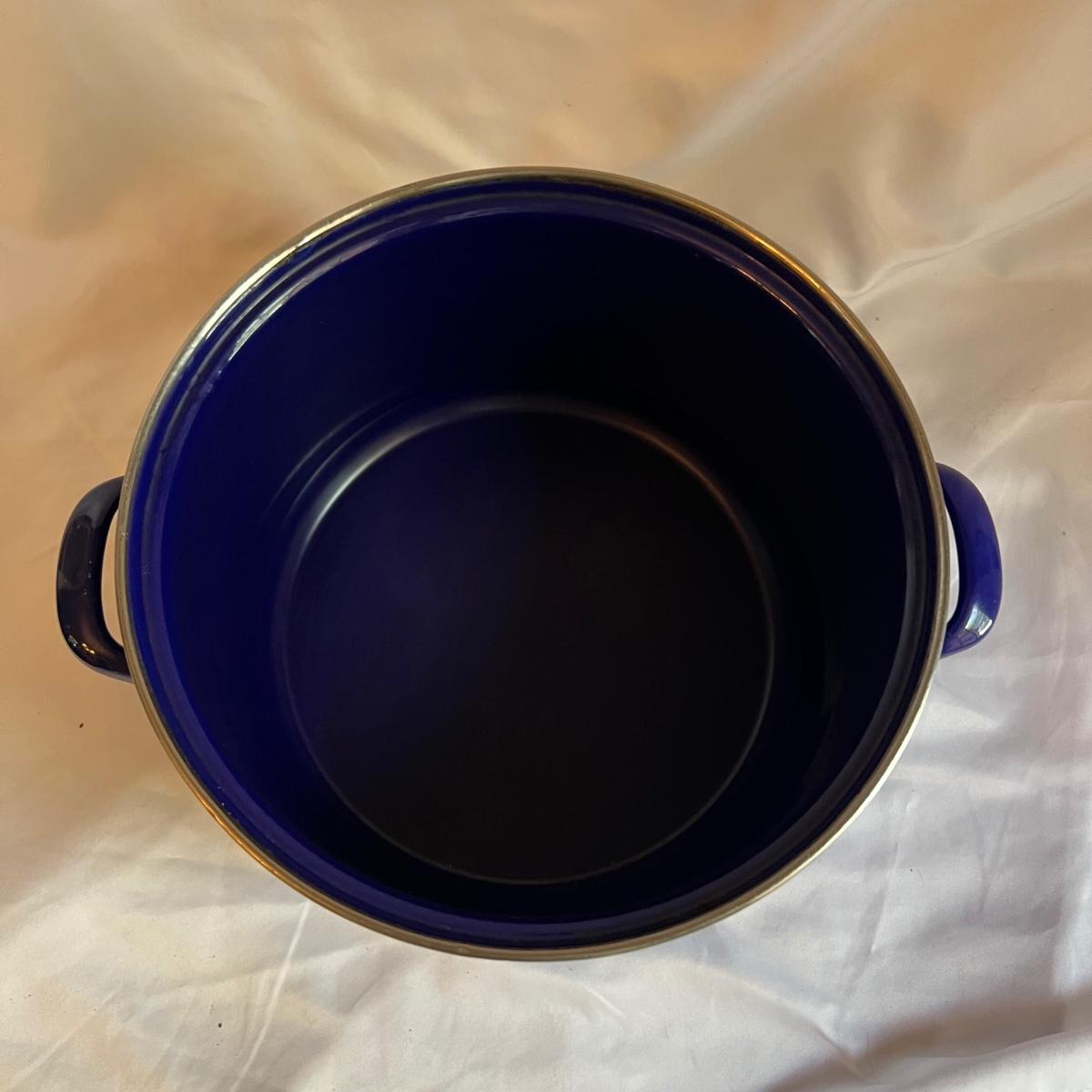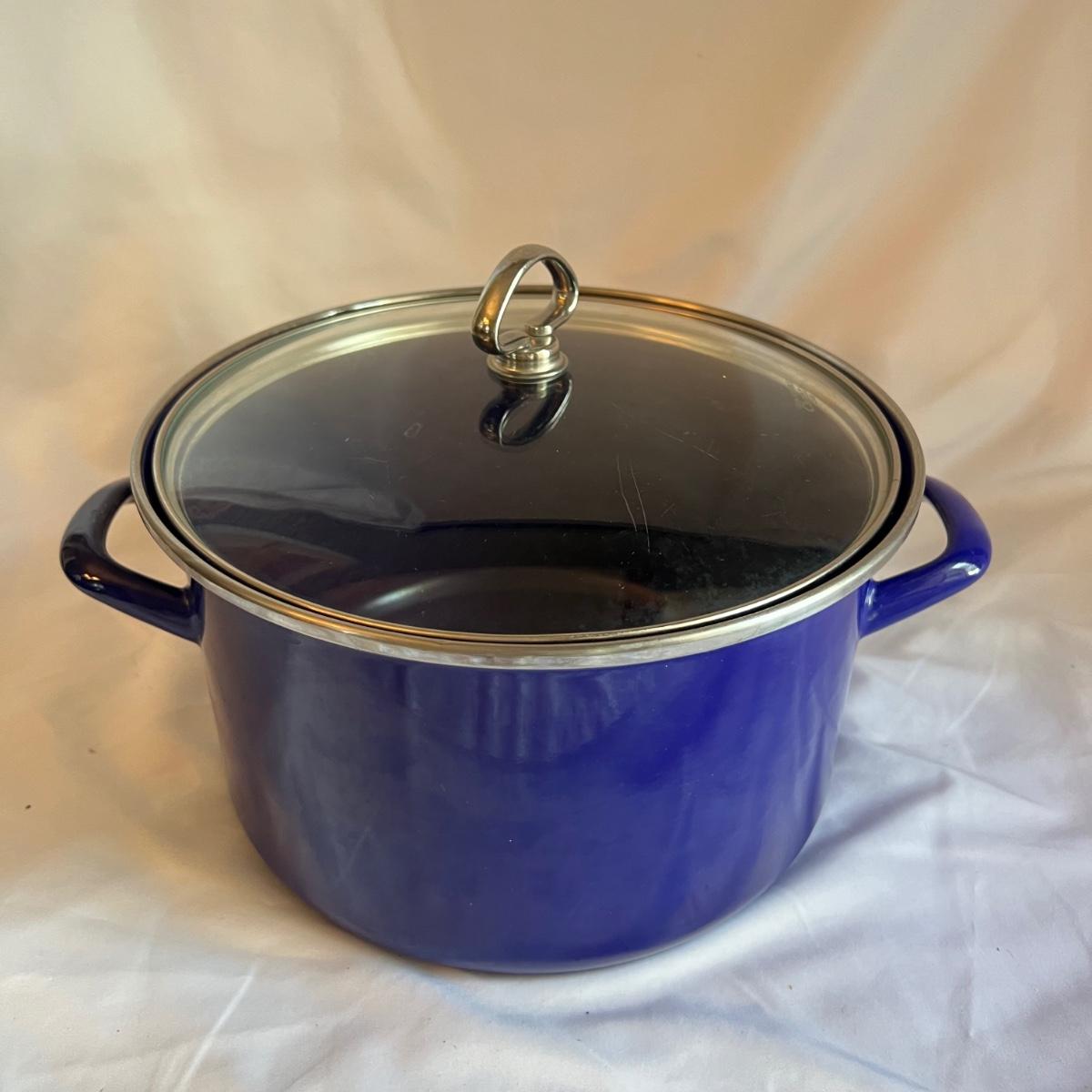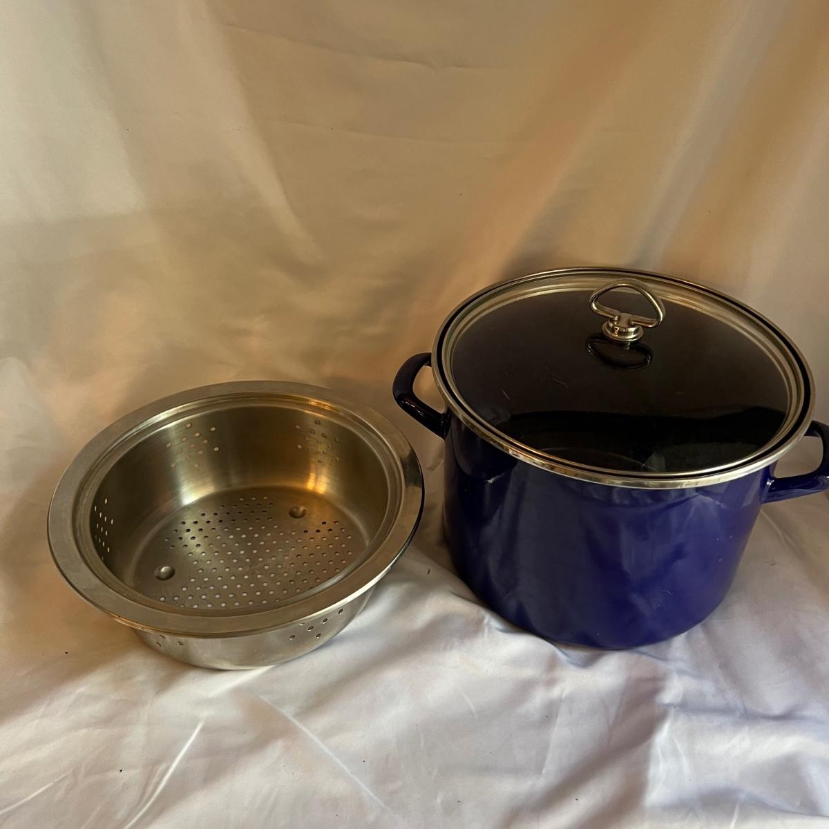 A complete set of royal blue Chantal Cookware. Large stockpot with lid measures 11.25”D x 8.25”H and includes a colander that nests inside. Smaller stockpot and lid measures 10”D x 6”H. The frying pan measures 9.5”D x 2”H. The sauce pot and lid is 7.25”D x 3.25”H and the small sauce pot and lid is 5.75”D x 3.25”H. The lot also includes a royal blue colander that is 10”D x 4.25”H