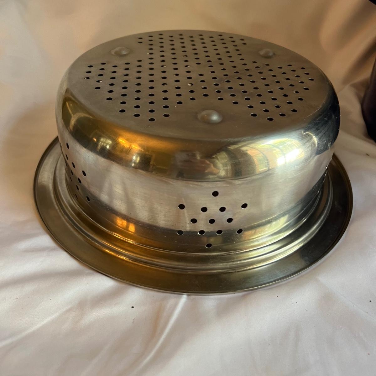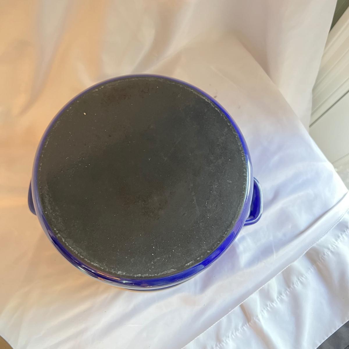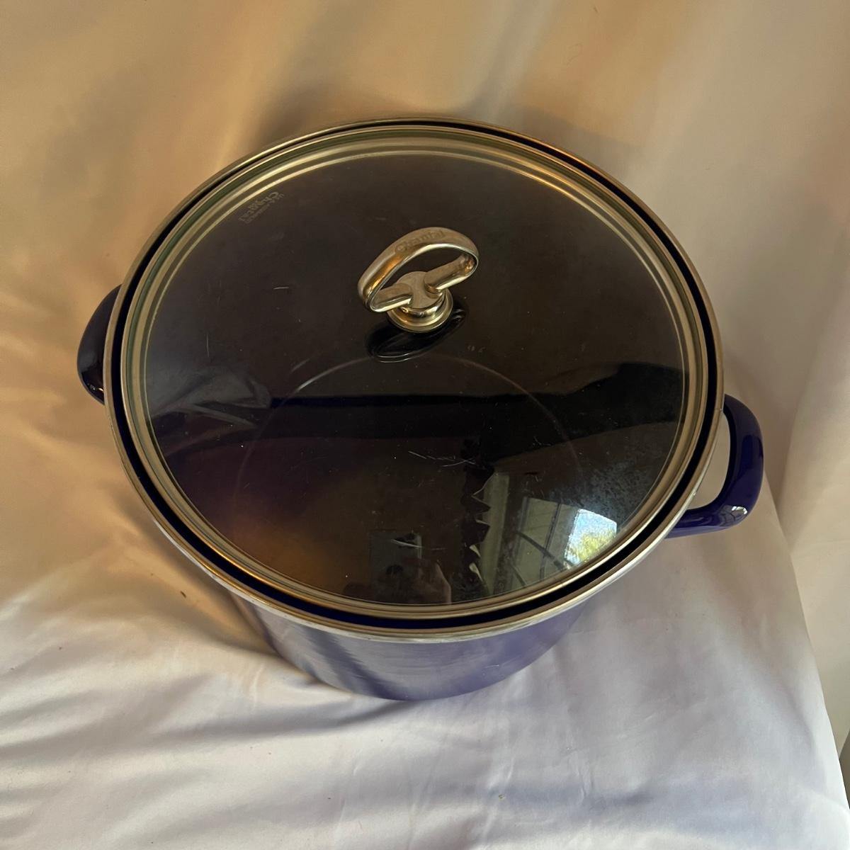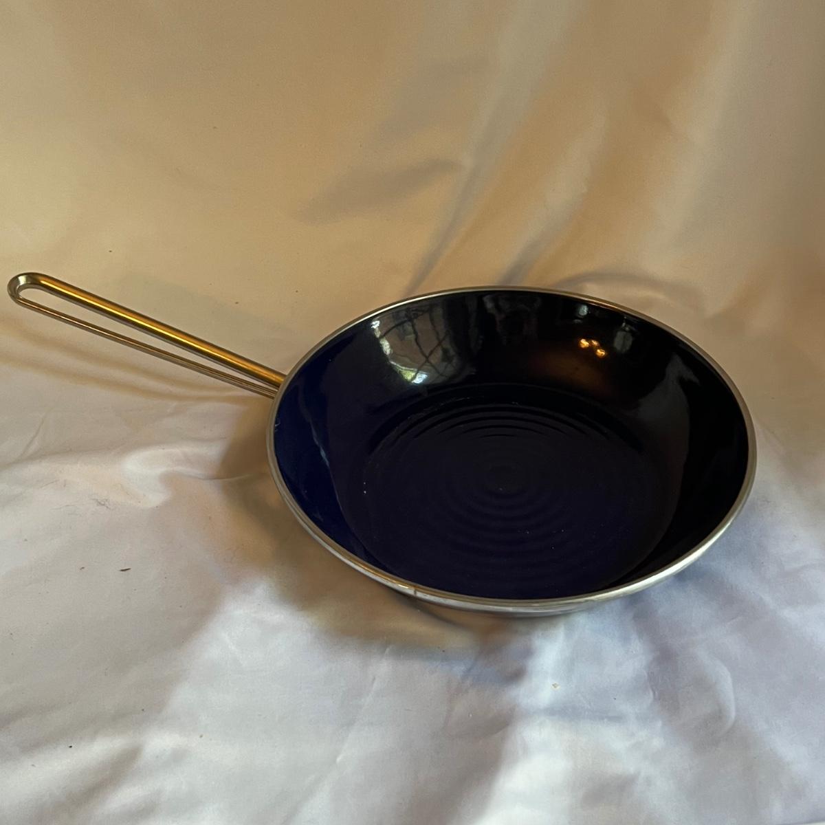 A complete set of royal blue Chantal Cookware. Large stockpot with lid measures 11.25”D x 8.25”H and includes a colander that nests inside. Smaller stockpot and lid measures 10”D x 6”H. The frying pan measures 9.5”D x 2”H. The sauce pot and lid is 7.25”D x 3.25”H and the small sauce pot and lid is 5.75”D x 3.25”H. The lot also includes a royal blue colander that is 10”D x 4.25”H