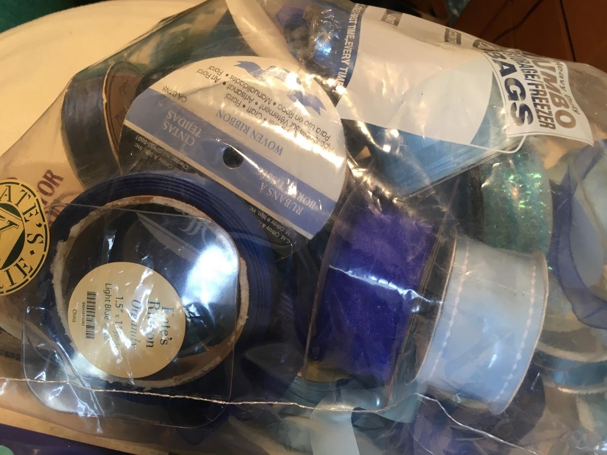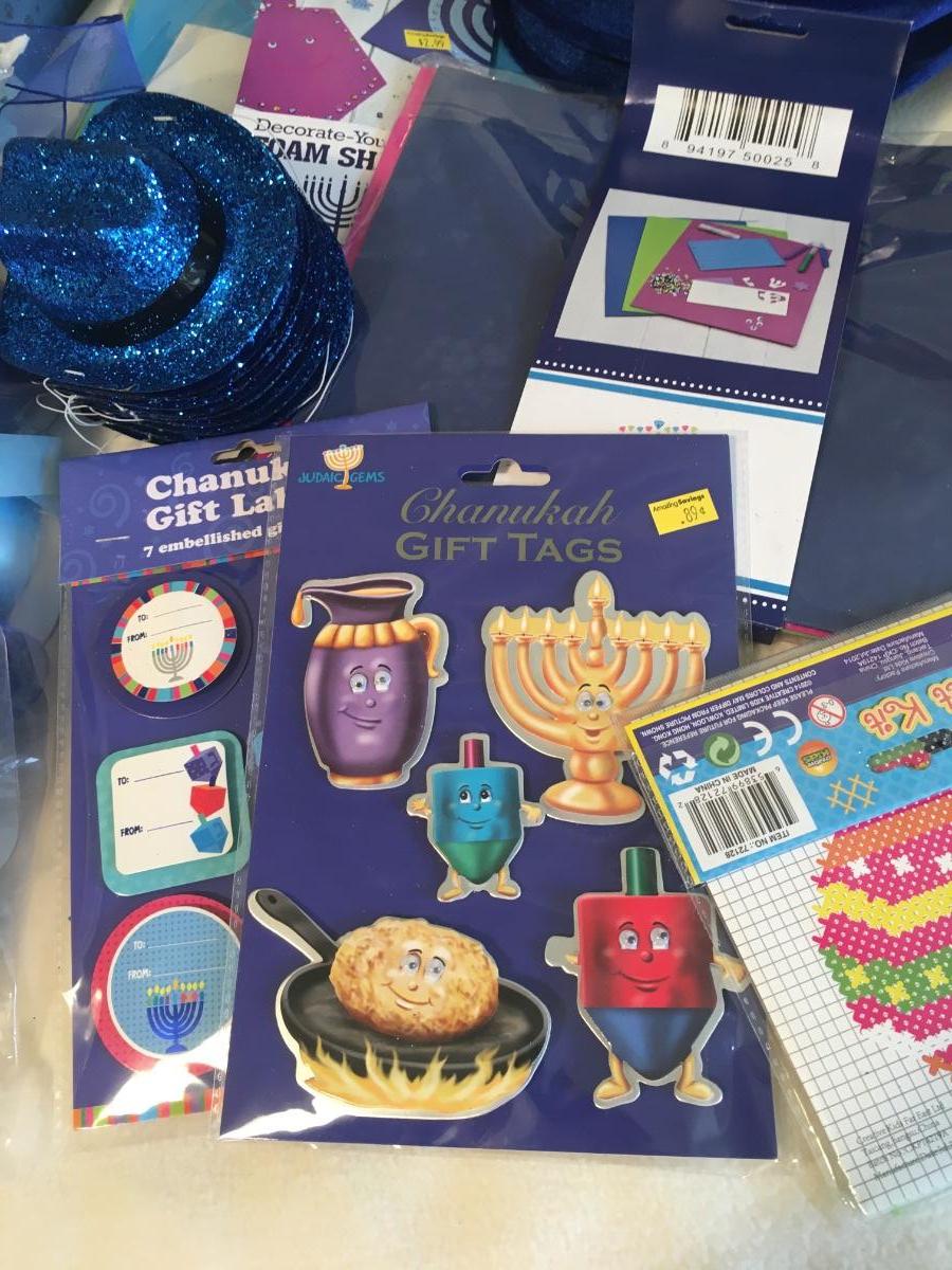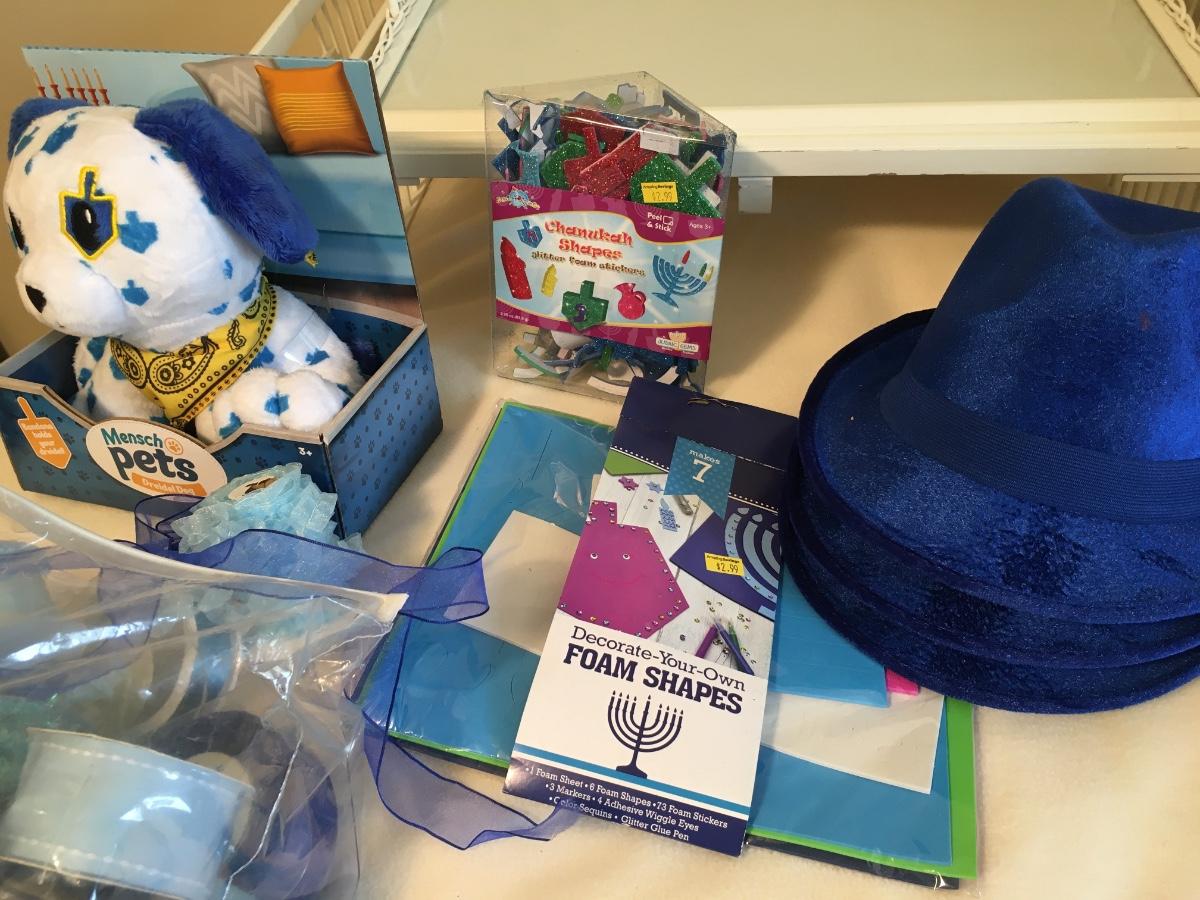 Assorted items for the holiday including ribbon, gift tags, needlepoint, hats and stuffed animal.