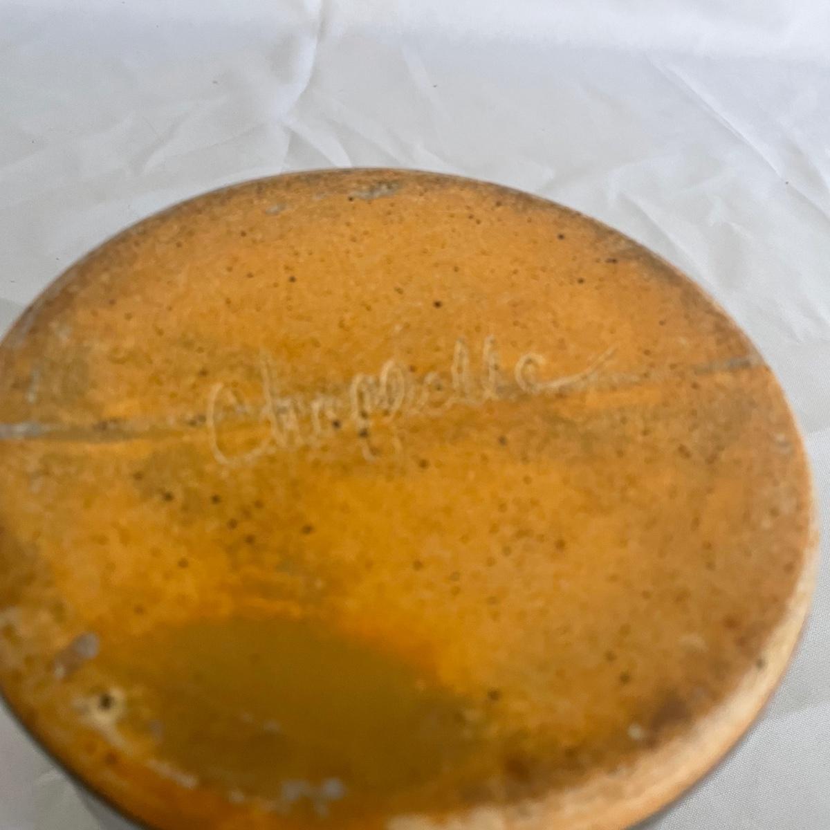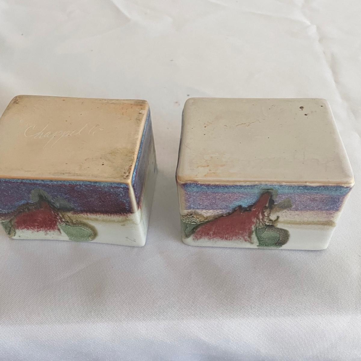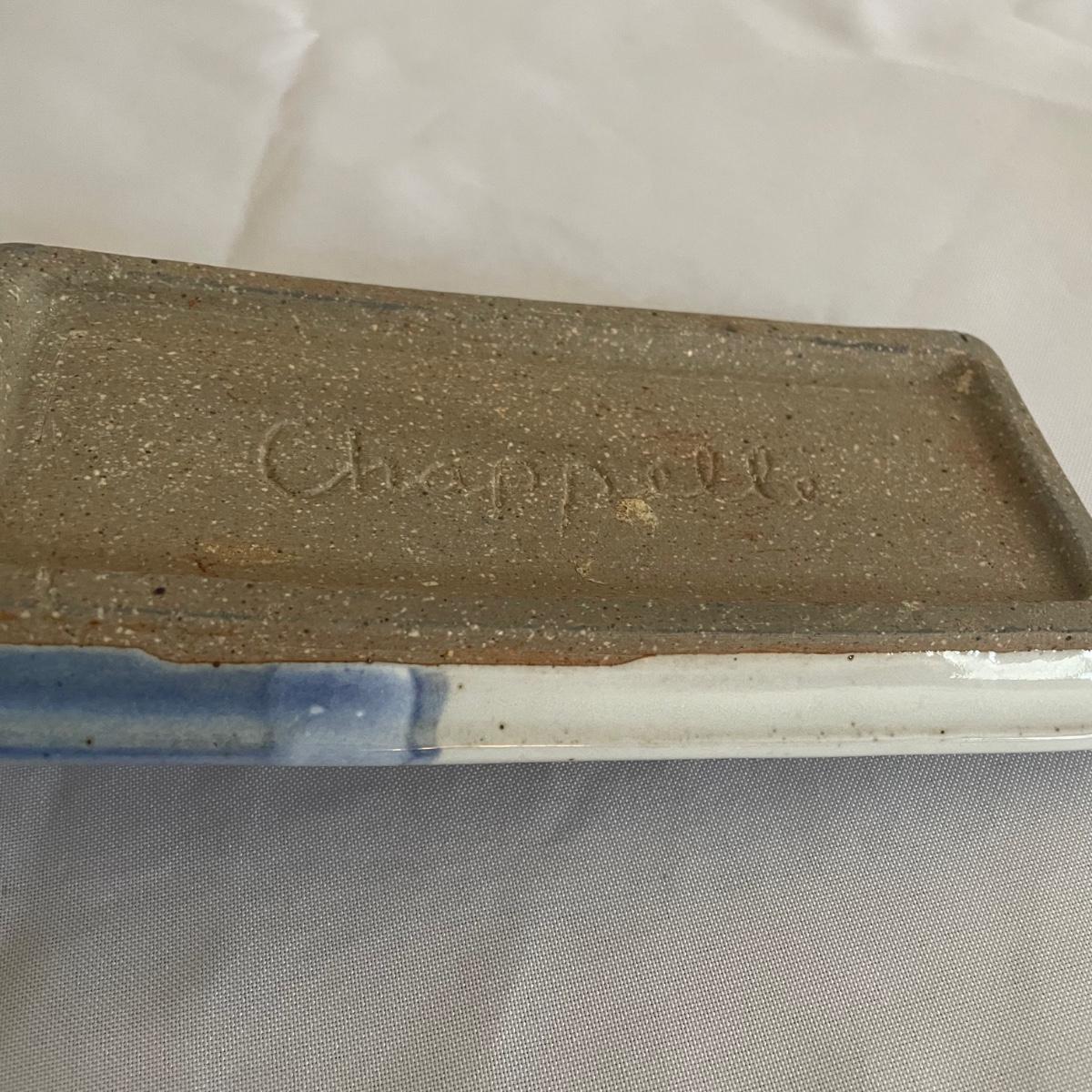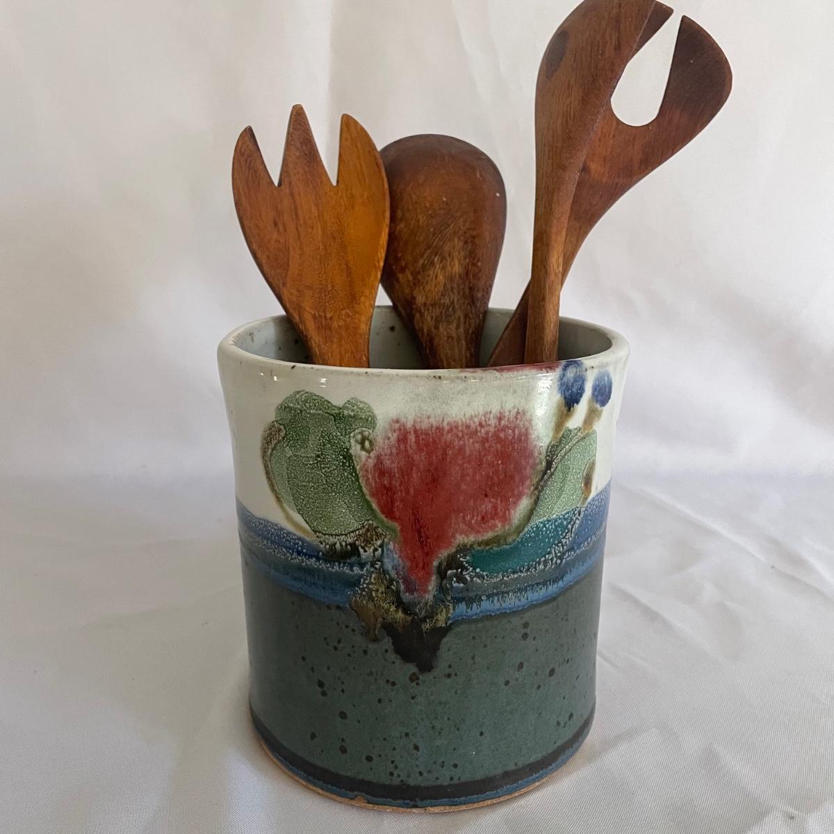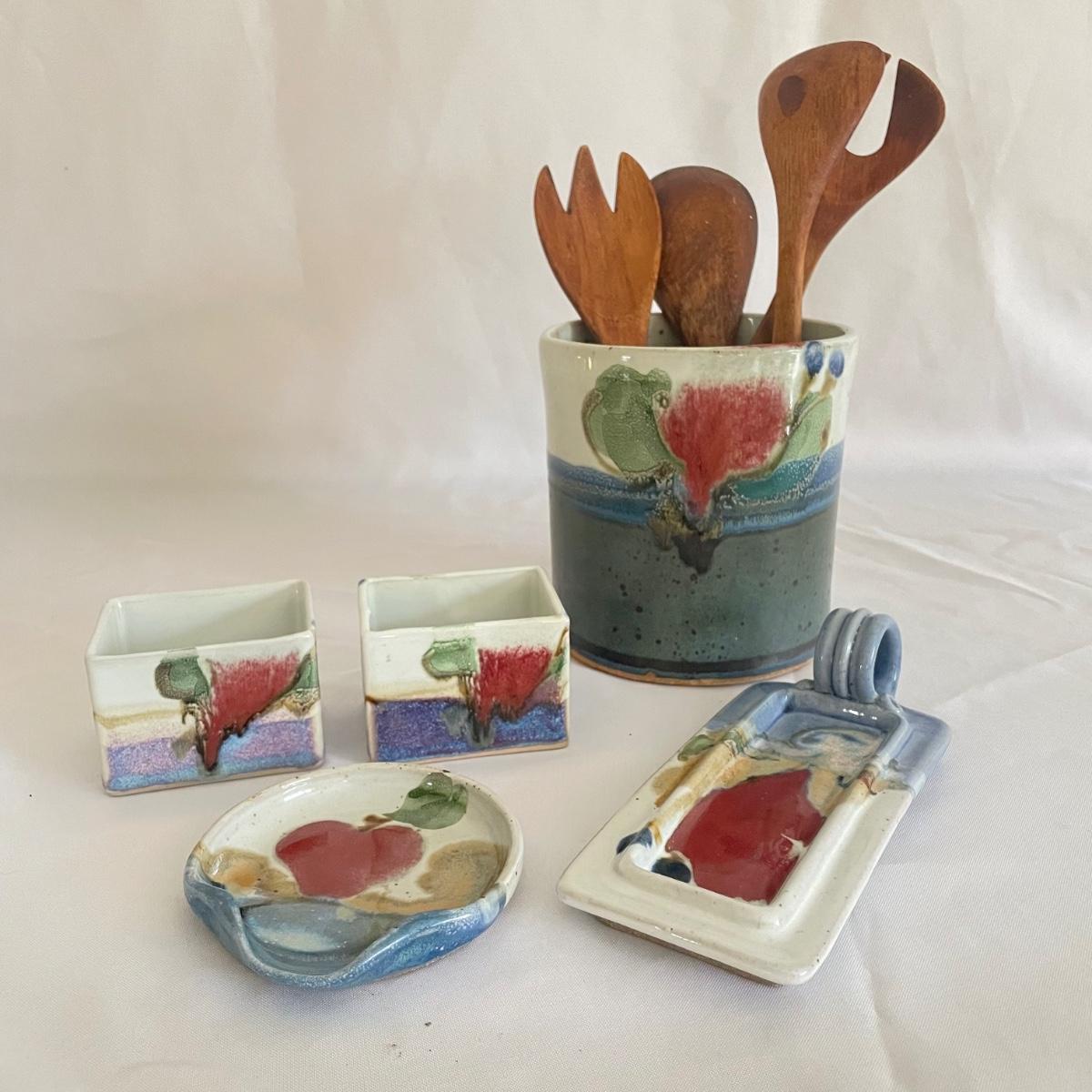 Five Chapelle pottery pieces here that includes a utensil holder with wooden utensils included (measures 5.5” d x 6” tall), spoon rest, butter dish and two condiment containers that measure 3” x 2.5” x 2.5”.