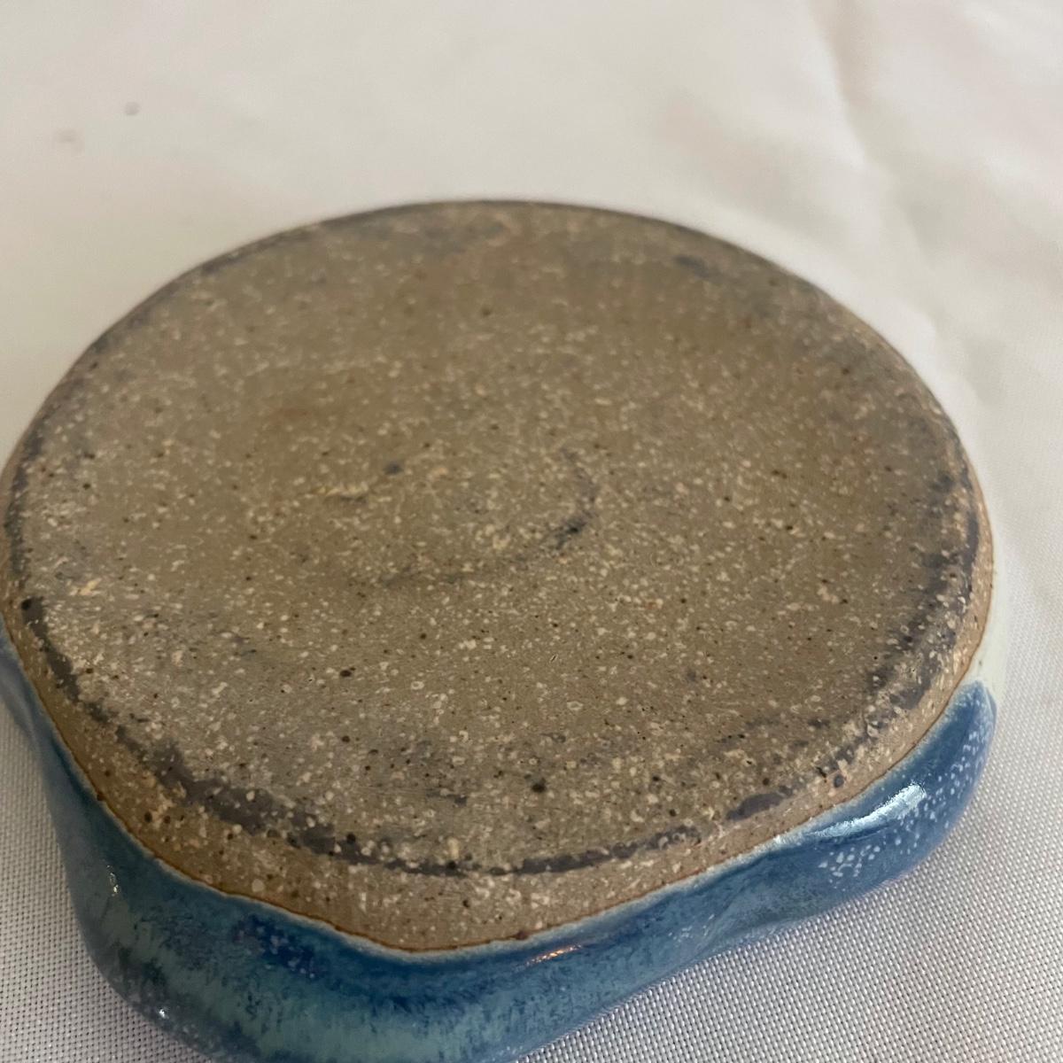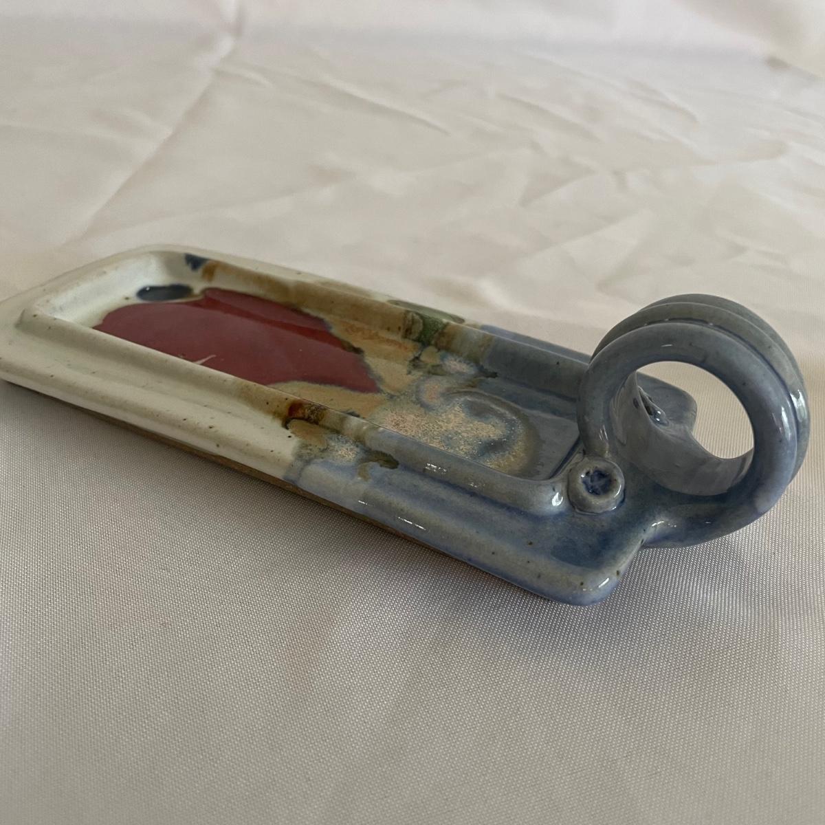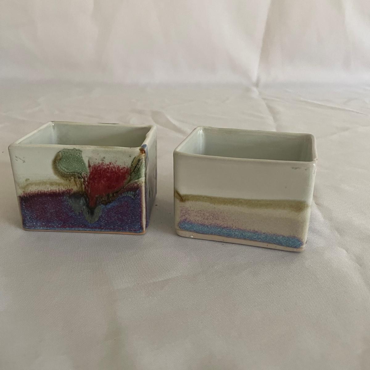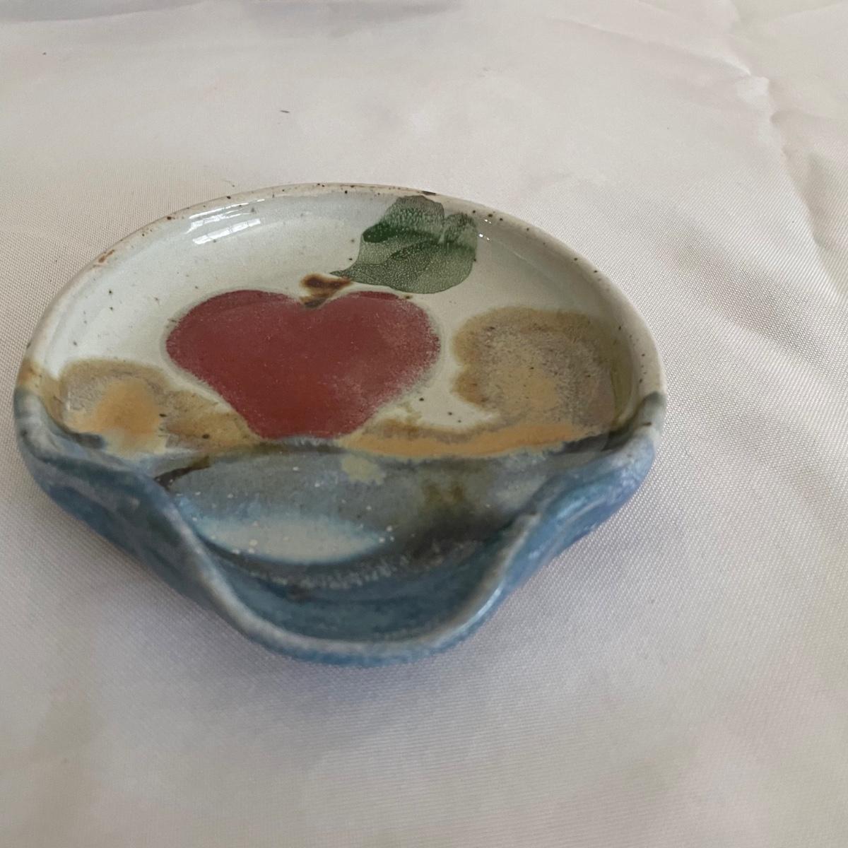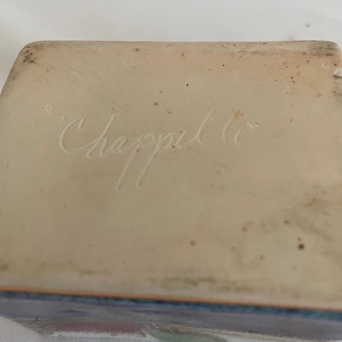 Five Chapelle pottery pieces here that includes a utensil holder with wooden utensils included (measures 5.5” d x 6” tall), spoon rest, butter dish and two condiment containers that measure 3” x 2.5” x 2.5”.