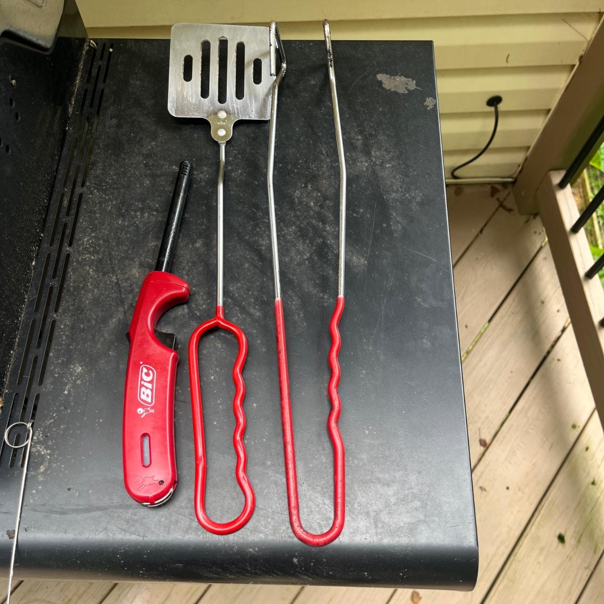 Lot includes a four burner Char Broil grill with one side burner. Also includes two grilling utensils. Grill measures 54” x 21” x 46”H with lid closed. Burners lit when flame was applied.