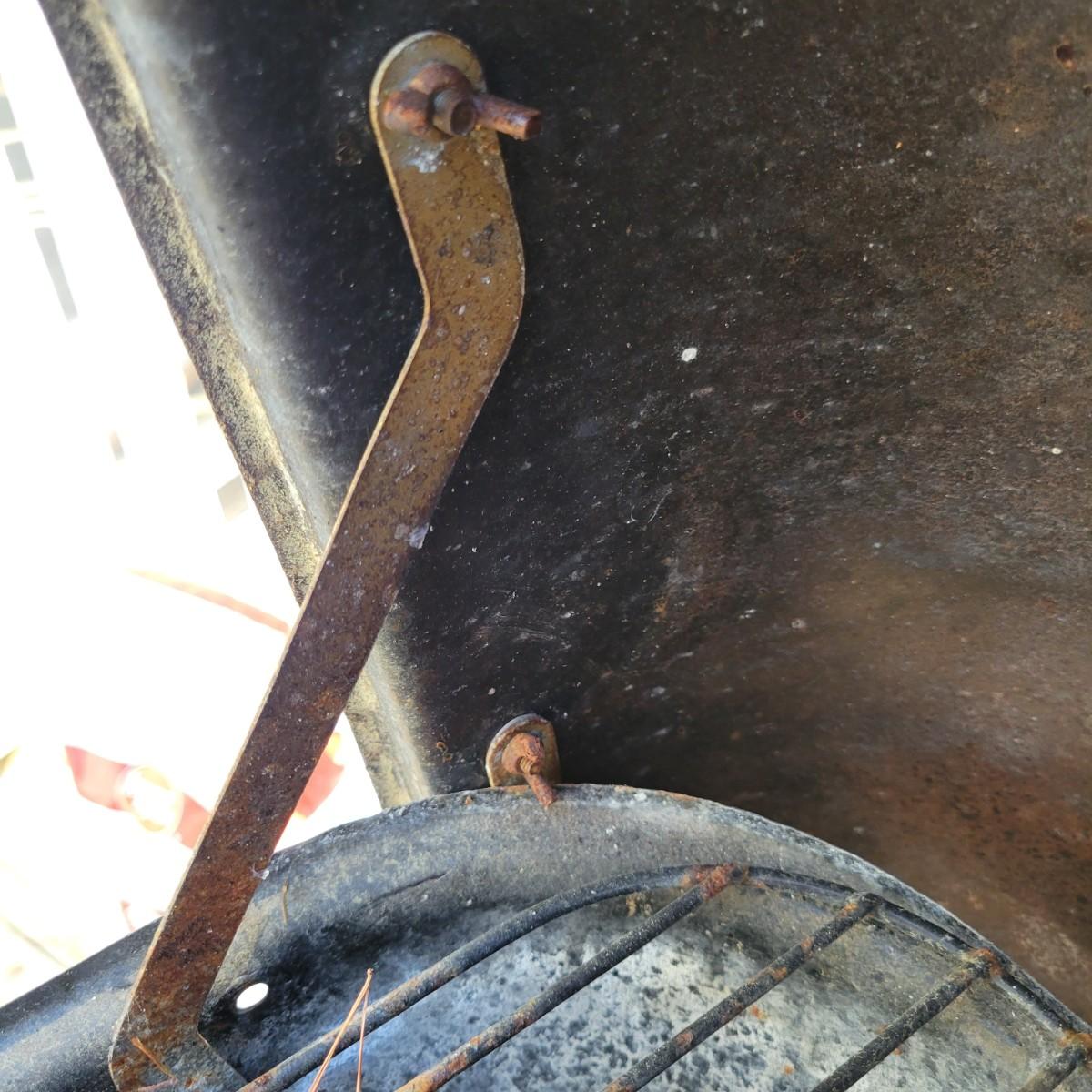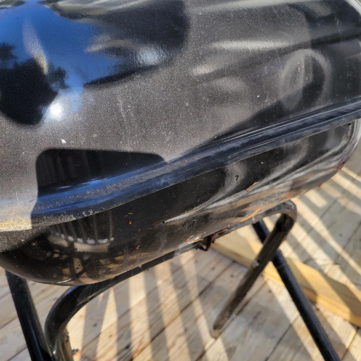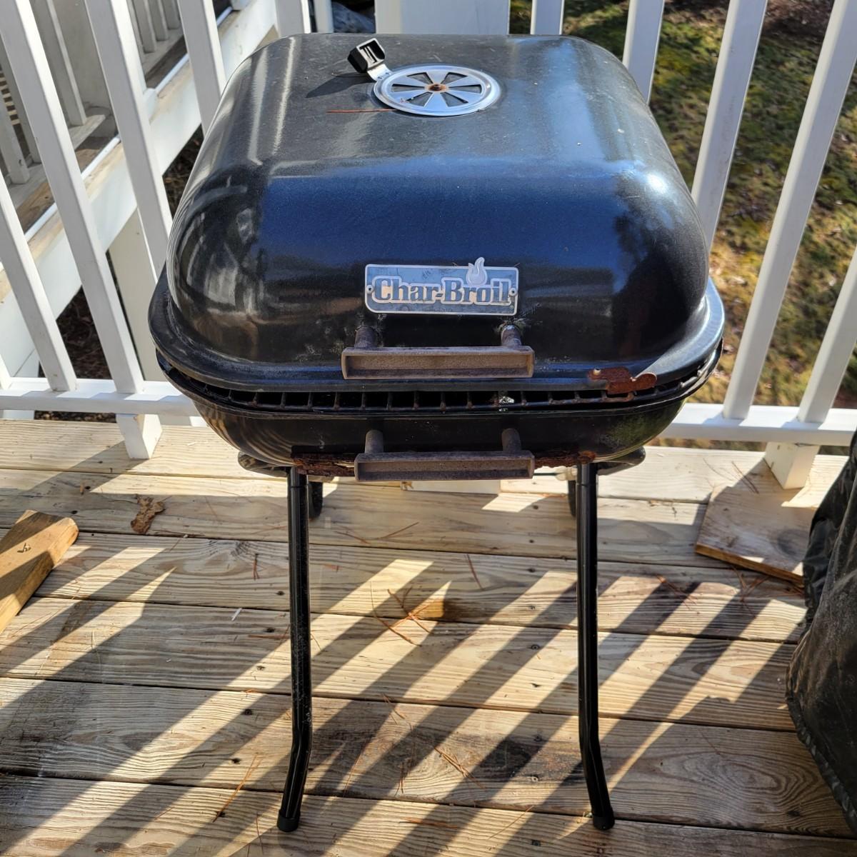 A charcoal grill in fair condition due to rust. One hinge on the lid is missing a screw and the intake plate is severely rusted. This is a Char-Broil grill that folds up for convenient storage when not in use. Overall body of the grill is in good shape, but will likely need the intake plate replaced. Also includes an unopened bag of briquettes. Measures approximately 19" x 19" x 34". Local pickup only