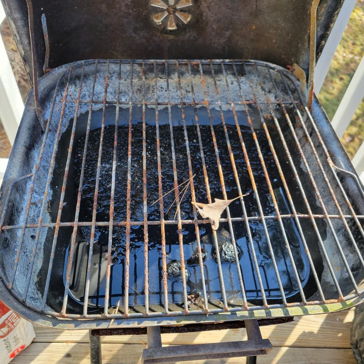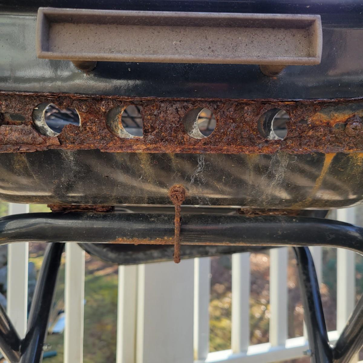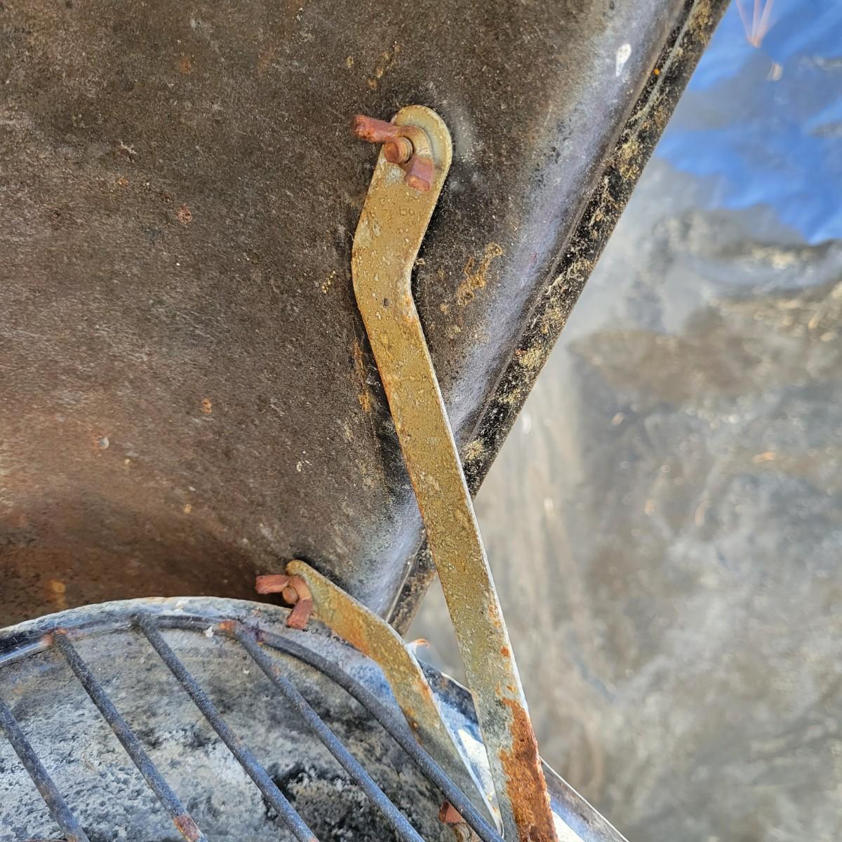 A charcoal grill in fair condition due to rust. One hinge on the lid is missing a screw and the intake plate is severely rusted. This is a Char-Broil grill that folds up for convenient storage when not in use. Overall body of the grill is in good shape, but will likely need the intake plate replaced. Also includes an unopened bag of briquettes. Measures approximately 19" x 19" x 34". Local pickup only