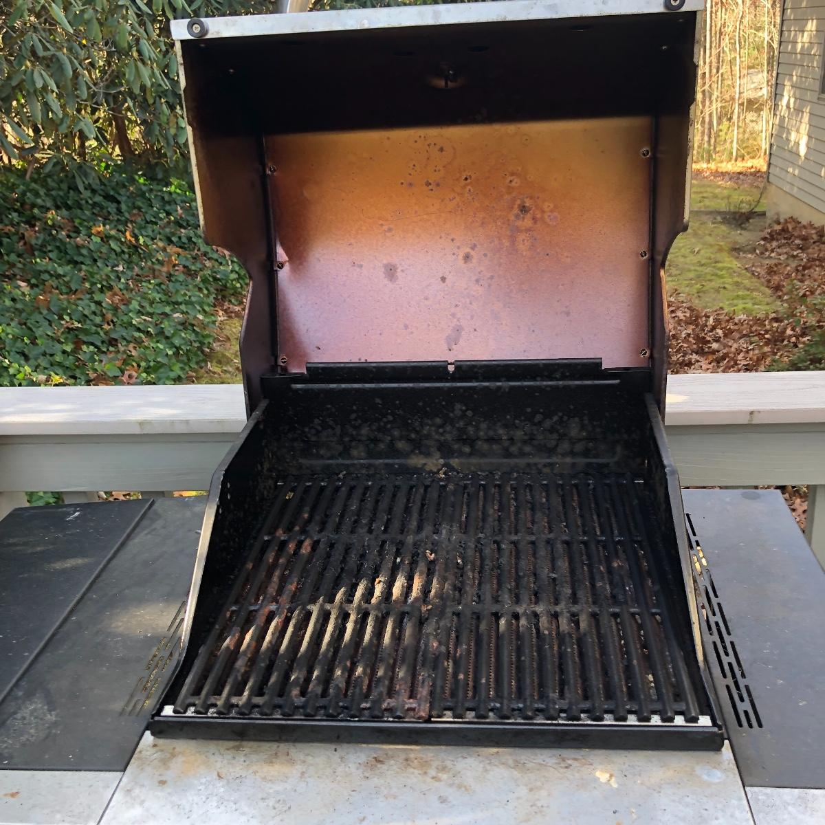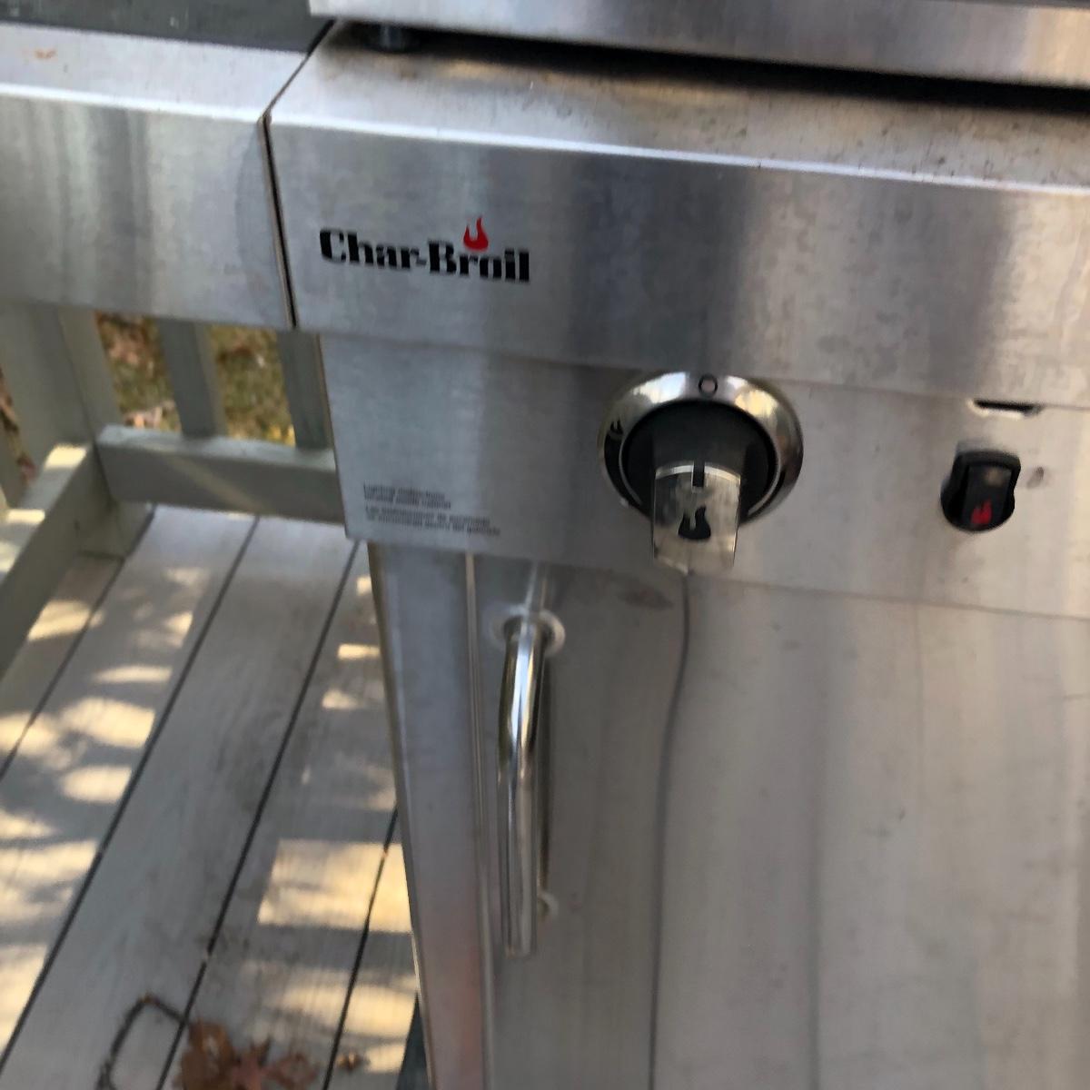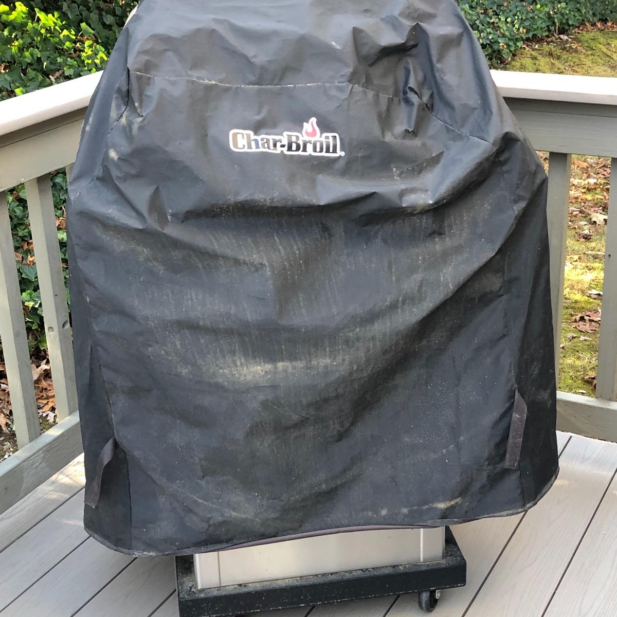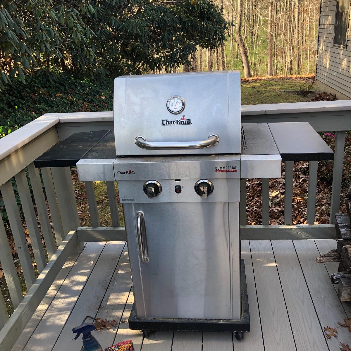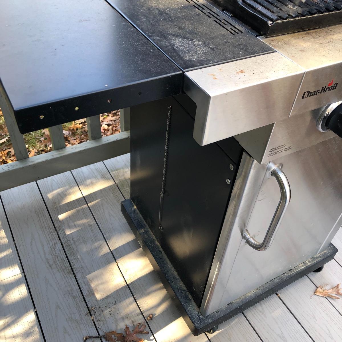 This Char-Broil Grill has collapsible side shelves and comes with a propane tank. This grill moves easily as it is on wheels. It also comes with four grill tools and a cover. It measures (with sides collapsed) 31.5” x 21.5” x 50”. Local pick up only.
