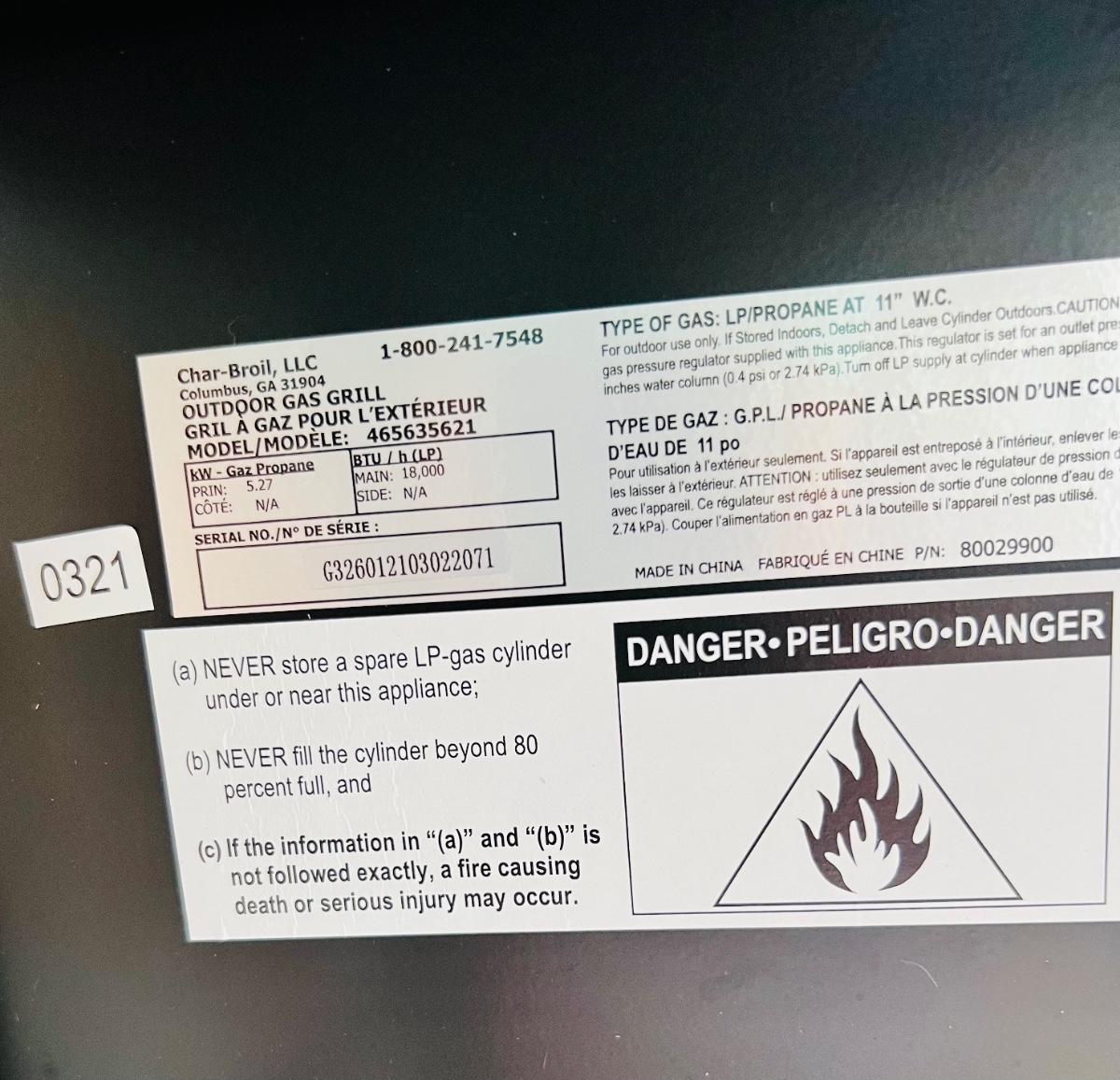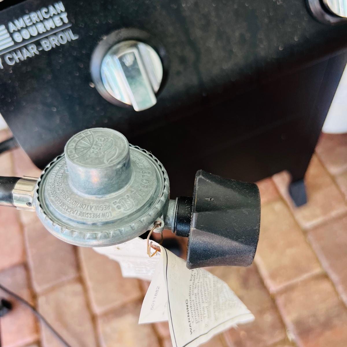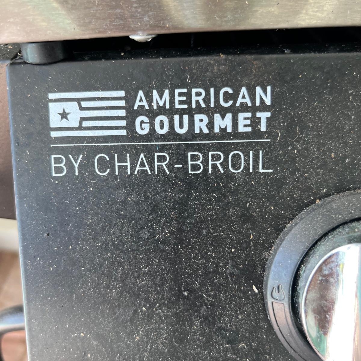 Char-Grill American Gourmet Grill. Model: 465635621. Includes two propane tanks and grilling utensils. Working condition, needs cleaning. Rhino propane tank not included.