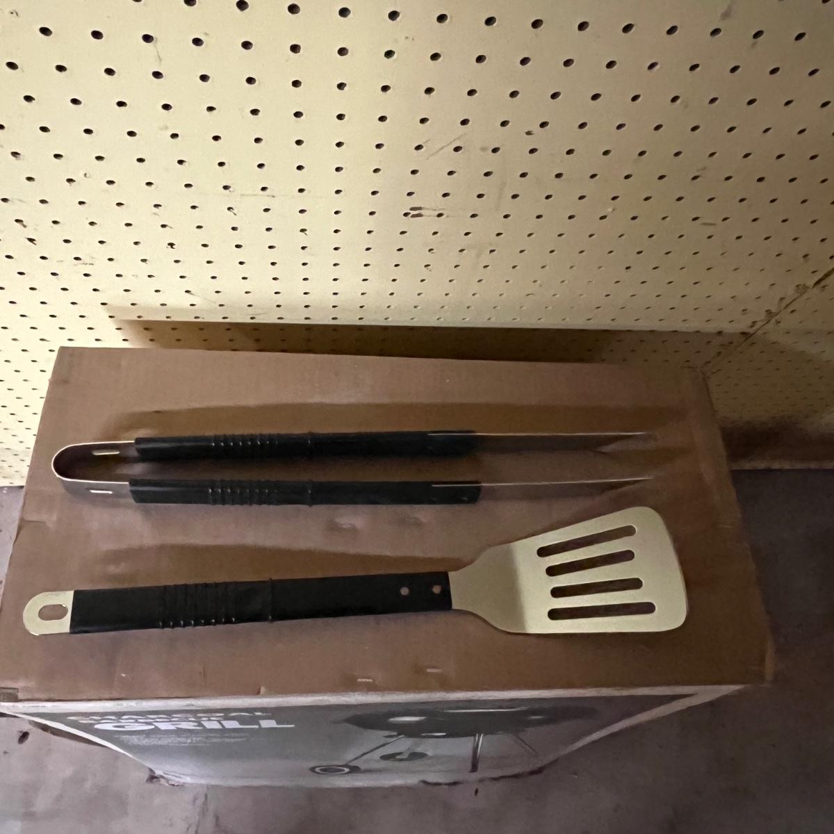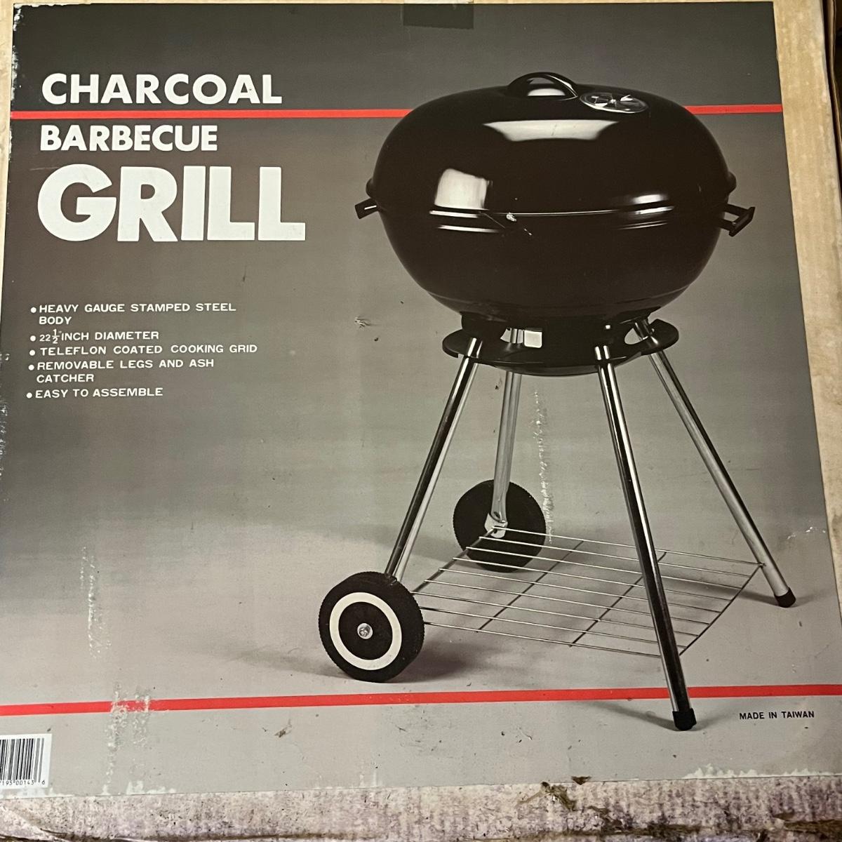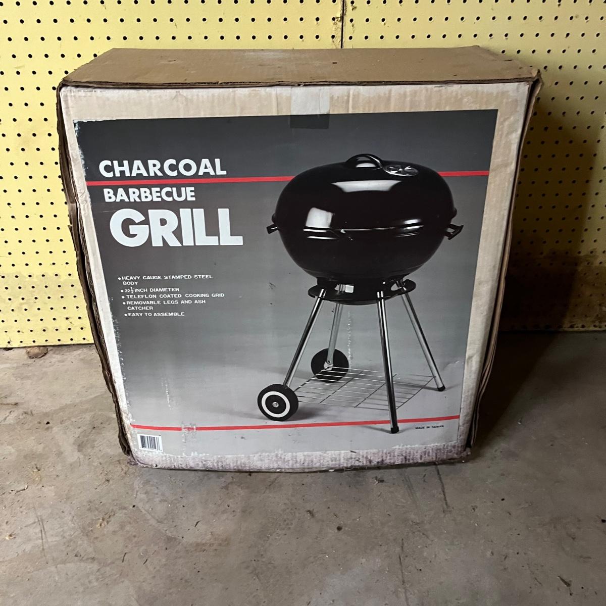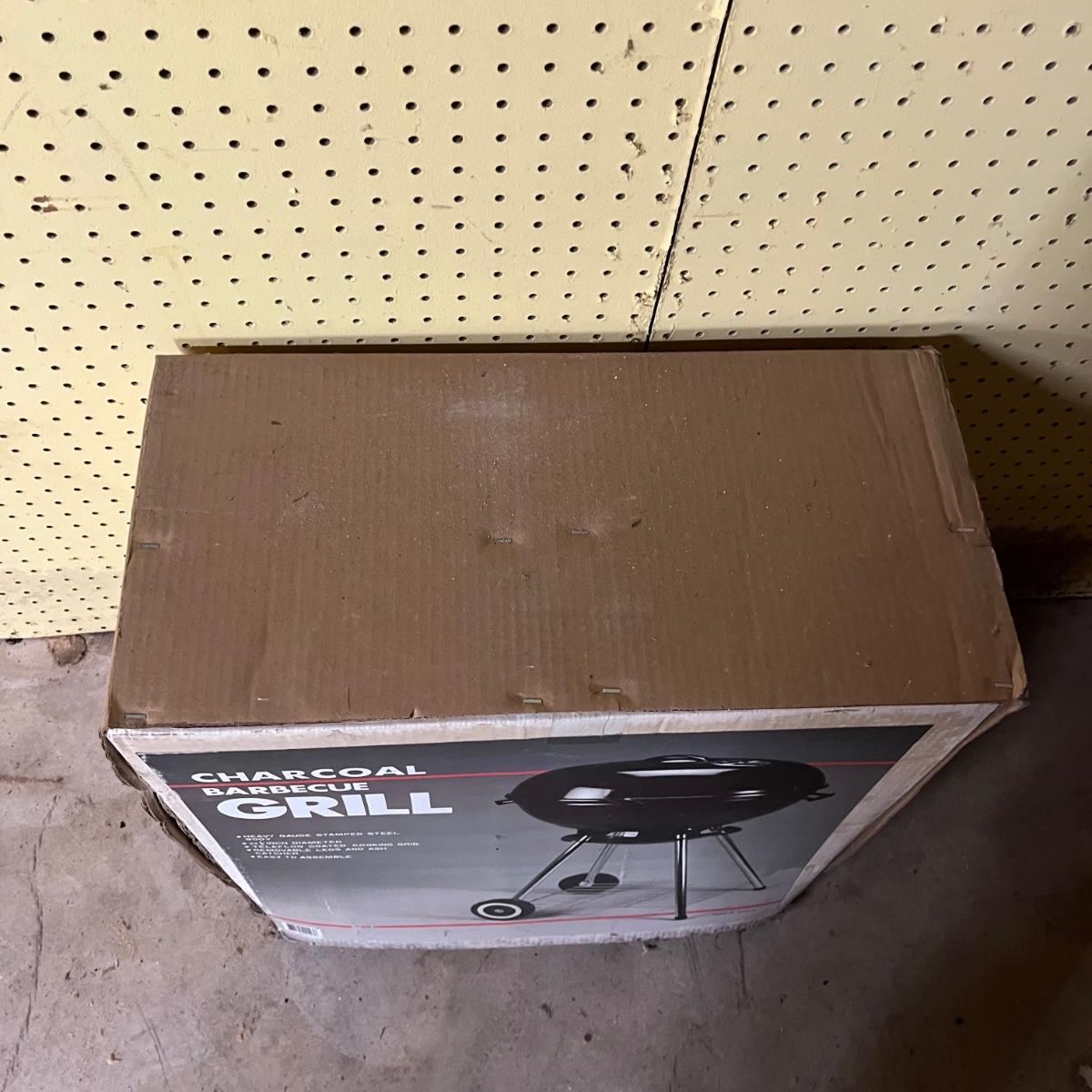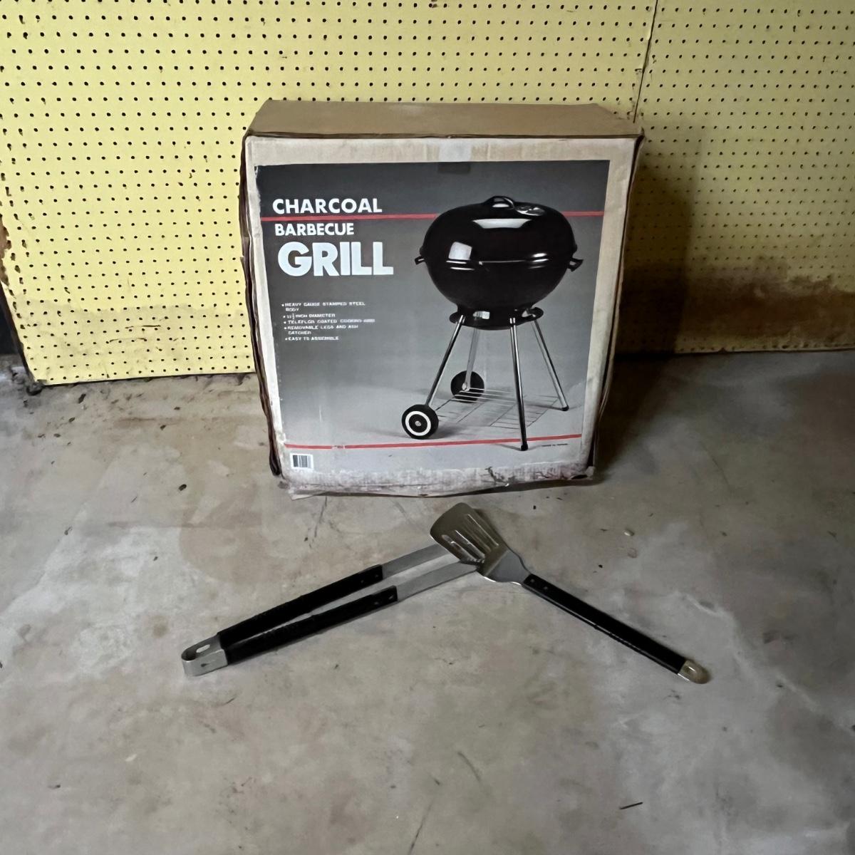 Lot includes a NIB charcoal 22.5” D BBQ grill and BBQ tongs and spatula. Grill is in box but box has gotten wet and appears there may be some minor rust