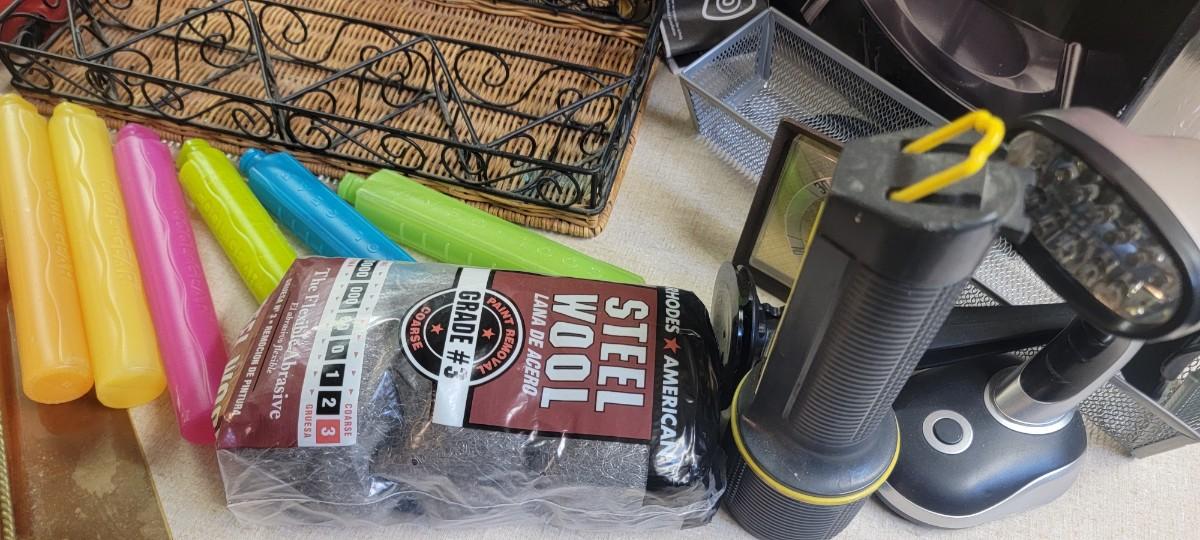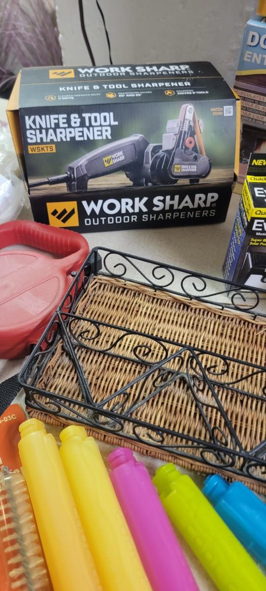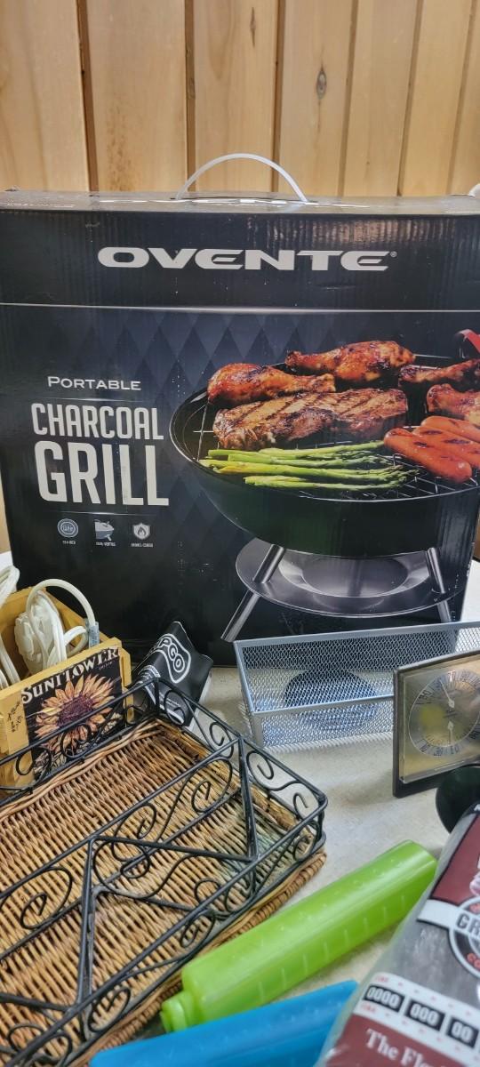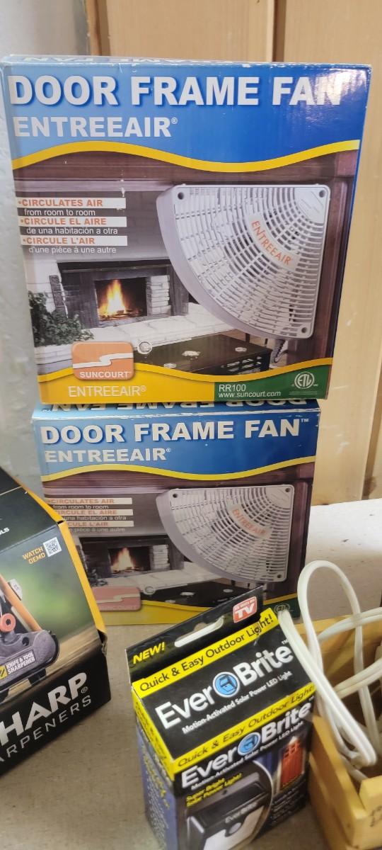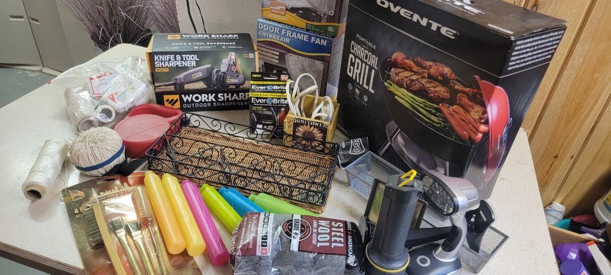 Portable charcoal grill, two door frame fans. Knife and tool sharpener. Plus more items in photo.