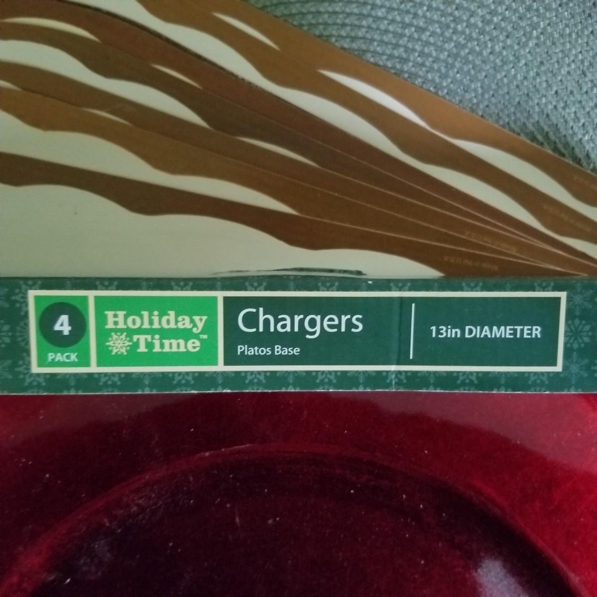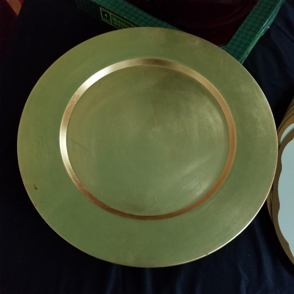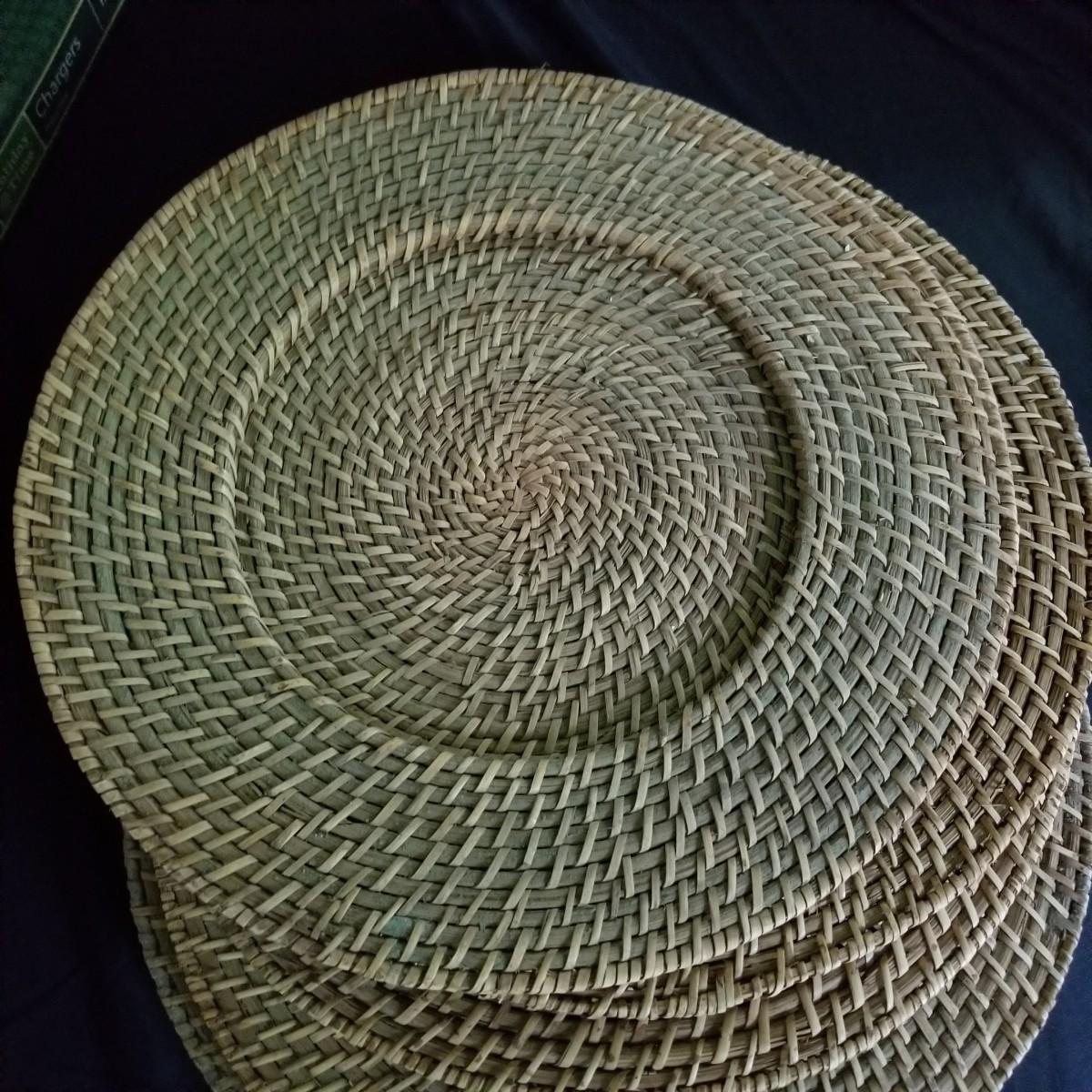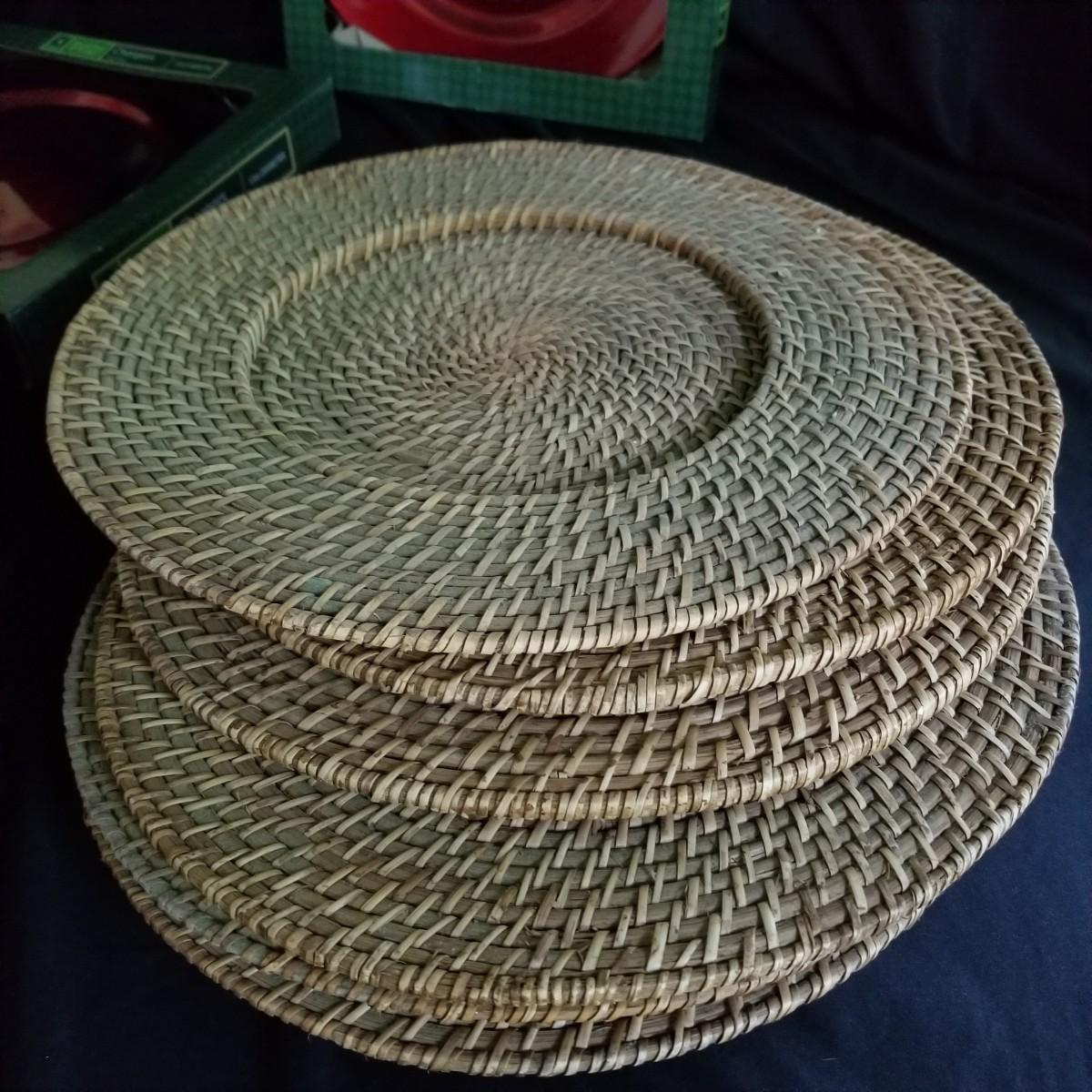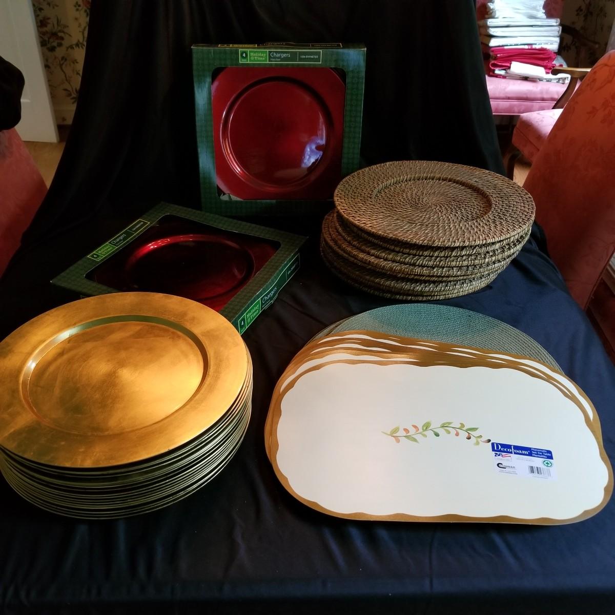 Several different types and styles of chargers and placemats. Seventeen 13" diameter gold plastic chargers. Eight 14" diameter wicker chargers, two boxes new red 13" diameter Holiday Time chargers, eight pieces total. Four 15" diameter green woven placemats and also eight oval 17" x 11" Decofoam placemats. Gold chargers show wear on surface and edges, see photos. All other items but the new in box red ones gently used. Shipping available.