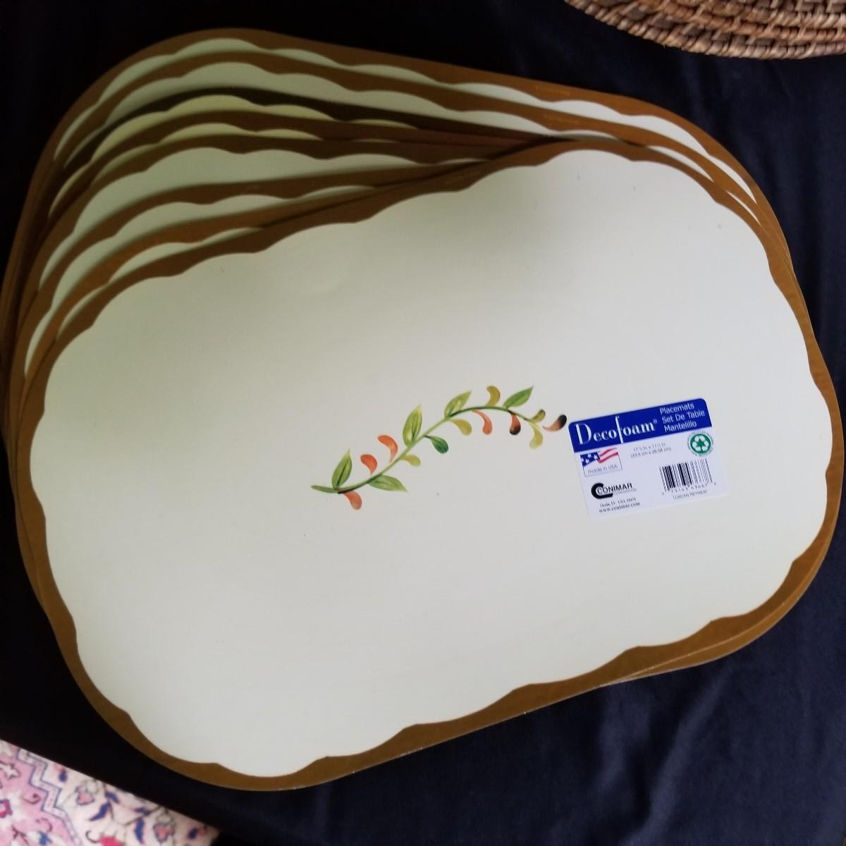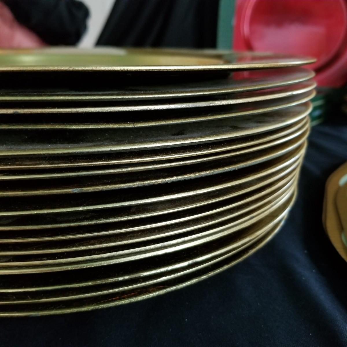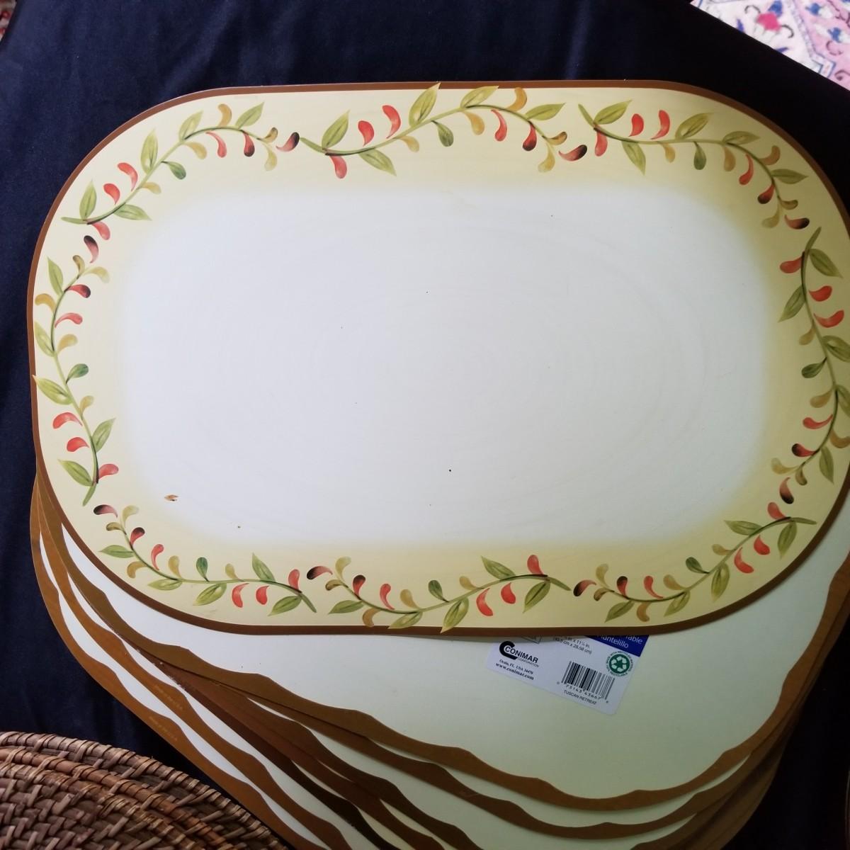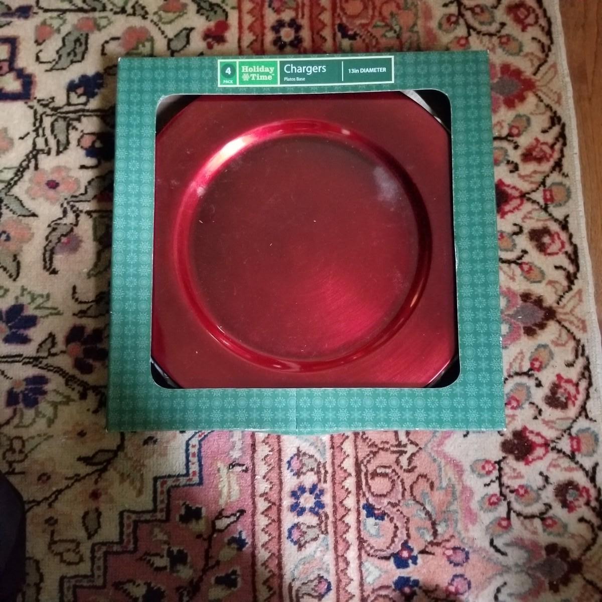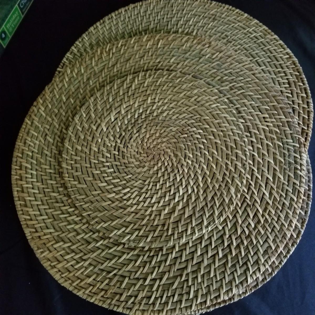 Several different types and styles of chargers and placemats. Seventeen 13" diameter gold plastic chargers. Eight 14" diameter wicker chargers, two boxes new red 13" diameter Holiday Time chargers, eight pieces total. Four 15" diameter green woven placemats and also eight oval 17" x 11" Decofoam placemats. Gold chargers show wear on surface and edges, see photos. All other items but the new in box red ones gently used. Shipping available.