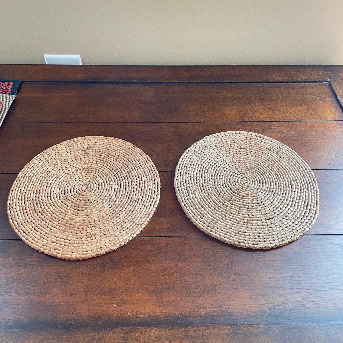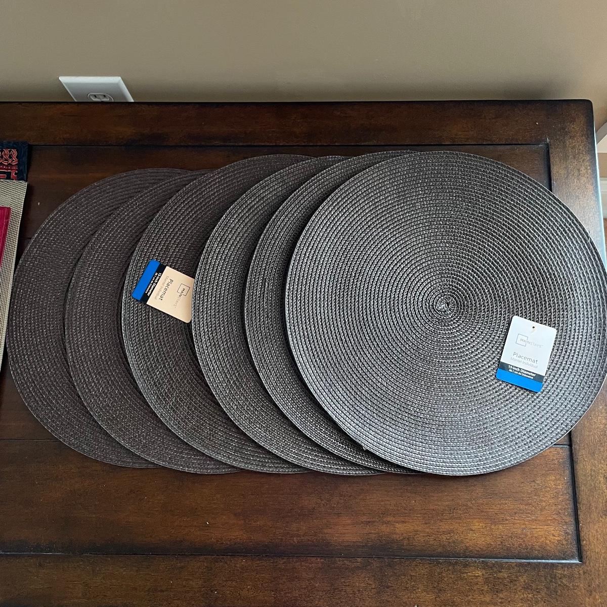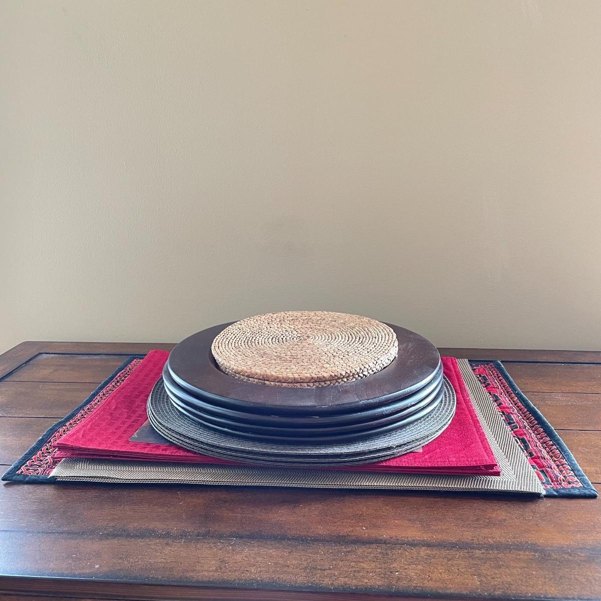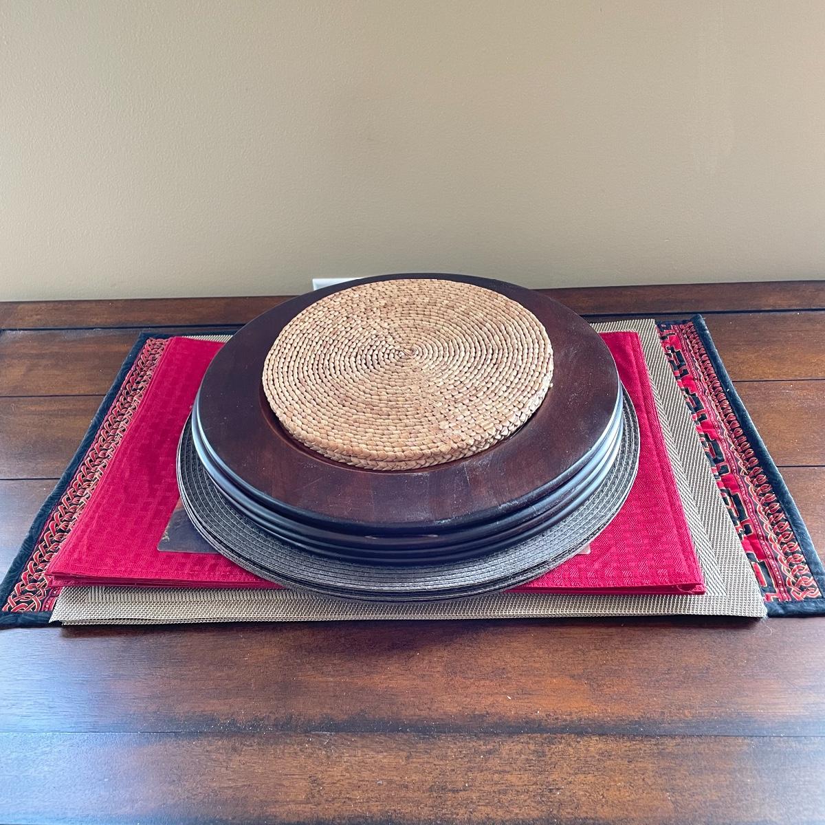 Four 13”d wooden chargers with a 9”d inner basin. Two woven 9” trivets, a 23” x 15” reversible holiday/everyday runner, and a variety of placemats. See images. Local pick up only.