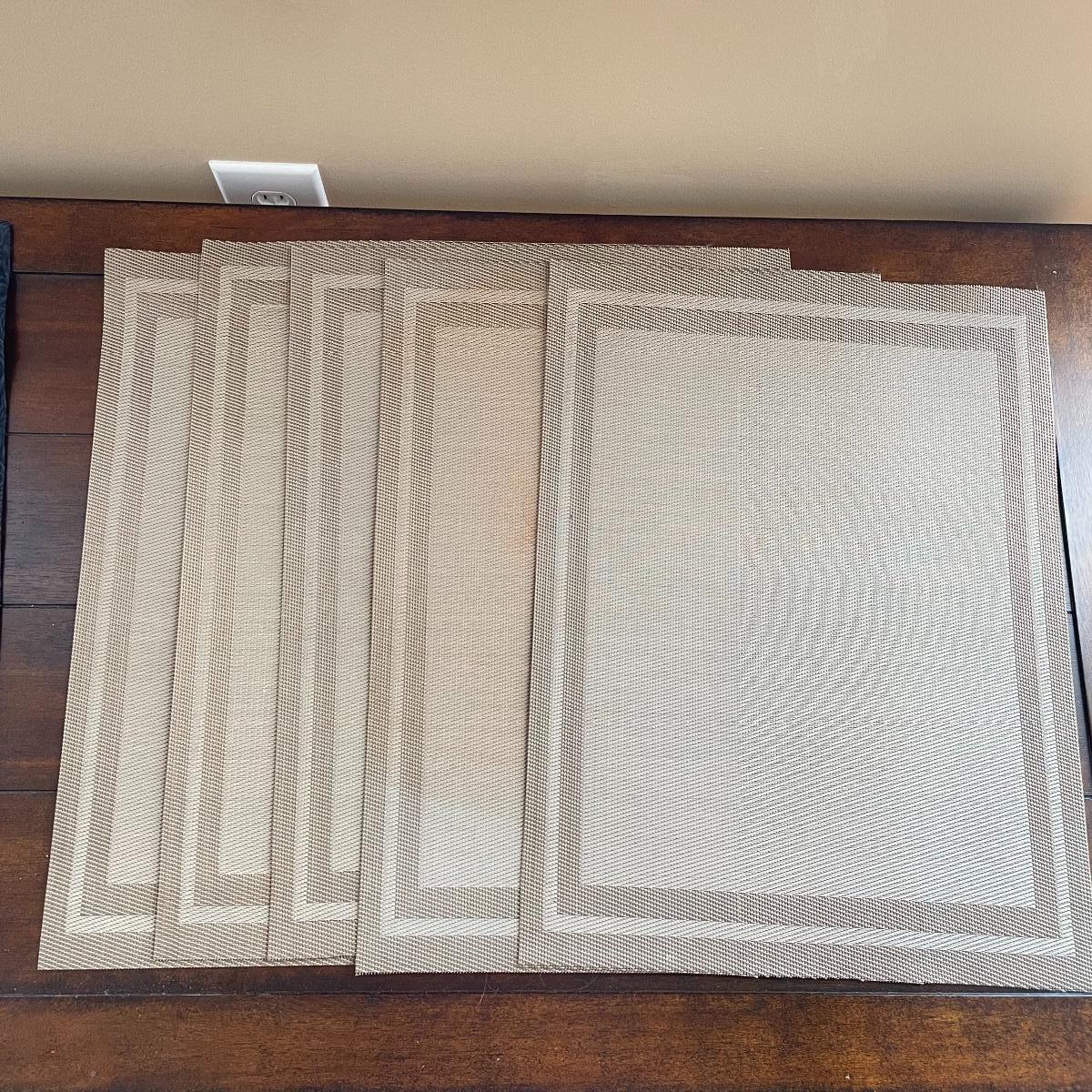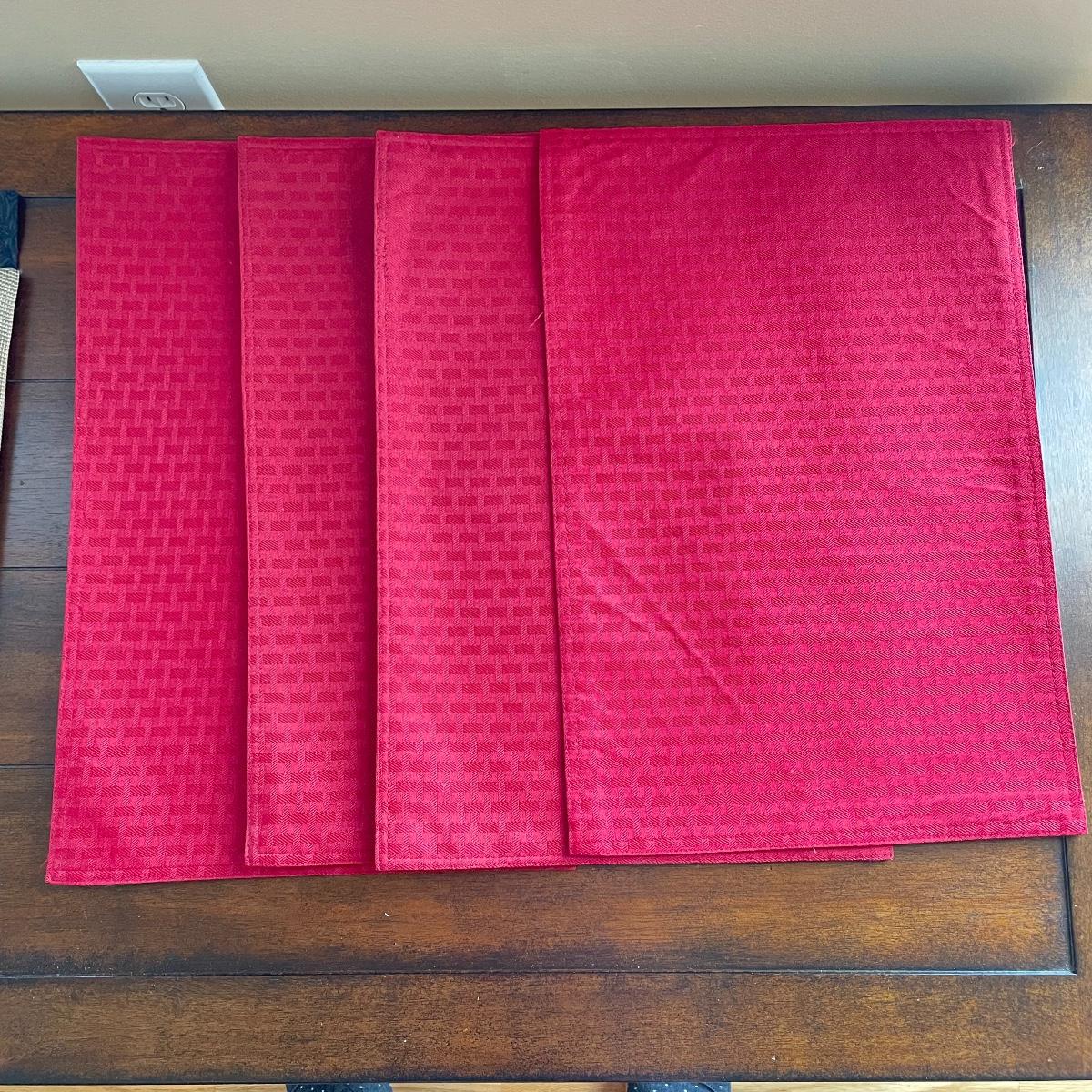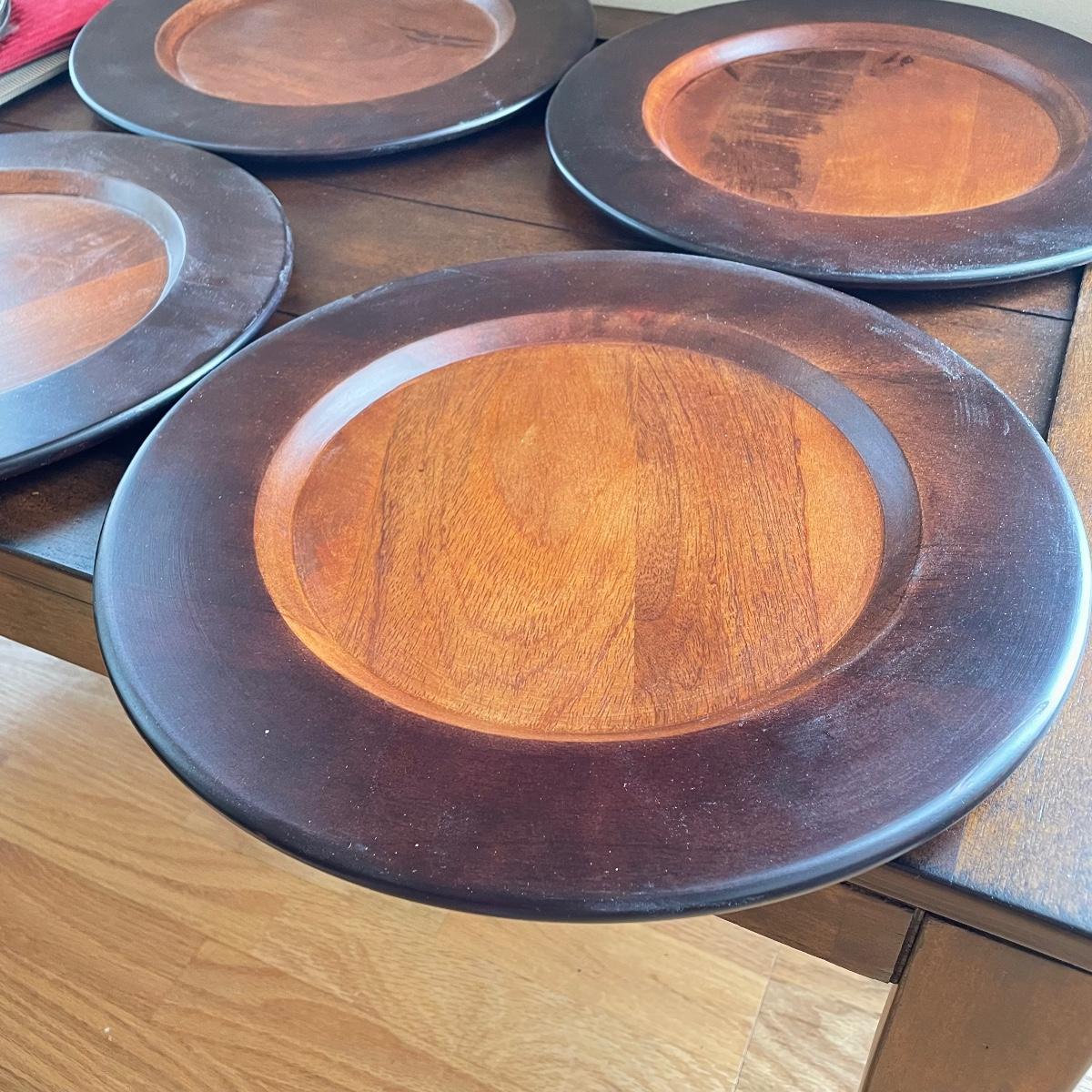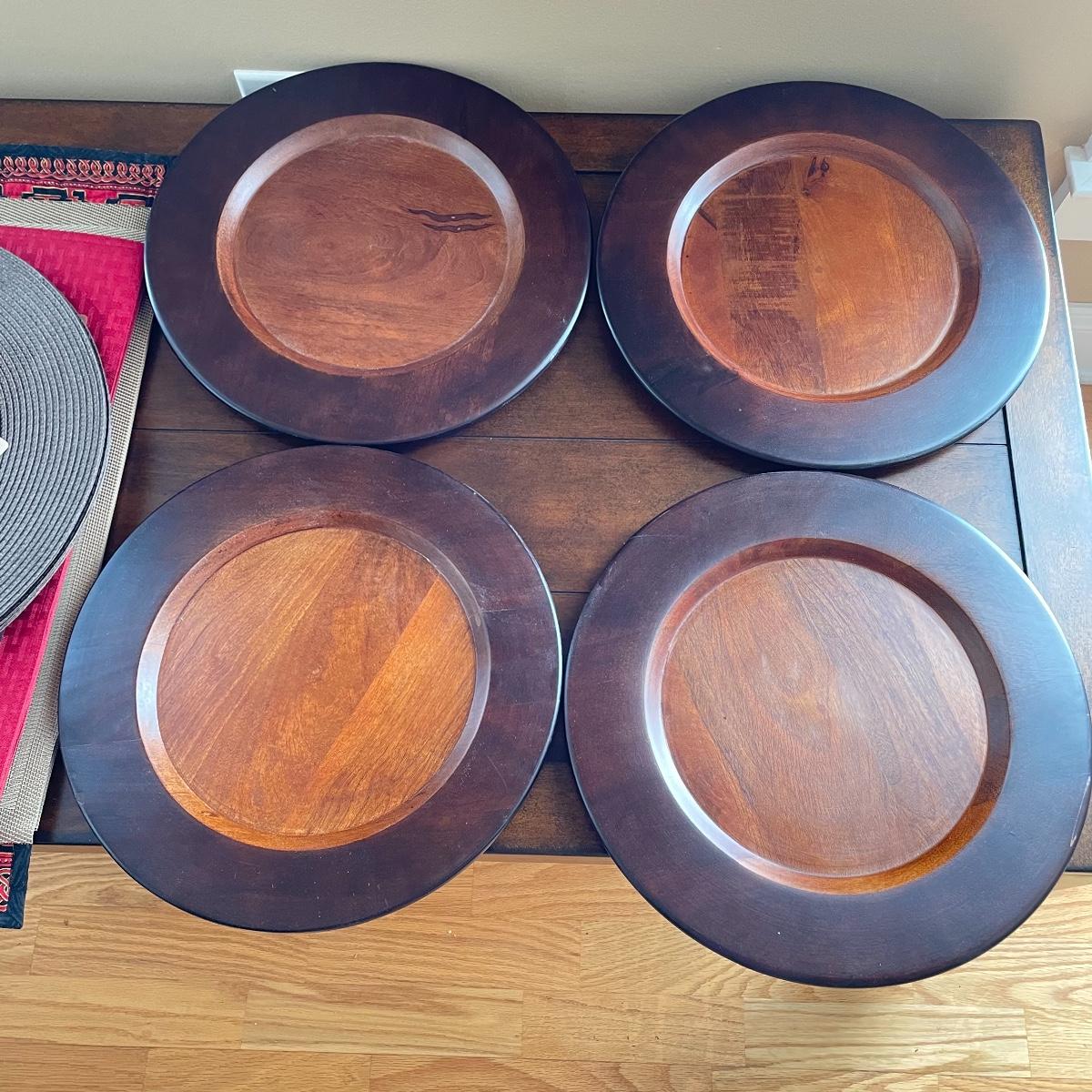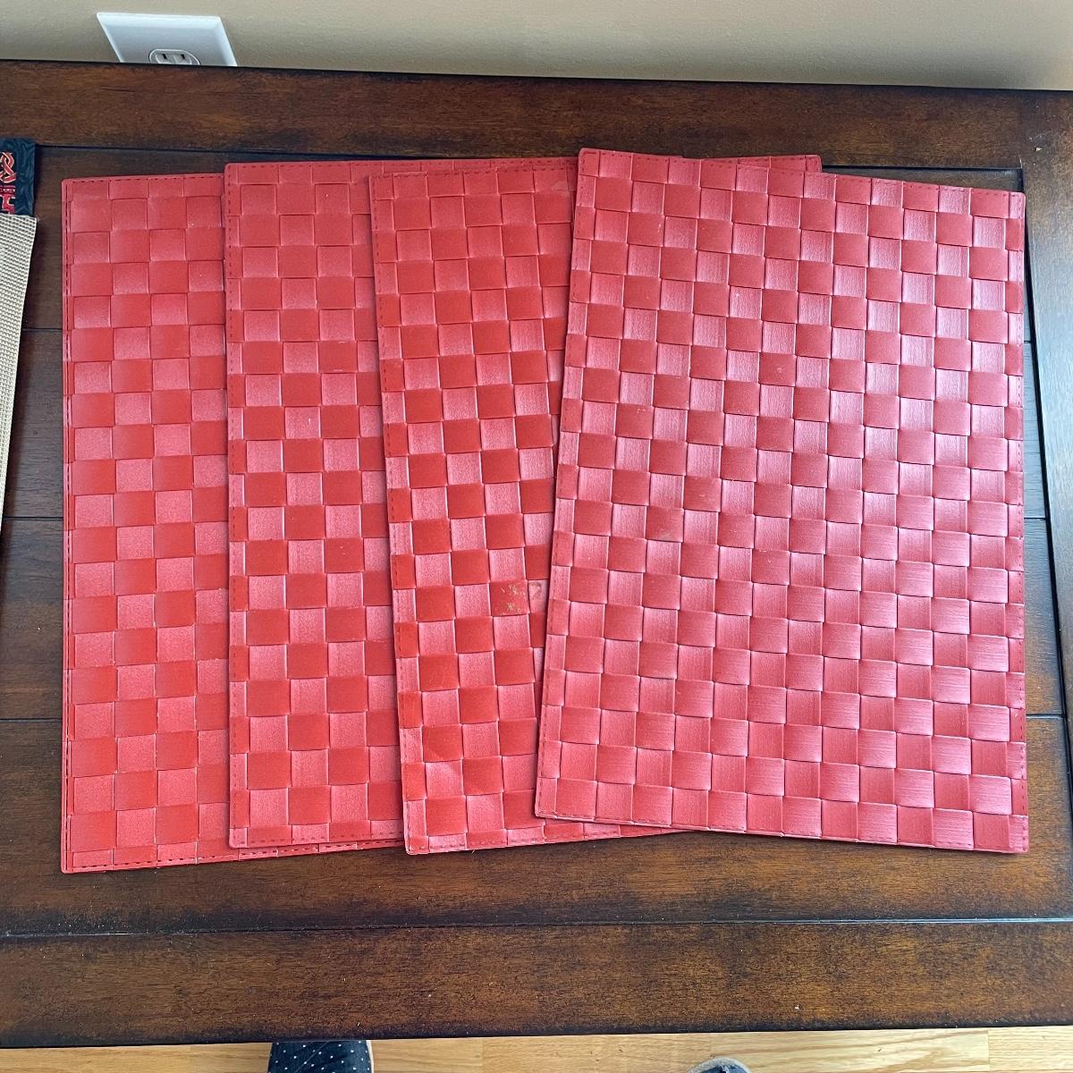 Four 13”d wooden chargers with a 9”d inner basin. Two woven 9” trivets, a 23” x 15” reversible holiday/everyday runner, and a variety of placemats. See images. Local pick up only.