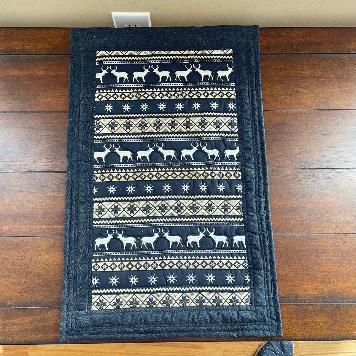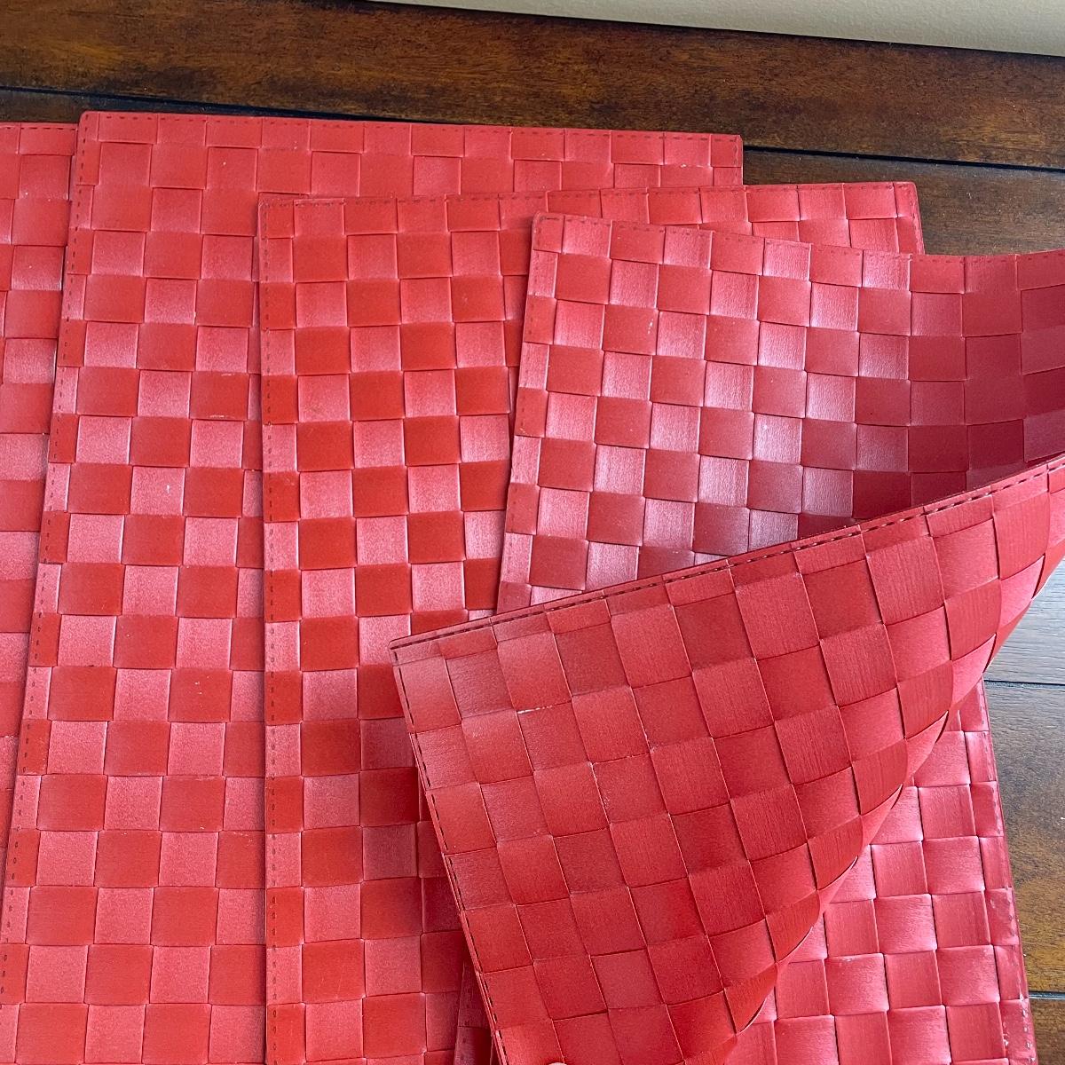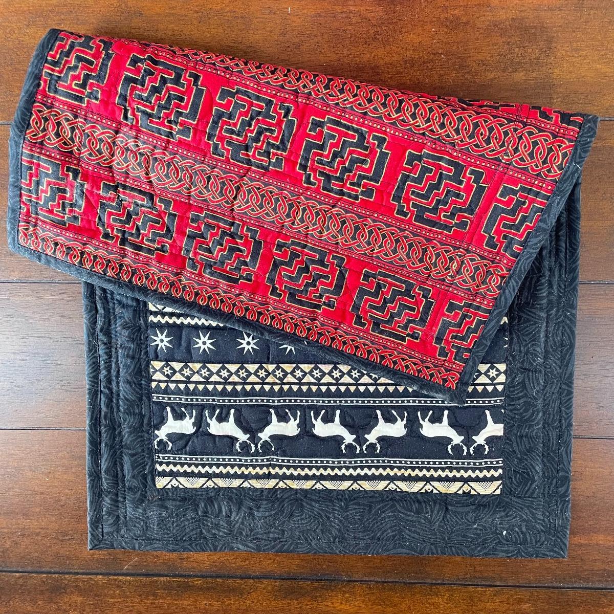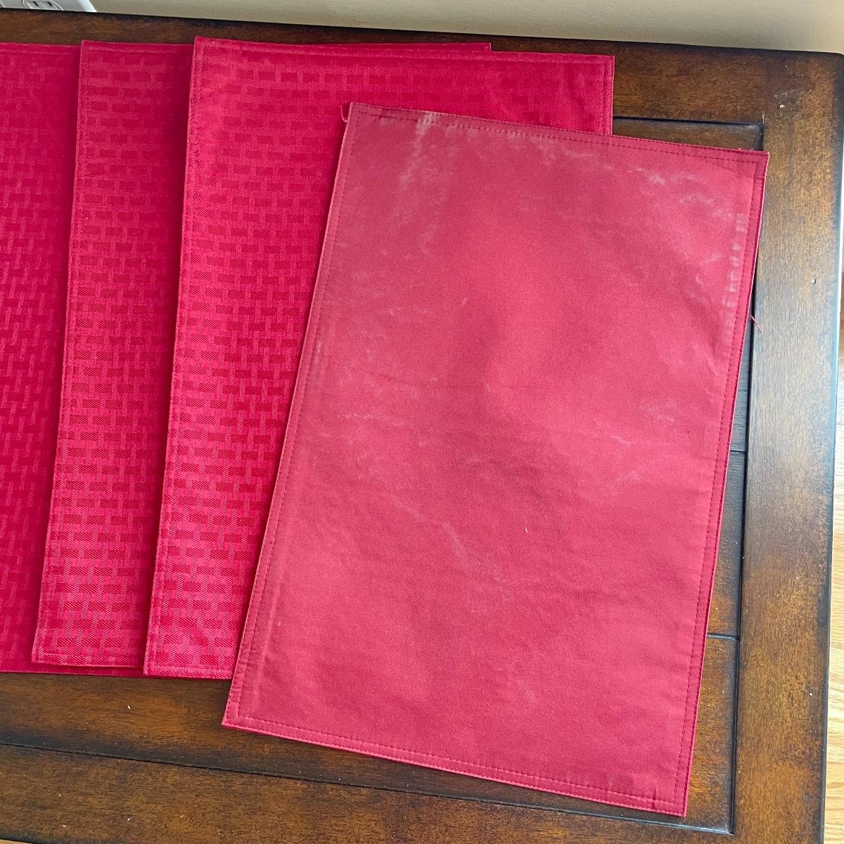 Four 13”d wooden chargers with a 9”d inner basin. Two woven 9” trivets, a 23” x 15” reversible holiday/everyday runner, and a variety of placemats. See images. Local pick up only.