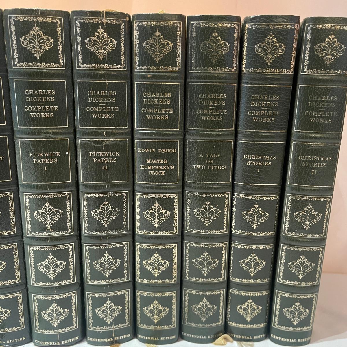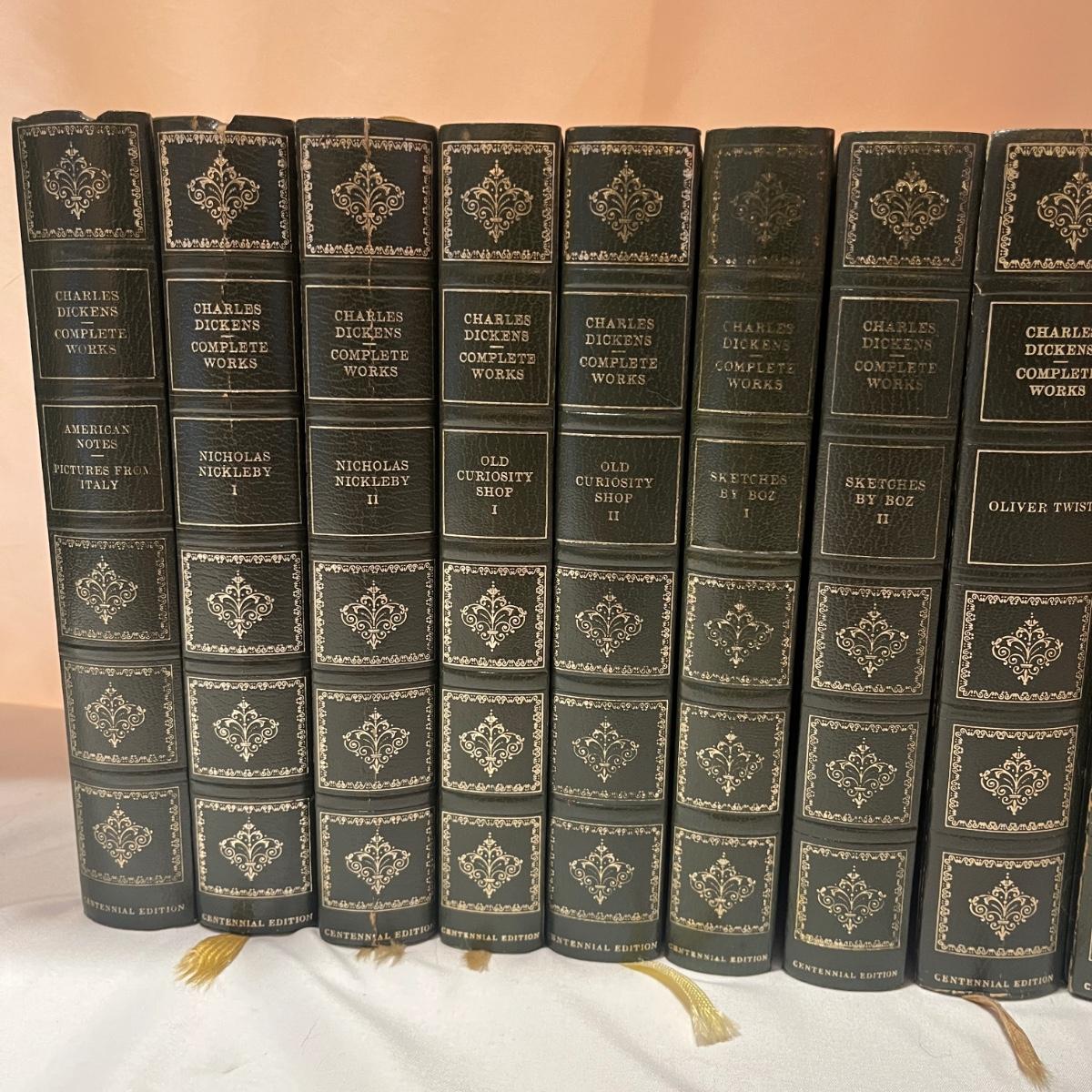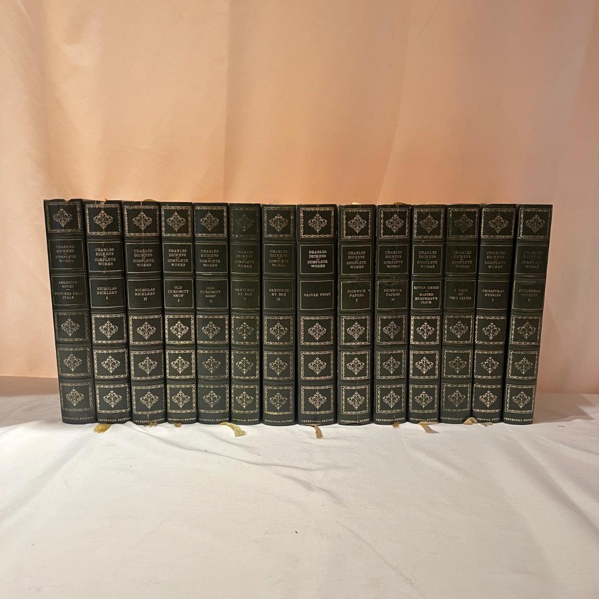 This Charles Dickens Centennial Edition book contains 14 books including Oliver Twist, American Notes, A Tale of Two Cities, Pickwick Papers & More. Each book measures 5” x 1.5” x 8”H. A few books have spotting on the tops, see pictures for other conditions including binding.