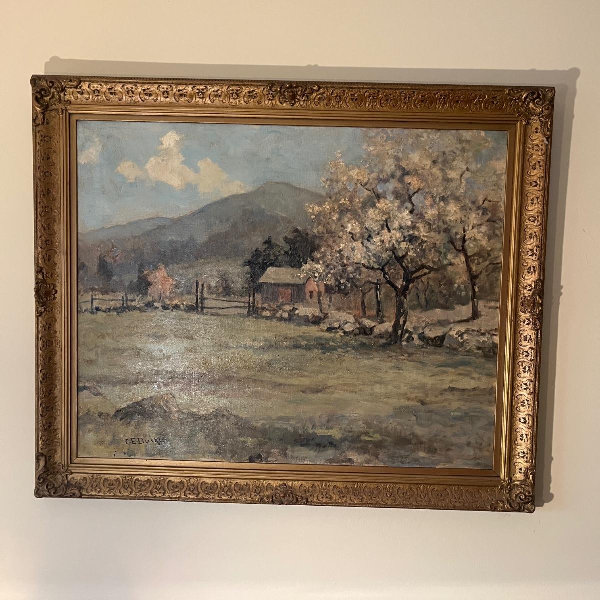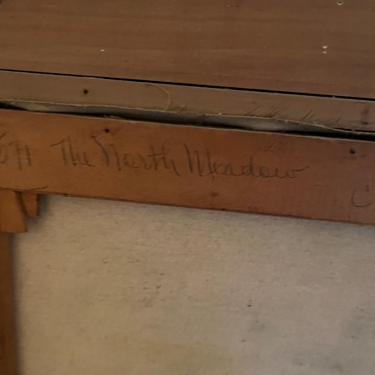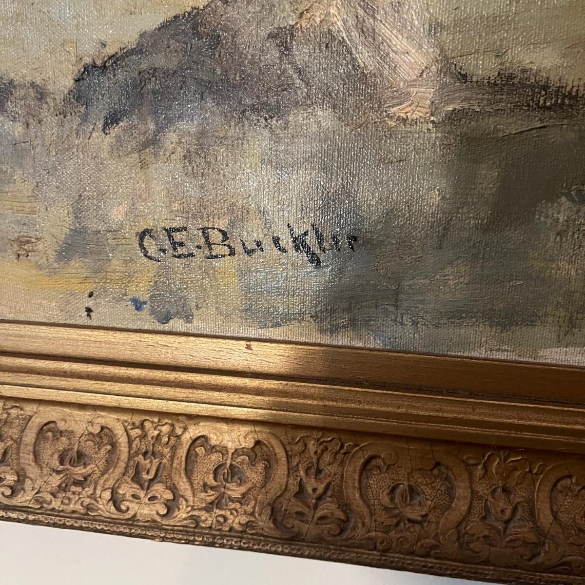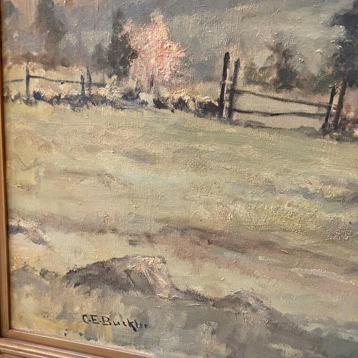 This signed C.E. Buckler (likely Charles E. Buckler) oil painting is titled The North Meadow and is framed in an ornate wooden frame. Frame measures 35” x 29.5”H.