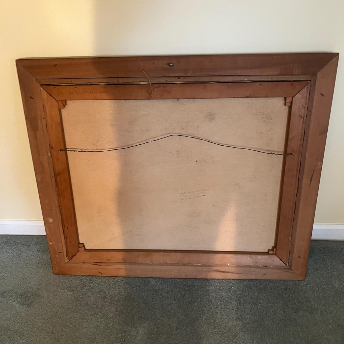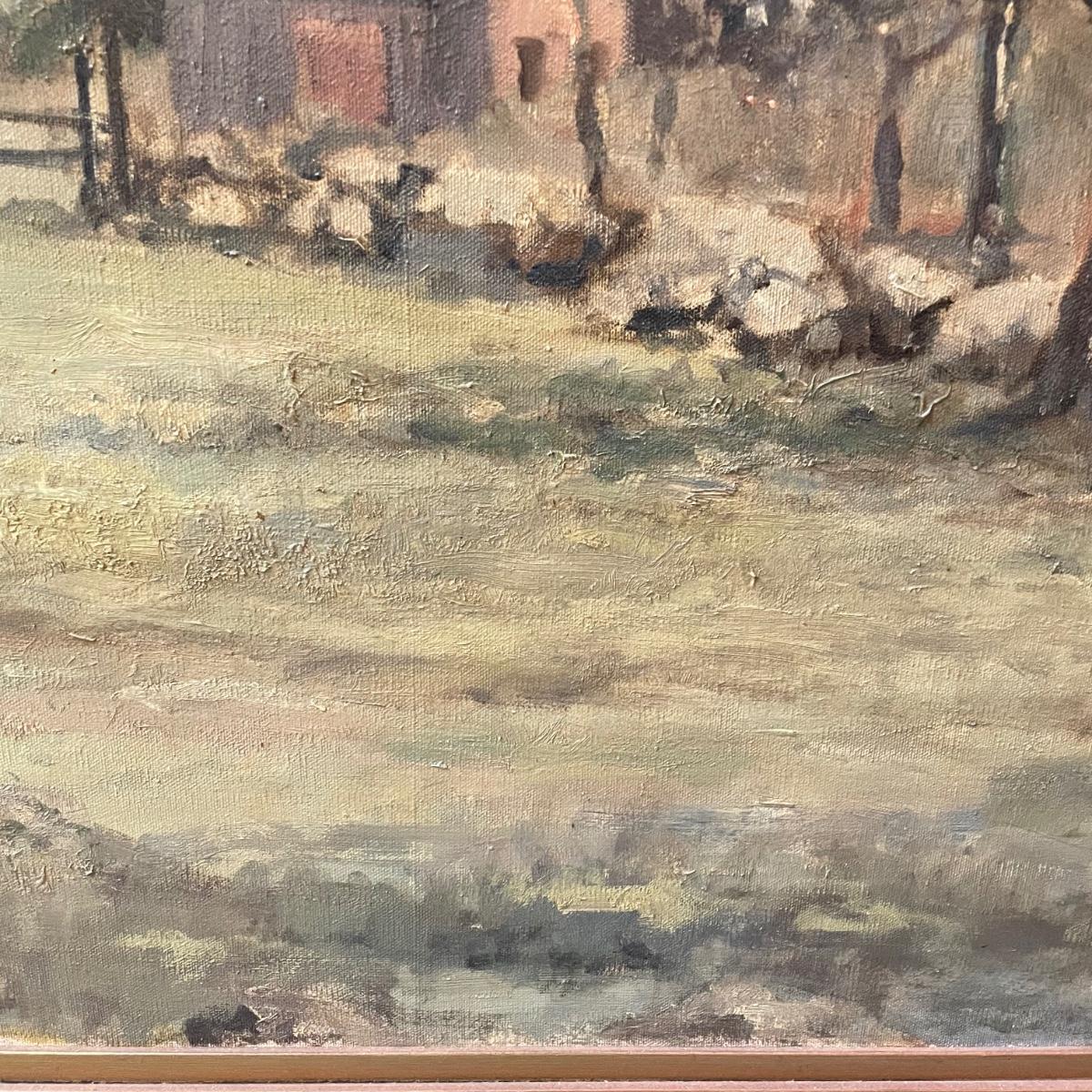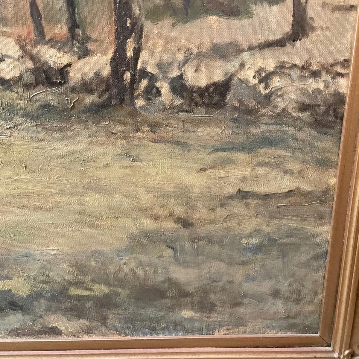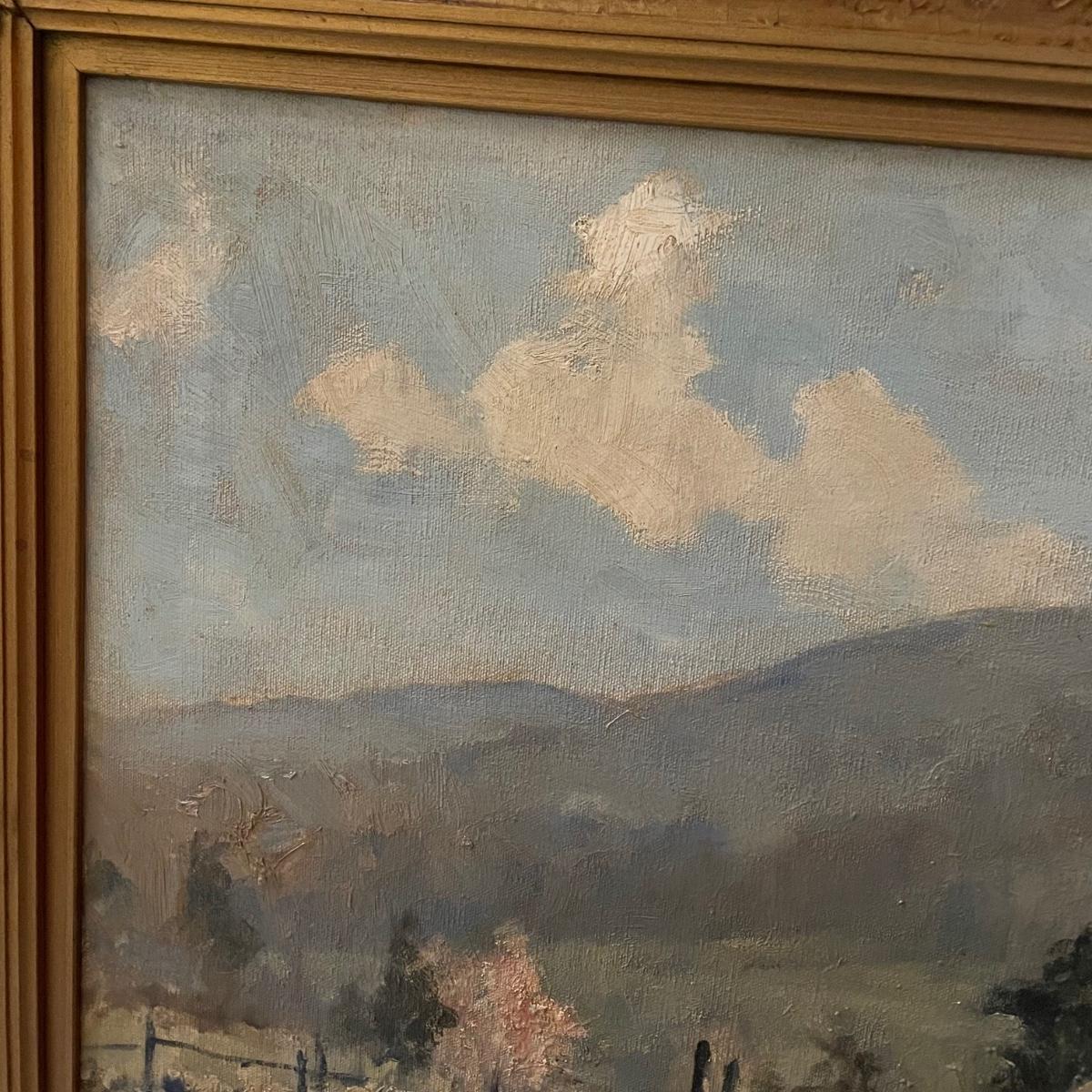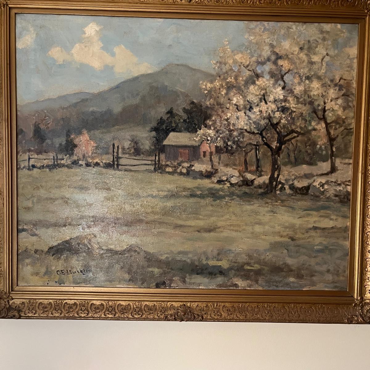 This signed C.E. Buckler (likely Charles E. Buckler) oil painting is titled The North Meadow and is framed in an ornate wooden frame. Frame measures 35” x 29.5”H.