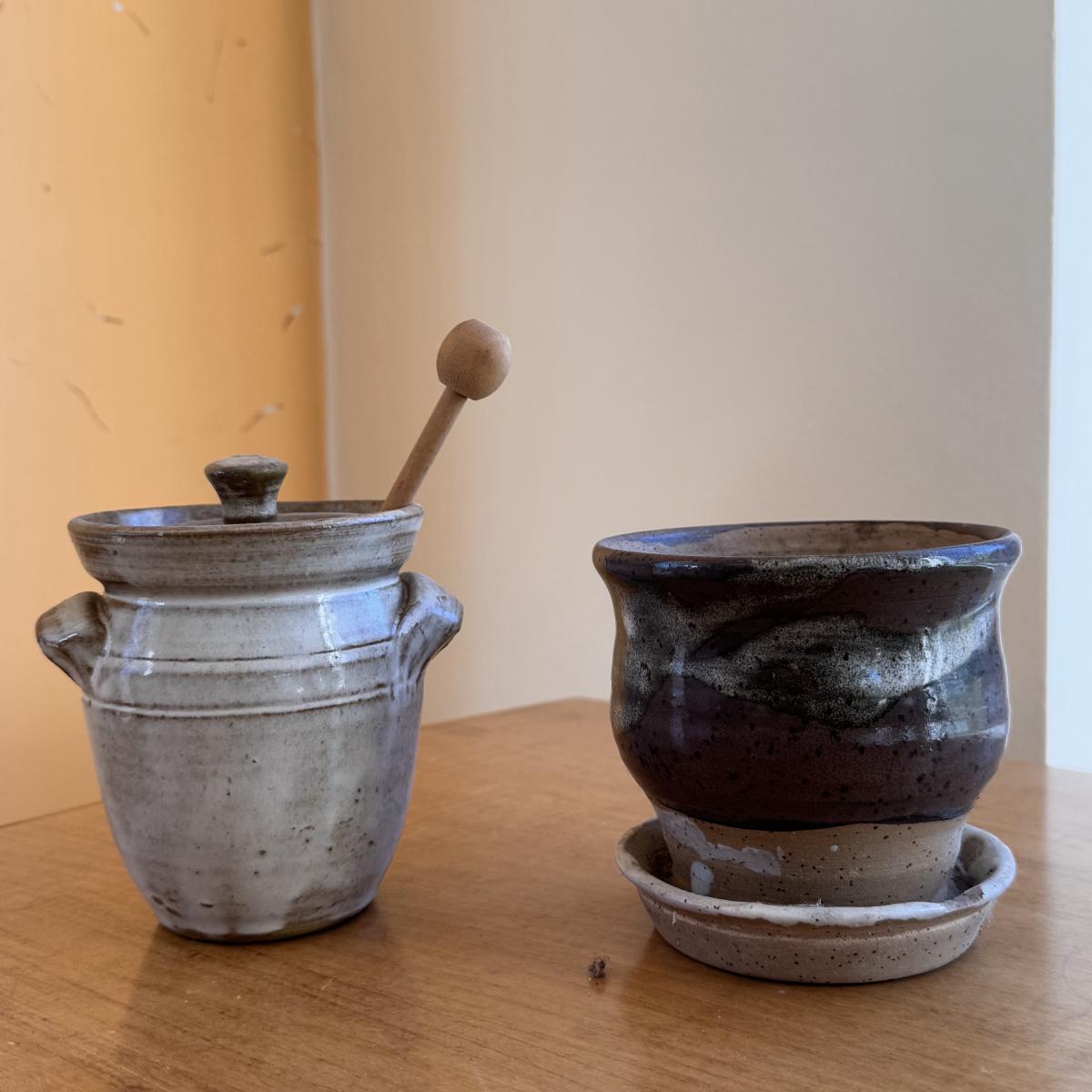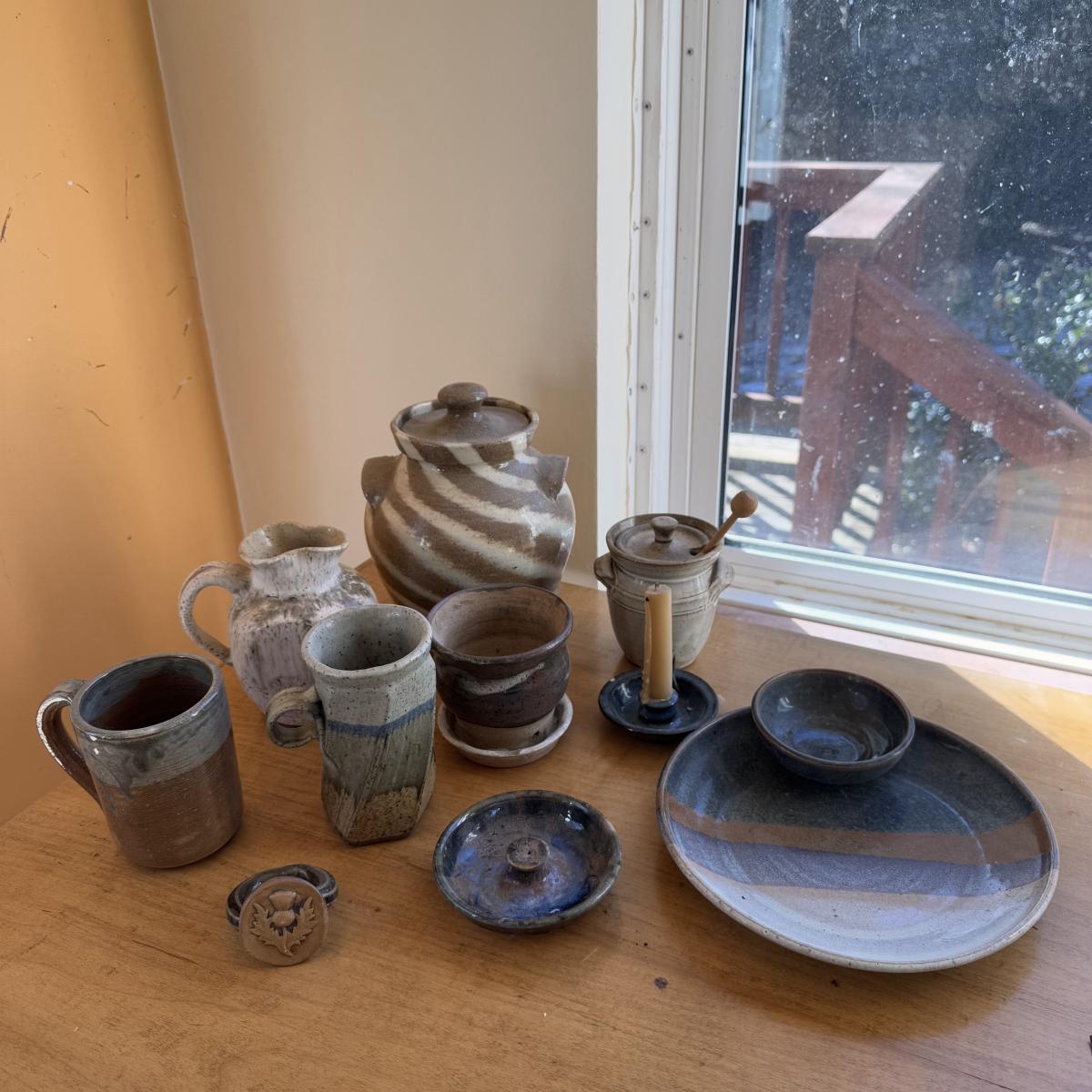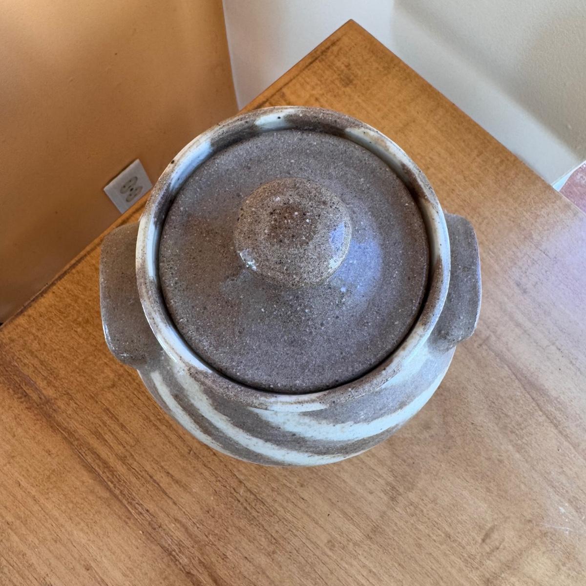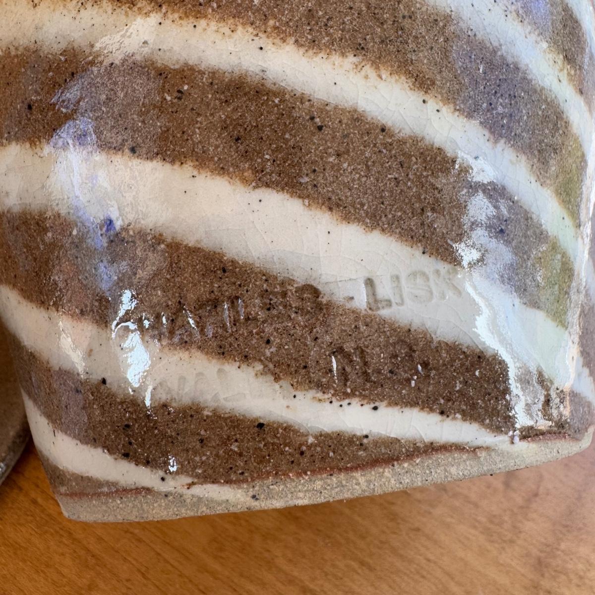 This lot includes ten pieces (not including lids) of earth-toned pottery. You’ll find a beautiful lidded ceramic jar signed by Charles Lisk, three mugs, one honey jar with lid and wooden stirrer, one small planter, one chip and dip serving platter, one incense holder, one candle holder, and one napkin ring. The planter has an attached base with a drainage hole on the side. The serving platter is the largest item that measures 9.95” x 9” x 1.95”H. All items appear to be signed or stamped. Shipping available.