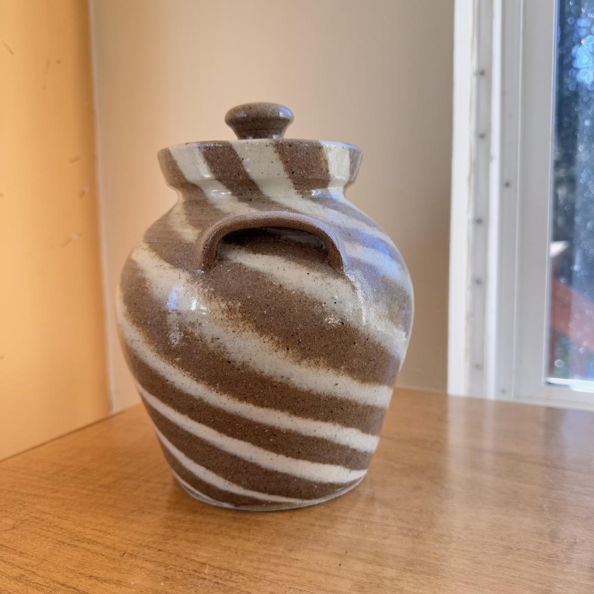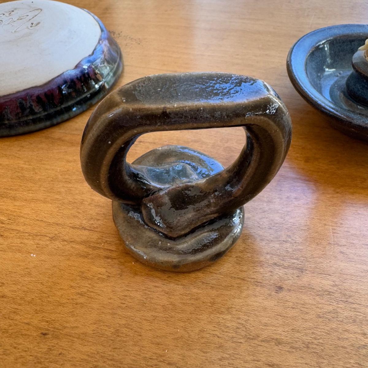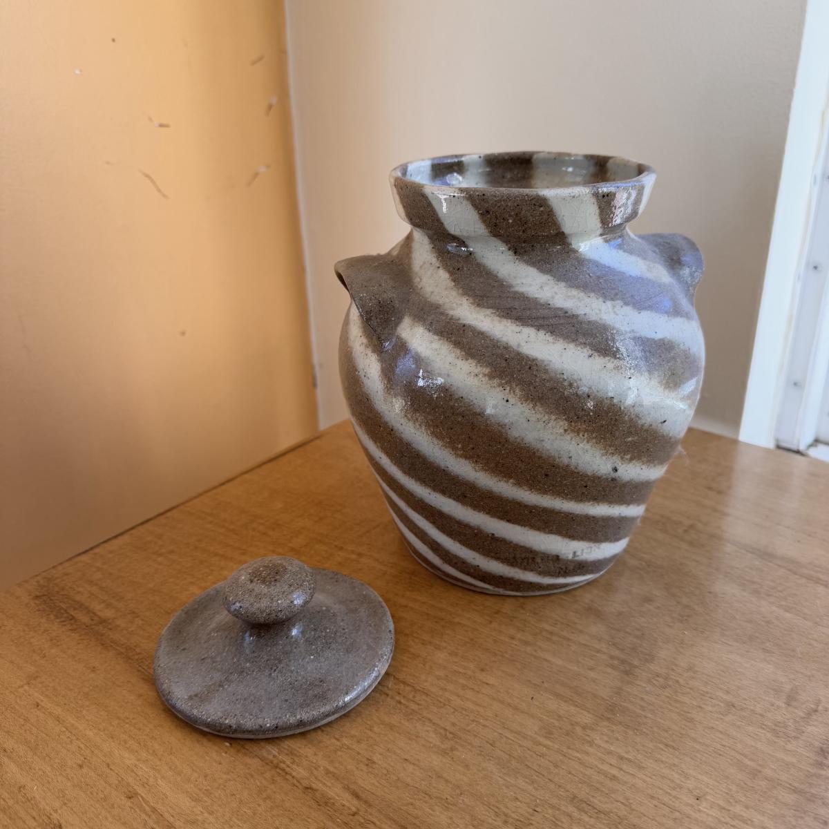 This lot includes ten pieces (not including lids) of earth-toned pottery. You’ll find a beautiful lidded ceramic jar signed by Charles Lisk, three mugs, one honey jar with lid and wooden stirrer, one small planter, one chip and dip serving platter, one incense holder, one candle holder, and one napkin ring. The planter has an attached base with a drainage hole on the side. The serving platter is the largest item that measures 9.95” x 9” x 1.95”H. All items appear to be signed or stamped. Shipping available.