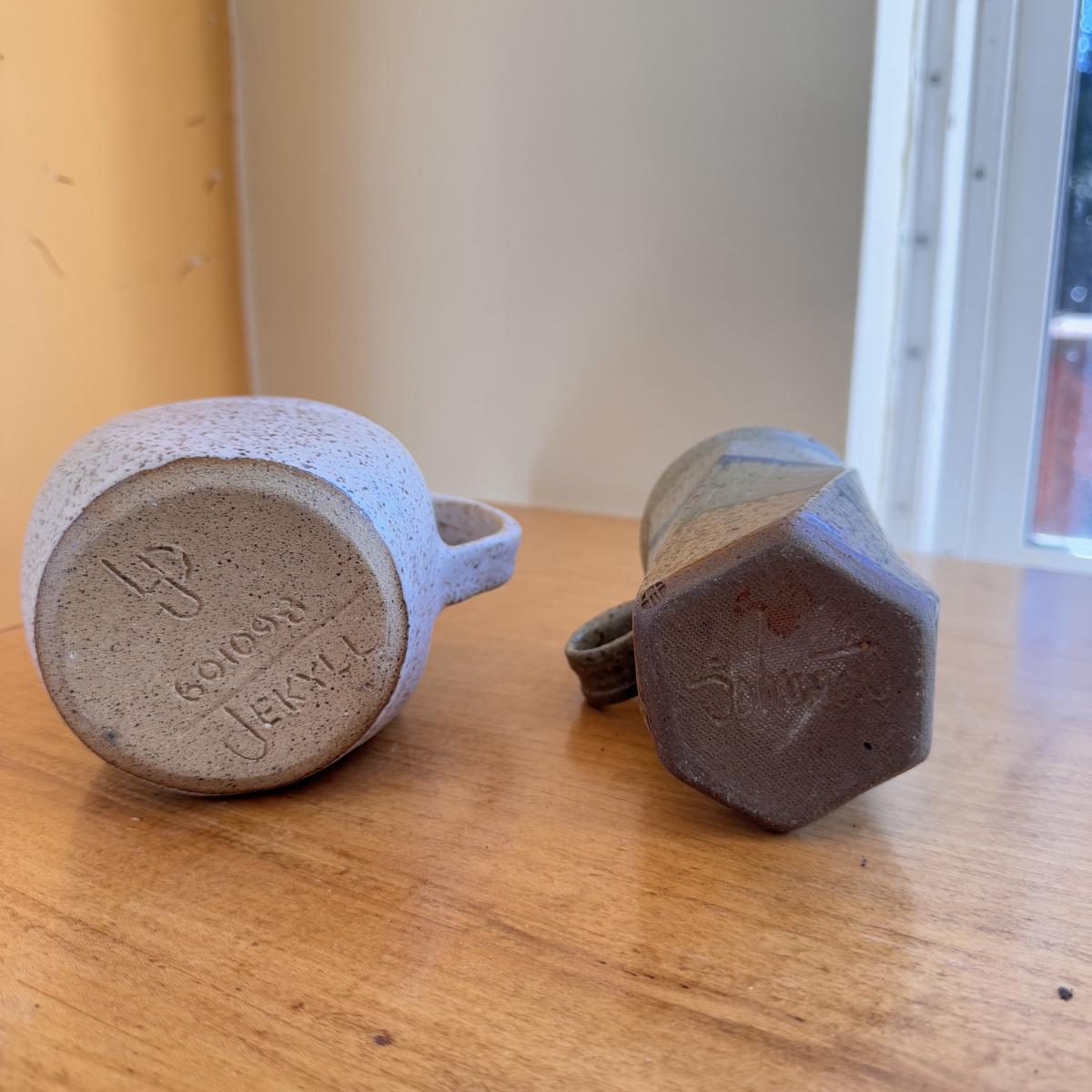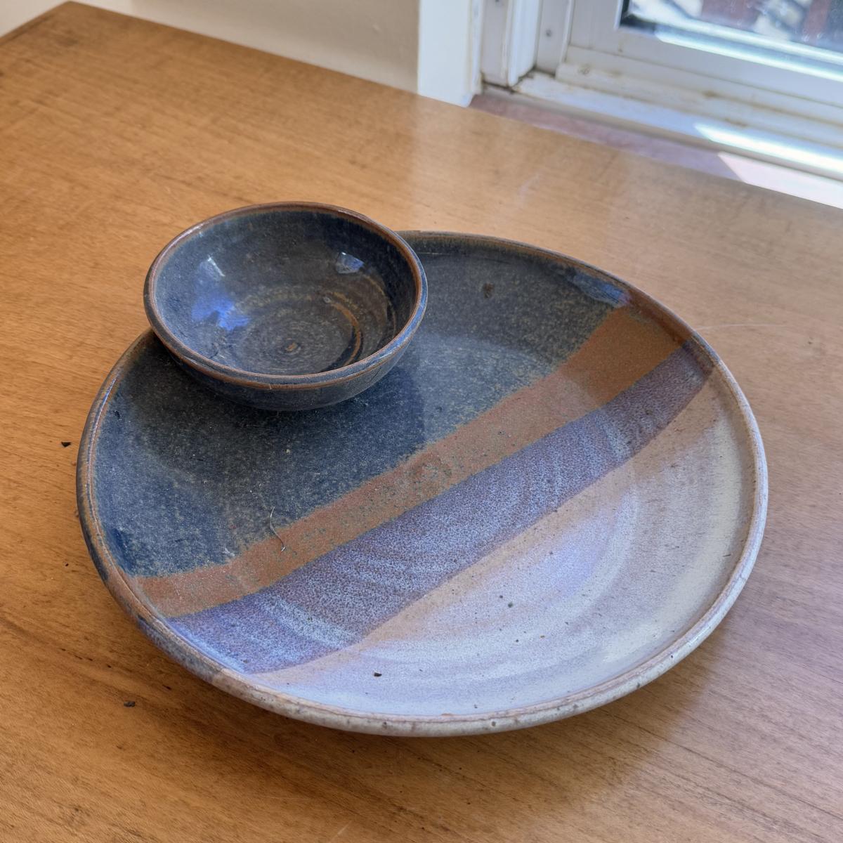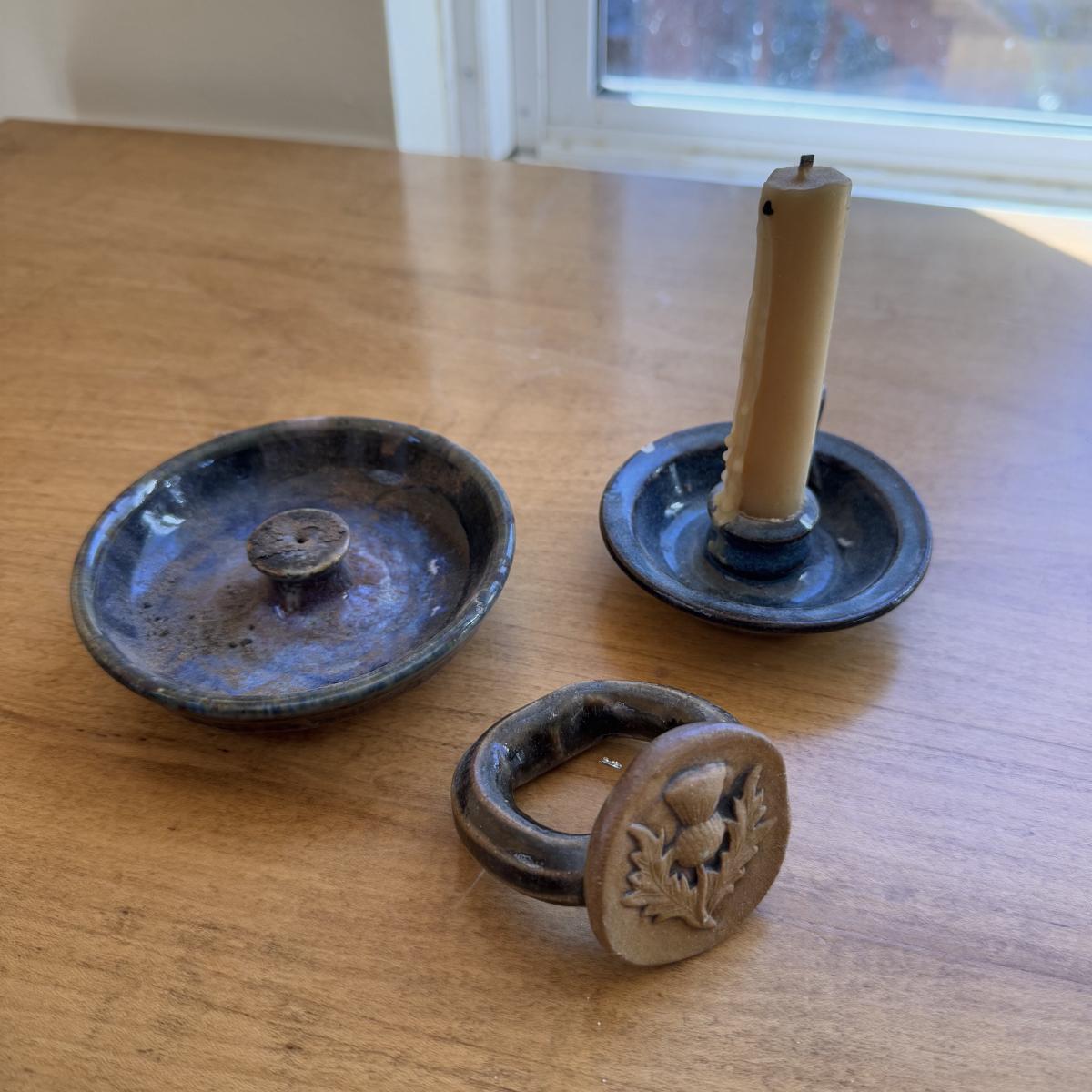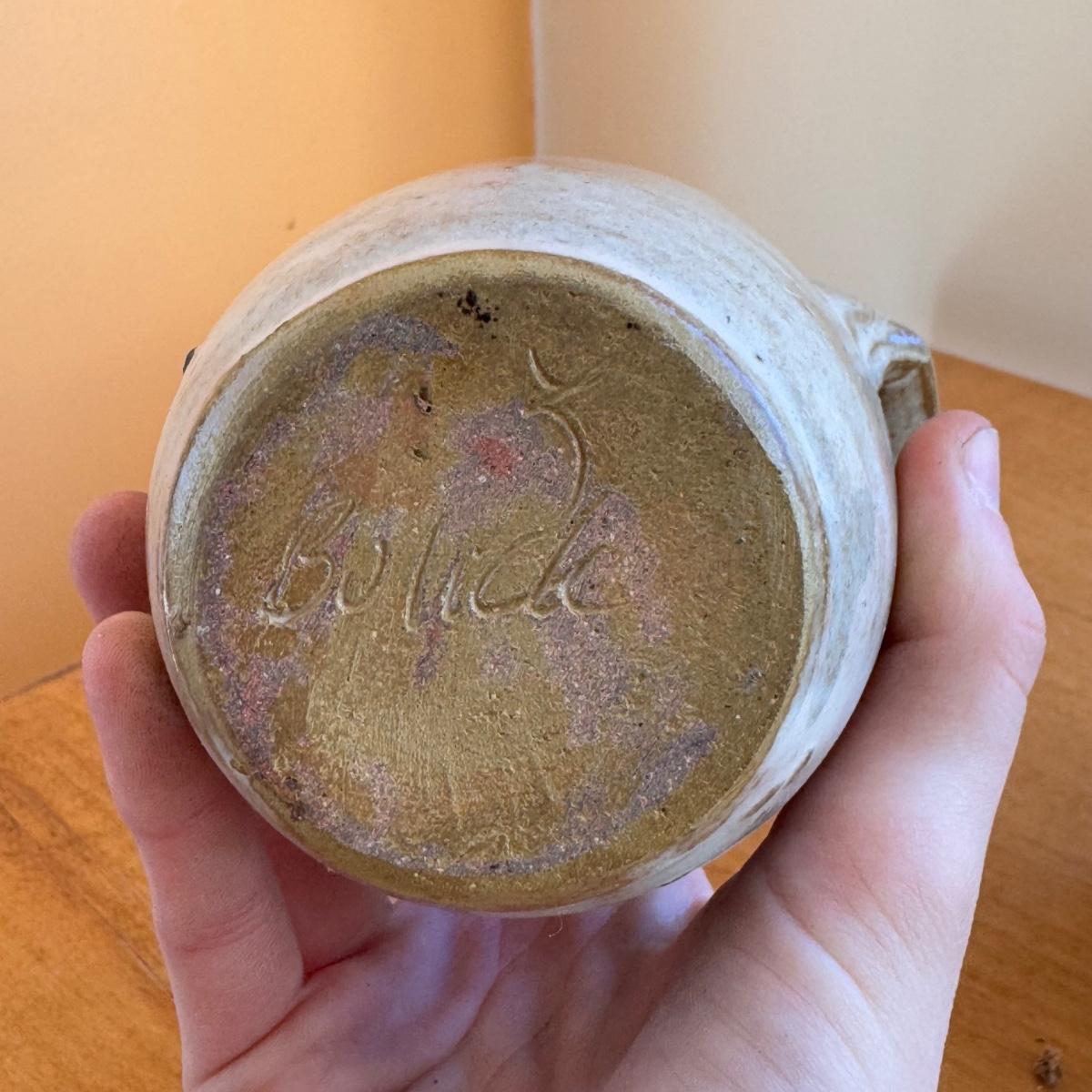This lot includes ten pieces (not including lids) of earth-toned pottery. You’ll find a beautiful lidded ceramic jar signed by Charles Lisk, three mugs, one honey jar with lid and wooden stirrer, one small planter, one chip and dip serving platter, one incense holder, one candle holder, and one napkin ring. The planter has an attached base with a drainage hole on the side. The serving platter is the largest item that measures 9.95” x 9” x 1.95”H. All items appear to be signed or stamped. Shipping available.