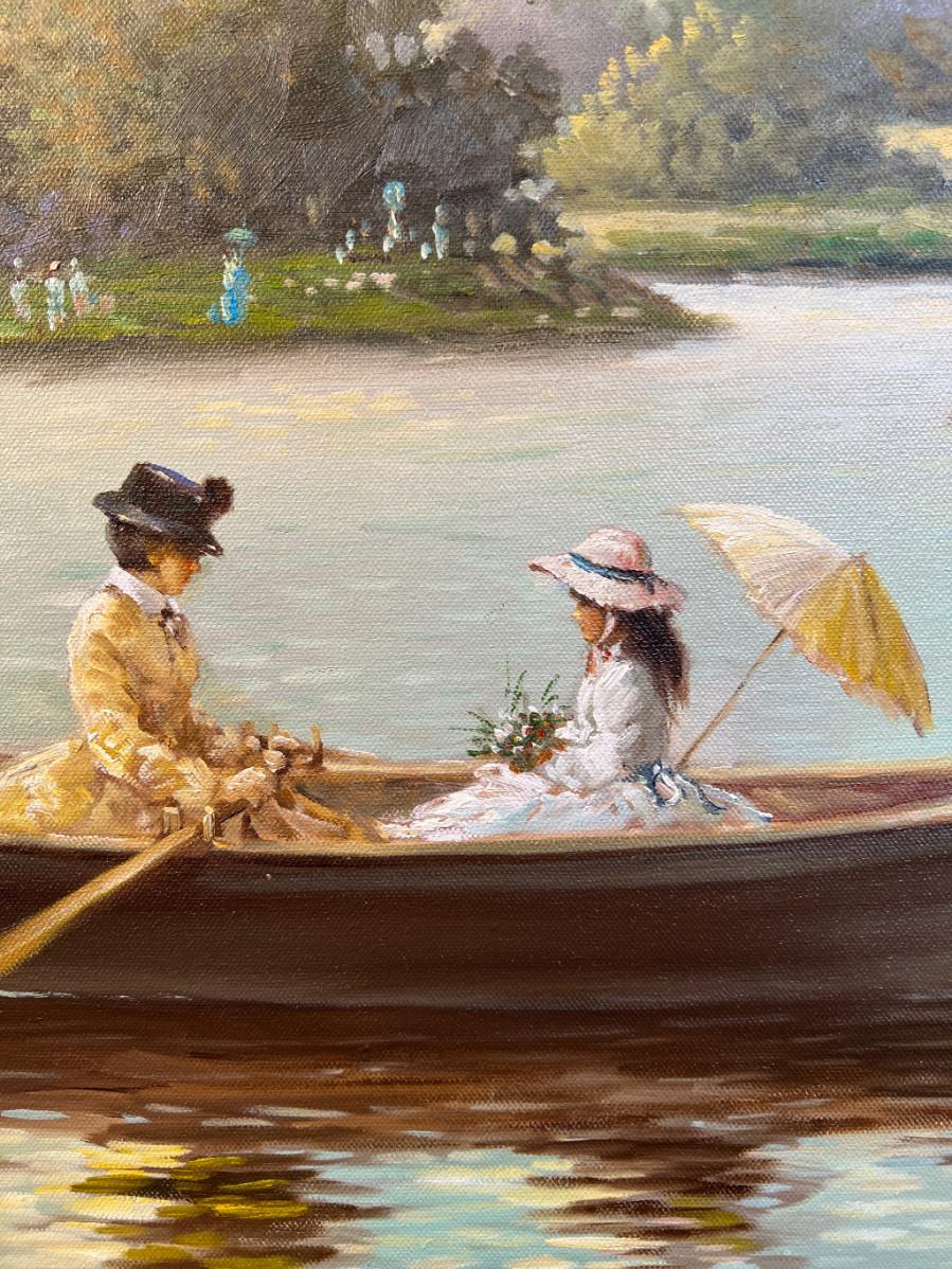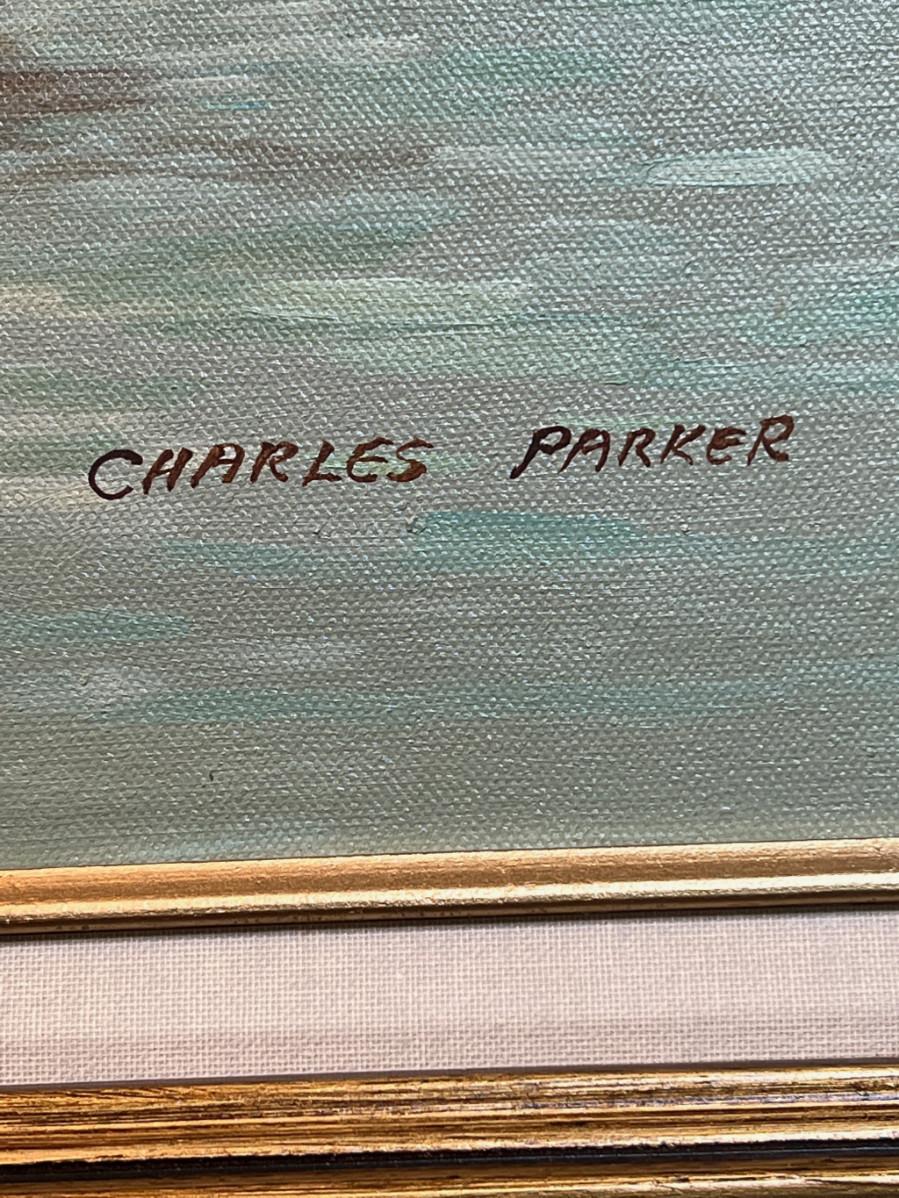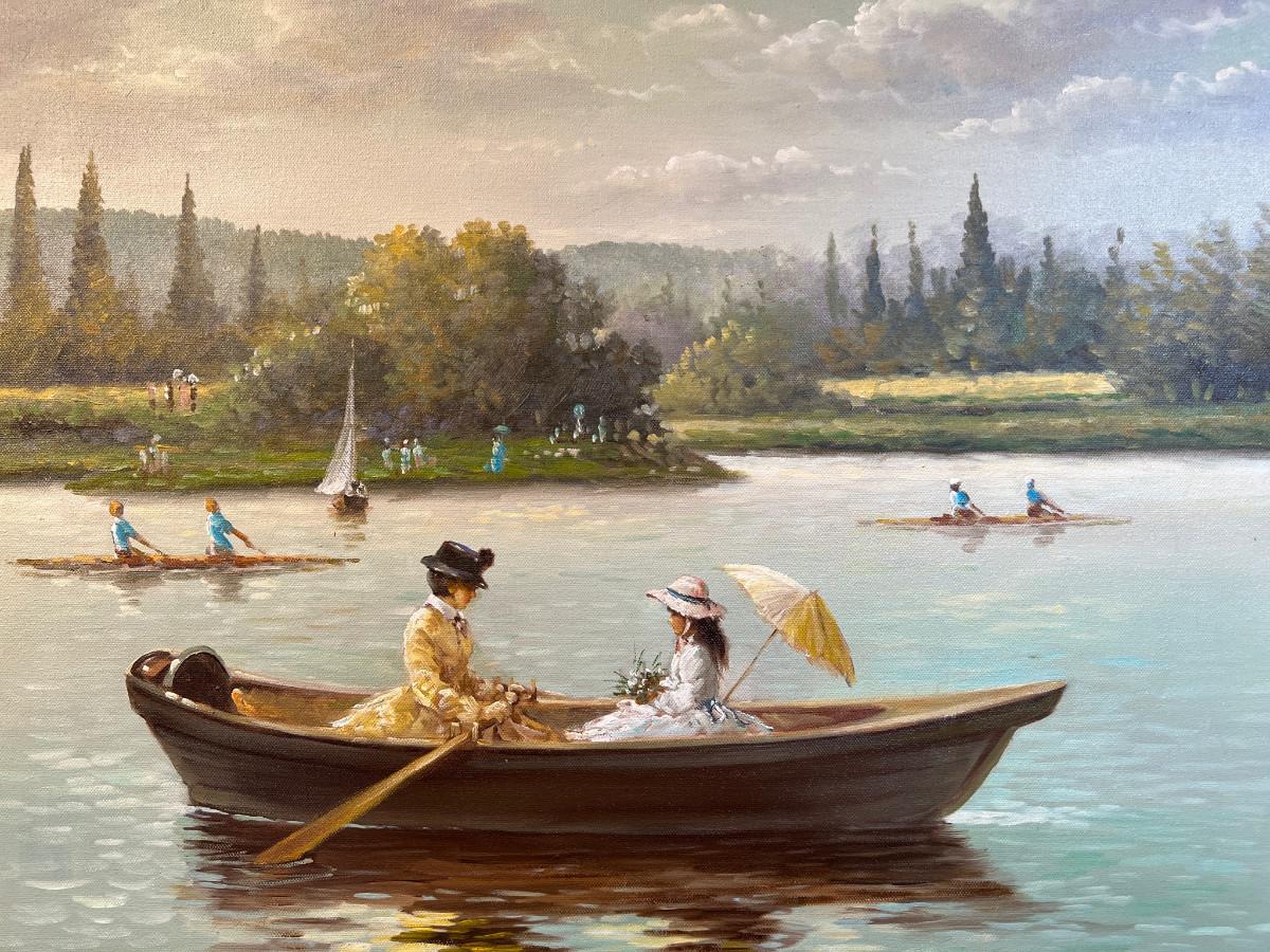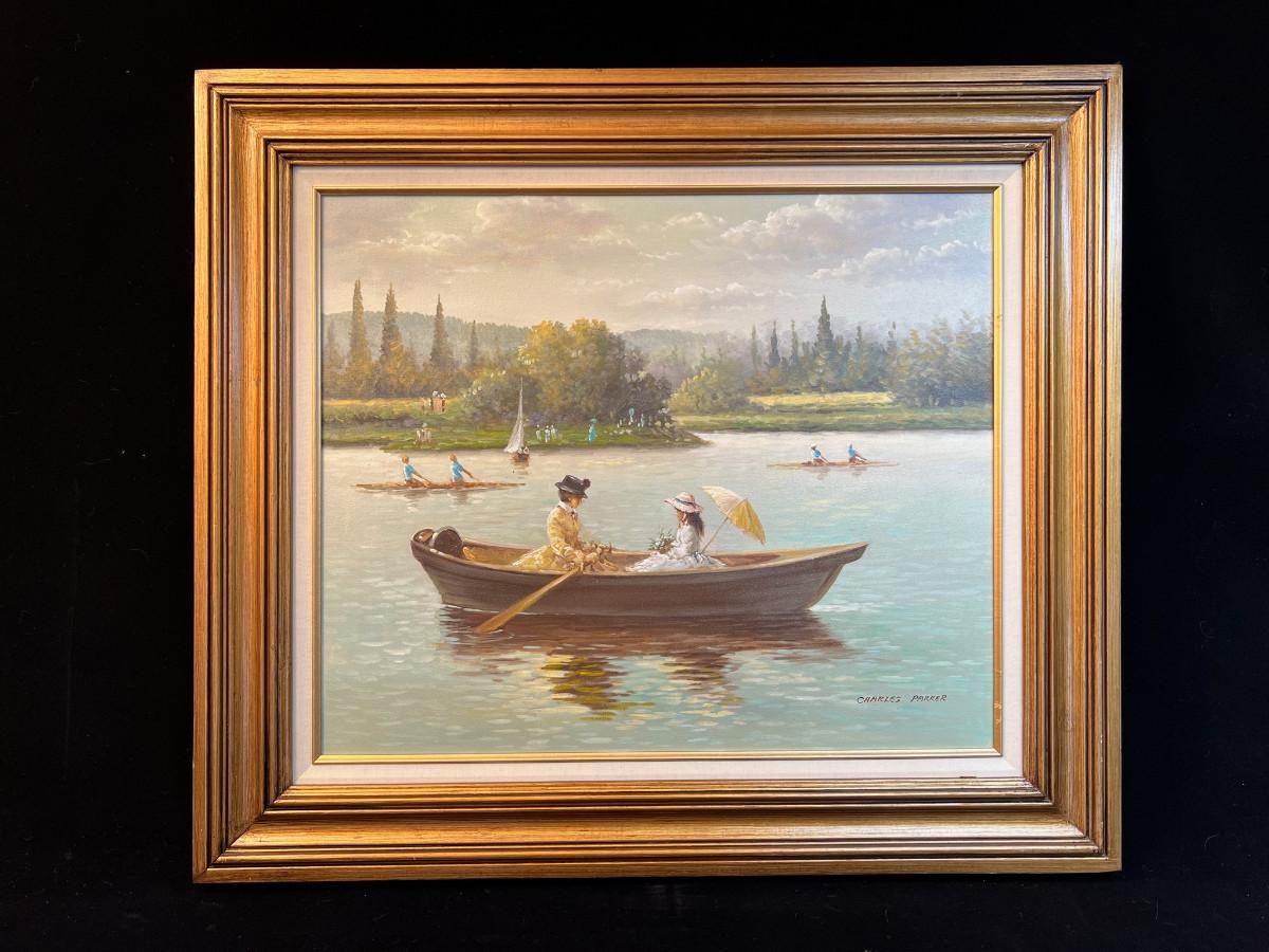 DESCRIPTION: The subject item is a landscape oil painting on stretched canvas by Charles Parker. The artist has rendered a mother & daughter casually rowing a boat on a large body of still water. The shore line is dotted with picnickers and others casually strolling and talking in the shade of mature trees.